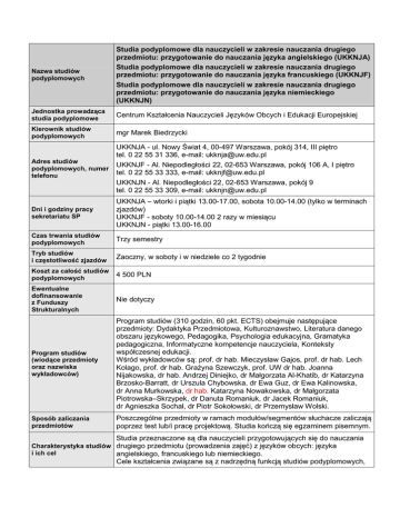 Nazwa studiów podyplomowych Studia podyplomowe dla nauczycieli w zakresie nauczania drugiego przedmiotu: przygotowanie do nauczania języka angielskiego (UKKNJA) Studia podyplomowe dla nauczycieli w zakresie nauczania drugiego przedmiotu: przygotowanie do nauczania języka francuskiego (UKKNJF) Studia podyplomowe dla nauczycieli w zakresie nauczania drugiego przedmiotu: przygotowanie do nauczania języka niemieckiego (UKKNJN) Jednostka prowadząca studia podyplomowe Centrum Kształcenia Nauczycieli Języków Obcych i Edukacji Europejskiej Kierownik studiów podyplomowych mgr Marek Biedrzycki Adres studiów podyplomowych, numer telefonu UKKNJA - ul. Nowy Świat 4, 00-497 Warszawa, pokój 314, III piętro tel. 0 22 55 31 336, e-mail: [email protected] UKKNJF - Al. Niepodległości 22, 02-653 Warszawa, pokój 106 A, I piętro tel. 0 22 55 33 333, e-mail: [email protected] UKKNJN - Al. Niepodległości 22, 02-653 Warszawa, pokój 9 tel. 0 22 55 33 309, e-mail: [email protected] Dni i godziny pracy sekretariatu SP UKKNJA – wtorki i piątki 13.00-17.00, sobota 10.00-14.00 (tylko w terminach zjazdów) UKKNJF - soboty 10.00-14.00 2 razy w miesiącu UKKNJN - piątki 13.00-16.00 Czas trwania studiów podyplomowych Trzy semestry Tryb studiów i częstotliwość zjazdów Zaoczny, w soboty i w niedziele co 2 tygodnie Koszt za całość studiów podyplomowych 4 500 PLN Ewentualne dofinansowanie z Funduszy Strukturalnych Nie dotyczy Program studiów (wiodące przedmioty oraz nazwiska wykładowców) Program studiów (310 godzin, 60 pkt. ECTS) obejmuje następujące przedmioty: Dydaktyka Przedmiotowa, Kulturoznawstwo, Literatura danego obszaru językowego, Pedagogika, Psychologia edukacyjna, Gramatyka pedagogiczna, Informatyczne kompetencje nauczyciela, Konteksty współczesnej edukacji. Wśród wykładowców są: prof. dr hab. Mieczysław Gajos, prof. dr hab. Lech Kolago, prof. dr hab. Grażyna Szewczyk, prof. UW dr hab. Joanna Nijakowska, dr hab. Andrzej Diniejko, dr Małgorzata Al-Khatib, dr Katarzyna Brzosko-Barratt, dr Urszula Chybowska, dr Ewa Guz, dr Ewa Kalinowska, dr Anna Murkowska, dr hab. Katarzyna Nowakowska, dr Małgorzata Piotrowska–Skrzypek, dr Danuta Romaniuk, dr Jacek Romaniuk, dr Agnieszka Sochal, dr Piotr Sokołowski, dr Przemysław Wolski. Sposób zaliczania przedmiotów Poszczególne przedmioty w ramach modułów/segmentów słuchacze zaliczają poprzez test lub/i pracę projektową. Studia kończą się egzaminem pisemnym. Studia przeznaczone są dla nauczycieli przygotowujących się do nauczania Charakterystyka studiów drugiego przedmiotu (prowadzenia zajęć) z języków obcych: języka i ich cel angielskiego, francuskiego lub niemieckiego. Cele kształcenia związane są z nadrzędną funkcją studiów podyplomowych, jaką jest umożliwienie słuchaczom - tj. nauczycielom przedmiotu głównego zdobycia zarówno kompetencji, jak i formalnie uznawanych kwalifikacji uprawniających do nauczania drugiego przedmiotu (rodzaju zajęć) - tj. wykonywania zawodu nauczyciela języka obcego (angielskiego, francuskiego lub niemieckiego) na wszystkich czterech szkolnych etapach edukacyjnych polskiego systemu szkolnictwa. Sylwetka absolwenta Absolwent studiów powinien być przygotowany do kompleksowej realizacji dydaktycznych, wychowawczych i opiekuńczych zadań szkoły na wszystkich etapach edukacyjnych. W związku z tym powinien posiadać przygotowanie: - w zakresie danej specjalności nauczycielskiej tak aby w sposób kompetentny przekazywać nabytą wiedzę oraz samodzielnie ją pogłębiać i aktualizować, - w zakresie psychologii i pedagogiki tak aby wspierać wszechstronny rozwój uczniów i współpracować z innymi nauczycielami i rodzicami, - w zakresie dydaktyki przedmiotowej tak aby skutecznie prowadzić zajęcia, rozbudzać zainteresowania poznawcze i rozwój intelektualny uczniów, - w zakresie posługiwania się technologią informacyjną i wykorzystywania jej w nauczaniu przedmiotu. Powinien także być przygotowany: - do współpracy z uczniami i nauczycielami i środowiskiem rodzinnym ucznia, - podejmowania zadań edukacyjnych wykraczających poza zakres nauczania drugiego przedmiotu, - weryfikowania własnych działań i upowszechniania dobrej praktyki pedagogicznej, - kierowania własnym rozwojem zawodowym, - posługiwania się przepisami prawa dotyczącego systemu oświaty oraz statusu zawodowego nauczycieli. Wymagany od absolwenta poziom języka obcego warunkujący pełne kwalifikacje to co najmniej C1 ESOKJ. Rekrutacja: dwa razy w roku akademickim (styczeń, wrzesień) Wszystkie wymagane dokumenty Podanie o przyjęcie na studia (druk do pobrania w sekretariacie oraz na stronach internetowych poszczególnych Kolegiów), życiorys, 1 zdjęcie, odpis dyplomu ukończenia studiów II stopnia oraz jego kserokopia, kserokopia certyfikatu potwierdzającego znajomość języka angielskiego, francuskiego lub niemieckiego oraz oryginał do wglądu, kserokopia dowodu osobistego oraz oryginał do wglądu. Wymagany poziom znajomości języka obcego warunkujący przyjęcie na studia podyplomowe: co najmniej B2 według Europejskiego Systemu Opisu Kształcenia Językowego (ESOKJ) Osoby ze znajomością języka obcego, które nie posiadają certyfikatu obowiązuje rozmowa kwalifikacyjna potwierdzająca ich biegłość językową. Jednocześnie kandydatom rekomenduje się przystąpienie do kursu danego języka obcego organizowanego przez Szkołę Języków Obcych UW przygotowującego do egzaminów certyfikacyjnych na poziomie C1. Szczegółowa lista świadectw potwierdzających znajomość języka obcego uznawanych przez MEN, patrz: załącznik do Rozporzadzenia MEN z dnia 17 kwietnia 2012 r. (Dz.U. 2012 poz. 426). Termin składania dokumentów Od 1 do 19 września 2015 r. - semestr zimowy Od 11 do 30 stycznia 2016 r. - semestr letni Termin rozpoczęcia Październik 2015 r. studiów Luty 2016 r. Limit miejsc 30 Sylwetka kandydata Kandydat ubiegający się o przyjęcie na studia p