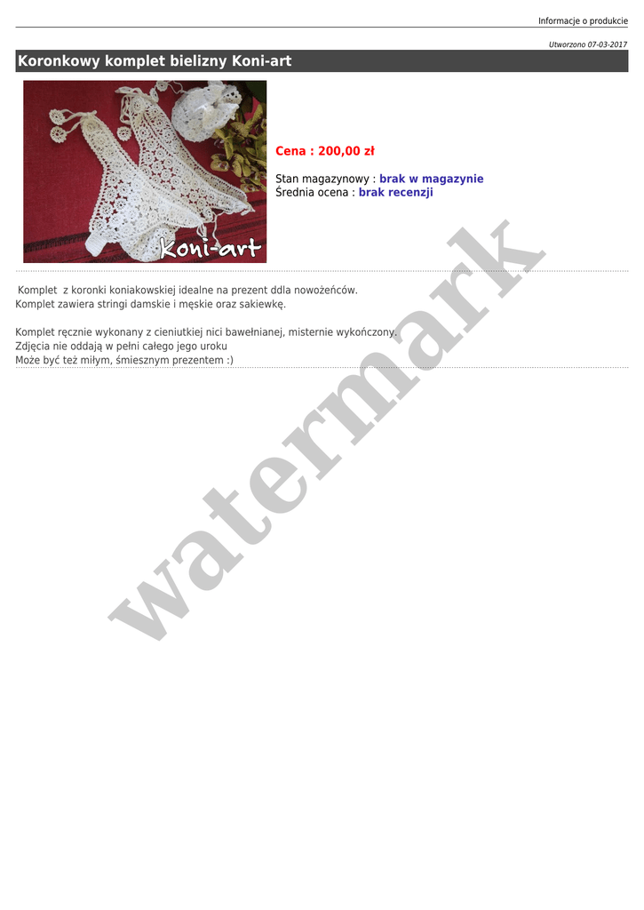 Informacje o produkcie Utworzono 07-03-2017 Koronkowy komplet bielizny Koni-art Cena : 200,00 zł er m ar k Stan magazynowy : brak w magazynie Średnia ocena : brak recenzji Komplet z koronki koniakowskiej idealne na prezent ddla nowożeńców. Komplet zawiera stringi damskie i męskie oraz sakiewkę. w at Komplet ręcznie wykonany z cieniutkiej nici bawełnianej, misternie wykończony. Zdjęcia nie oddają w pełni całego jego uroku Może być też miłym, śmiesznym prezentem :)