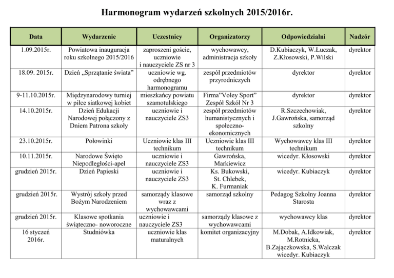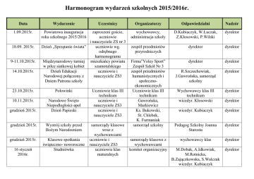 Harmonogram wydarzeń szkolnych 2015/2016r. Data Wydarzenie 1.09.2015r. Powiatowa inauguracja roku szkolnego 2015/2016 18.09. 2015r. 9-11.10.2015r. 14.10.2015r. zaproszeni goście, uczniowie i nauczyciele ZS nr 3 Dzień „Sprzątanie świata” uczniowie wg. odrębnego harmonogramu Międzynarodowy turniej mieszkańcy powiatu w piłce siatkowej kobiet szamotulskiego Dzień Edukacji uczniowie i Narodowej połączony z nauczyciele ZS3 Dniem Patrona szkoły 23.10.2015r. Połowinki 10.11.2015r. Narodowe Święto Niepodległości-apel Dzień Papieski grudzień 2015r. grudzień 2015r. Wystrój szkoły przed Bożym Narodzeniem grudzień 2015r. Klasowe spotkania świąteczno- noworoczne Studniówka 16 styczeń 2016r. Uczestnicy Uczniowie klas III technikum uczniowie i nauczyciele ZS3 uczniowie i nauczyciele ZS3 samorządy klasowe wraz z wychowawcami uczniowie i nauczyciele ZS3 uczniowie klas maturalnych Organizatorzy Odpowiedzialni Nadzór wychowawcy, administracja szkoły D.Kubiaczyk, W.Łuczak, Z.Kłosowski, P.Wilski dyrektor zespół przedmiotów przyrodniczych dyrektor dyrektor Firma”Voley Sport” Zespół Szkół Nr 3 zespół przedmiotów humanistycznych i społecznoekonomicznych Uczniowie klas III technikum Gawrońska, Markiewicz Ks. Bukowski, St. Chlebek, K. Furmaniak samorząd szkolny dyrektor dyrektor R.Szczechowiak, J.Gawrońska, samorząd szkolny dyrektor Wychowawcy klas III technikum wicedyr. Kłosowski dyrektor wicedyr. Kubiaczyk dyrektor Pedagog Szkolny Joanna Starosta dyrektor wychowawcy klas dyrektor M.Dobak, A.Idkowiak, M.Rotnicka, B.Zajączkowska, S.Walczak wicedyr. Kubiaczyk dyrektor samorządy klasowe z wychowawcami komitet organizacyjny dyrektor marzec 2016r. Rekolekcje nauczyciele religii wicedyr. Kubiaczyk dyrektor Powiatowe Targi Edukacji i Pracy uczniowie i nauczyciele ZS3 młodzież zaproszonych szkół marzec 2016r. nauczyciele , uczniowie wicedyr. Kłosowski dyrektor marzec 2016r. Drzwi otwarte dla gimnazjalistów młodzież zaproszonych szkół nauczyciele , uczniowie wicedyr. Kubiaczyk dyrektor kwiecień 2016r.(niedziela) Drzwi otwarte dla gimnazjalistów i ich rodziców Zakończenie roku szkolnego klas czwartych Technikum Dzień Sportu młodzież kończąca gimnazjum uczniowie i nauczyciele ZS3 Kierownik szkolenia Łuczak dyrektor uczniowie klas czwartych technikum uczniowie i nauczyciele ZS3 wszyscy uczniowie i nauczyciele ZS3 wychowawcy klas wicedyr. Kubiaczyk dyrektor nauczyciele wych. fizycznego wychowawcy klas B.Synowiec, M.Białasik dyrektor wicedyr. Kubiaczyk dyrektor 29.04. 2016r. czerwiec 2016r. 24.06 2016r. Zakończenie roku szkolnego 2014/2015