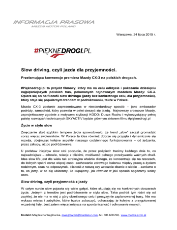 Warszawa, 24 lipca 2015 r. Slow driving, czyli jazda dla przyjemności. Przełamująca konwencje premiera Mazdy CX-3 na polskich drogach. #Pięknedrogi.pl to projekt filmowy, który ma na celu odkrycie i pokazanie dziesięciu najpiękniejszych polskich tras, pokonanych najnowszym modelem Mazdy: CX-3. Opiera się on na filozofii slow drivingu (jazdy bez konkretnego celu, dla przyjemności), który staje się popularnym trendem w podróżowaniu, także w Polsce. Mazda CX-3 zostanie zaprezentowana w niestandardowy sposób – jako ambasador podróży, samochód, który pozwala w pełni cieszyć się jazdą. Najnowszy crossover Mazdy, zaprojektowany zgodnie z motywem stylizacji KODO: Dusza Ruchu i wykorzystujący pełną paletę rozwiązań technicznych SKYACTIV będzie głównym aktorem filmu #pięknedrogi.pl Życie w stylu slow Zmęczenie zbyt szybkim tempem życia spowodowało, że trend „slow” zaczął gromadzić coraz więcej zwolenników. W Polsce ta idea również dobrze się przyjęła i dynamicznie się rozwija, obejmując kolejne aspekty naszego codziennego funkcjonowania – od jedzenia, przez zakupy, aż po podróżowanie. U podstaw inicjatyw slow stoi poczucie, że przez pośpiech tracimy każdego dnia to, co najważniejsze – zdrowie, relacje z bliskimi, możliwość pełnego przeżywania ważnych chwil. Idea slow life jest dla wielu tak atrakcyjna właśnie dlatego, że koncentruje się na rzeczach, do których tęskni coraz więcej osób: zachowanie zdrowego balansu między pracą a życiem rodzinnym, czas na odpoczynek, bliskość z naturą czy wreszcie dbanie o siebie – zarówno o to, co jemy, w co się ubieramy, ile kupujemy, jak również w jaki sposób spędzamy wolny czas. Slow driving, czyli przyjemność z jazdy W całym nurcie slow pojawia się wiele gałęzi, które skupiają się na konkretnych obszarach życia. Jednym z trendów jest podróżowanie w stylu slow. Taka podróż tym różni się od zwykłej, że nie ma w niej z góry określonego celu i precyzyjnie zaplanowanej trasy. Nie ma wykazu miejsc i zabytków, które trzeba zobaczyć, odhaczając je kolejno z przygotowanej wcześniej listy. Jest zatem więcej miejsca na spontaniczność i odkrywanie nowych, Kontakt: Magdalena Węglewska, [email protected], tel. 606 600 260, www.mazda-press.pl nieprzetartych szlaków. Z tego powodu coraz większą popularnością cieszy się slow driving, czyli jazda dla przyjemności, a nie tylko przemieszczanie się z punktu A do B. W przypadku slow drivingu jazda jest celem samym w sobie. Pasjonaci tej filozofii często wybierają trasy widokowe, by móc podziwiać pejzaże i cieszyć się bliskością natury. Nie spieszą się – gdy tylko zechcą, mogą się zatrzymać, podziwiać piękno przyrody, zjeść coś w miejscowej restauracji czy poznać bliżej lokalny koloryt miejsca, przez które właśnie przejeżdżają. Weekendowe wyjazdy Slow driving może być świetnym pomysłem na spędzenie inspirującego weekendowego wyjazdu, dającego możliwość odpoczynku po ciężkim tygodniu pracy – mówi Magdalena Węglewska, dyrektor PR Mazda Motor Poland. – Tym bardziej, że w Polsce jest naprawdę wiele miejsc czekających na odkrycie, wartych odwiedzenia, które nie znajdują się na standardowych szlakach turystycznych – dodaje. Piękne drogi w Polsce Z filozofii slow drivingu narodził się pomysł stworzenia projektu filmowego pod nazwą #pięknedrogi.pl. Ekipa, składająca się z pasjonatów życia slow, wyruszyła w Polskę w poszukiwaniu dziewięciu najpiękniejszych dróg, które będą filmowane głównie z dronów. – Efektem końcowym będzie krótki film, który pomoże nam pokazać polskie drogi w pozytywnym kontekście oraz uświadomić, że nasz kraj jest bogaty w piękne widokowe trasy, które warto przejechać – tłumaczy Magda Węglewska. – Oprócz tego chcemy zachęcić do czerpania przyjemności z jazdy i wypróbowania slow drivingu. Planowany jest również plebiscyt dla Internautów na wybór dziesiątej drogi. Do 31 sierpnia na stronie www.pieknedrogi.pl można zgłaszać swoje propozycje. Spośród nadesłanych pomysłów, jury wybierze jedną trasę, która zostanie sfilmowana i znajdzie się w końcowym materiale. Dodatkowo, osoba, która nadeśle zwycięską propozycję, otrzyma nagrodę w postaci drona. Jury będzie zwracać szczególną uwagę na atrakcyjność zaproponowanej drogi - przede wszystkim na widoki czy ciekawy przebieg zgłoszonej trasy. # # # Kontakt: Magdalena Węglewska, [email protected], tel. 606 600 260, www.mazda-press.pl
