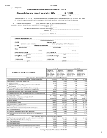 FORTE QSr 3/2006 skorygowany KOMISJA PAPIERÓW WARTOŚCIOWYCH I GIEŁD Skonsolidowany raport kwartalny QSr 3 / 2006 kwartał / rok (zgodnie z § 86 ust. 2 i § 87 ust. 1 Rozporządzenia Ministra Finansów z dnia 19 października 2005 r. - Dz. U. Nr 209, poz. 1744) dla emitentów papierów wartośc iowyc h prowadząc yc h działalność wytwórc zą, budowlaną, handlową lub usługową za 3 kwartał roku obrotowego 2006 obejmując y okres od 2006-01-01 do 2006-09-30 zawierając y skróc one skonsolidowane sprawozdanie finansowe według MSSF w waluc ie zł oraz skróc one sprawozdanie finansowe według MSSF w waluc ie zł data przekazania: 2006-11-06 FABRYKI MEBLI FORTE SA (pełna nazwa emitenta) FORTE Drzewny (drz) (skróc ona nazwa emitenta) 07-300 (sektor wg klasyfikac ji GPW w Warszawie) Ostrów Mazowiecka (kod poc ztowy) (miejsc owość ) Biała 1 (ulic a) 0-29 74620-81 do 86 (numer) 0-29 74629-19 (telefon) (fax) [email protected] www.forte.com.pl (e-mail) (www) 7590005082 550398784 (NIP) (REGON) w tys. zł 3 kwartał(y) narastając o / 2006 okres od 2006-01-01 do 2006-09-30 WYBRANE DANE FINANSOWE w tys. EUR 3 kwartał(y) narastając o / 2005 okres od 2005-01-01 do 2005-09-30 3 kwartał(y) narastając o / 2006 okres od 2006-01-01 do 2006-09-30 3 kwartał(y) narastając o / 2005 okres od 2005-01-01 do 2005-09-30 dane dotyc ząc e skróc onego skonsolidowanego sprawozdania finansowego I. Przyc hody netto ze sprzedaży produktów, towarów i materiałów 312 772 285 170 79 848 70 268 II. Zysk (strata) z działalnośc i operac yjnej -2 955 11 659 -754 2 873 III. Zysk (strata) brutto 2 135 15 826 545 3 900 Zysk (strata) netto przypadając y akc jonariuszom jednostki IV. dominując ej 308 12 412 79 3 058 -696 -6 297 -178 -1 552 VI. Przepływy pieniężne netto z działalnośc i inwestyc yjnej -6 244 -14 440 -1 594 -3 558 VII. Przepływy pieniężne netto z działalnośc i finansowej -6 831 24 666 -1 744 6 078 -13 771 3 929 -3 516 968 23 748 084 23 683 084 23 748 084 23 683 084 V. Przepływy pieniężne netto z działalnośc i operac yjnej VIII. Zwiększenie netto stanu środków pieniężnyc h i ic h ekwiwalentów IX. Lic zba akc ji (w szt.) X. Zysk (strata) na jedną akc ję zwykłą (w zł/ EUR) 0,01 0,52 0,00 0,13 2006-09-30 2005 rok 2006-09-30 2005 rok XII. Suma aktywów 424 587 438 690 106 586 113 656 XIII. Zobowiązania razem 178 872 190 432 44 903 49 337 72 503 79 179 18 201 20 514 XV. Zobowiązania krótkoterminowe 106 369 111 253 26 702 28 824 XVI. Kapitał własny udziałowc ów jednostki dominując ej 245 715 248 258 61 683 64 319 23 748 23 683 5 962 6 136 10,35 10,48 2,60 2,72 0,20 0,20 0,05 0,05 49 325 XI. Dane bilansowe za okresy XIV. Zobowiązania długoterminowe XVII. Kapitał zakładowy XVIII. Wartość księgowa na jedną akc ję (w zł/EUR) Zadeklarowana lub wypłac ona dywidenda na jedną akc ję (w XIX. zł/EUR) dane dotyc ząc e skróc onego sprawozdania finansowego XX. Przyc hody netto ze sprzedaży produktów, towarów i materiałów 285 697 200 174 72 936 XXI. Zysk (strata) z działalnośc i operac yjnej -3 243 3 322 -828 819 XXII. Zysk (strata) brutto 2 736 8 065 698 1 987 XXIII. Zysk (strata) netto 1 168 6 448 298 1 589 XXIV. Przepływy pieniężne netto z działalnośc i operac yjnej 9 355 2 805 2 388 691 XXV. Przepływy pieniężne netto z działalnośc i inwestyc yjnej -4 840 -9 194 -1 236 -2 265 Komisja Papierów Wartościowych i Giełd 1 FORTE QSr 3/2006 w tys. zł 3 kwartał(y) narastając o / 2006 okres od 2006-01-01 do 2006-09-30 WYBRANE DANE FINANSOWE w tys. EUR 3 kwartał(y) narastając o / 2005 okres od 2005-01-01 do 2005-09-30 3 kwartał(y) narastając o / 2006 okres od 2006-01-01 do 2006-09-30 3 kwartał(y) narastając o / 2005 okres od 2005-01-01 do 2005-09-30 XXVI. Przepływy pieniężne netto z działalnośc i finansowej -8 009 5 380 -2 045 XXVII. Zwiększenie netto stanu środków pieniężnyc h i ic h ekwiwalentów -3 494 -1 009 -892 -249 23 748 084 23 683 084 23 748 084 23 683 084 XXVIII. Lic zba akc ji (w szt.) XXIX. Zysk (strata) na jedną akc ję zwykłą (w zł/ EUR) 1 326 0,05 0,27 0,01 0,07 2006-09-30 2005 rok 2006-09-30 2005 rok XXXI. Suma aktywów 412 979 343 519 103 672 88 999 XXXII. Zobowiązania razem 162 367 113 775 40 760 29 477 XXXIII. Zobowiązania długoterminowe 71 100 58 091 17 849 15 050 XXXIV. Zobowiązania krótkoterminowe 91 267 55 684 22 911 14 427 250 612 229 744 62 913 59 522 23 748 23 683 5 962 6 136 10,55 9,70 2,65 2,51 XXX. Dane bilansowe za okresy XXXV. Kapitał własny XXXVI. Kapitał zakładowy XXXVII. Wartość księgowa na jedną akc ję (w zł/EUR) Raport powinien zostać przekazany do Komisji Papierów Wartośc iowyc h i Giełd, Giełdy Papierów Wartośc iowyc h w Warszawie S.A. oraz agenc ji informac yjnej zgodnie z przepisami prawa ZAWARTOŚĆ RAPORTU Plik Opis skonsolidowane SQr_3_2006.pdf sprawozdanie kwartalne PODPISY OSÓB REPREZENTUJĄCYCH SPÓŁKĘ Data Imię i Nazwisko Stanowisko/Funkc ja 2006-11-06 Andrzej Korzeb Członek Zarządu 2006-11-06 Jerzy Trojanowski Główny Księgowy Podpis Komisja Papierów Wartościowych i Giełd 2 FM FORTE S.A. QSr 3 / 2006 w tys. zł SKONSOLIDOWANY RAPORT KWARTALNY QSr 3/2006 Zgodnie z Rozporządzeniem Rady Ministrów z dnia 19 października 2005 r. w sprawie informacji bieżących i okresowych przekazywanych przez emitentów papierów wartościowych – Dz. U. nr 209, poz 1 744 Zarząd Spółki Fabryki Mebli FORTE S.A. w Ostrowi Mazowieckiej podaje do wiadomości raport kwartalny za 3 kwartał 2006 roku. Skrócone Skonsolidowane Sprawozdanie Finansowe sporządzone według MSSF SKONSOLIDOWANY BILANS stan na 2006-09-30 koniec 3 kwartału/ 2006 (w tys. zł) Aktywa I. Aktywa trwałe 1. Rzeczowe aktywa trwałe 2. Wartości niematerialne 3. Inwestycje w jednostkach stowarzyszonych 4. Aktywa finansowe 5. Aktywa z tytułu odroczonego podatku dochodowego 6. Rozliczenia międzyokresowe II. Aktywa obrotowe 1. Zapasy 2. Należności z tytułu dostaw i usług oraz pozostałe nale