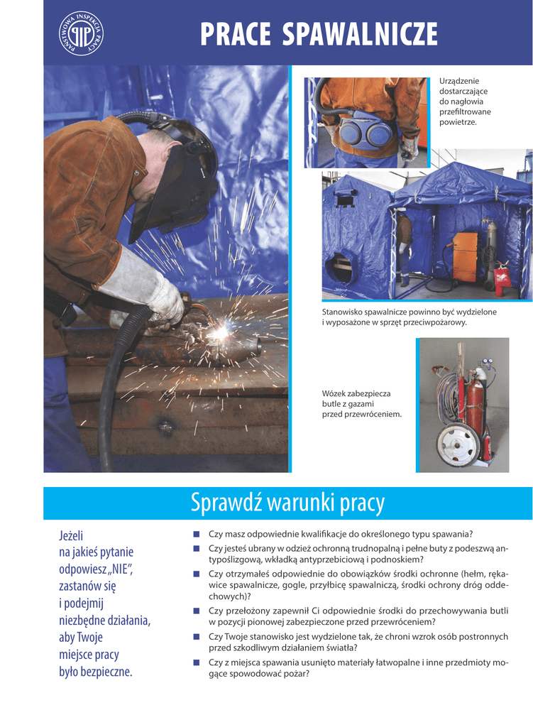 PRACE SPAWALNICZE Urządzenie dostarczające do nagłowia przefiltrowane powietrze. Stanowisko spawalnicze powinno być wydzielone i wyposażone w sprzęt przeciwpożarowy. Wózek zabezpiecza butle z gazami przed przewróceniem. Sprawdź warunki pracy Jeżeli na jakieś pytanie odpowiesz „NIE”, zastanów się i podejmij niezbędne działania, aby Twoje miejsce pracy było bezpieczne. Czy masz odpowiednie kwalifikacje do określonego typu spawania? Czy jesteś ubrany w odzież ochronną trudnopalną i pełne buty z podeszwą antypoślizgową, wkładką antyprzebiciową i podnoskiem? Czy otrzymałeś odpowiednie do obowiązków środki ochronne (hełm, rękawice spawalnicze, gogle, przyłbicę spawalniczą, środki ochrony dróg oddechowych)? Czy przełożony zapewnił Ci odpowiednie środki do przechowywania butli w pozycji pionowej zabezpieczone przed przewróceniem? Czy Twoje stanowisko jest wydzielone tak, że chroni wzrok osób postronnych przed szkodliwym działaniem światła? Czy z miejsca spawania usunięto materiały łatwopalne i inne przedmioty mogące spowodować pożar? Odzież robocza i ochronna Zamocowanie przewodów na nasadkach wykonuje Do prac spawalniczych może przystąpić pracownik ubrany w odzież ochronną trudnopalną, rękawice spawalnicze oraz pełne buty z podeszwą antypoślizgową, wkładką antyprzebiciową i podnoskiem chroniącym palce. Pracownik powinien być również wyposażony w: hełm ochronny z aktualną datą ważności, określoną przez producenta, przyłbicę spawalniczą z filtrami dobranymi do metody spawania i prądu spawania, gogle spawalnicze dobrane do strumienia gazu przepływającego przez palnik, fartuch skórzany – jeżeli stanowisko pracy nie wymaga wymuszonej pozycji ciała, środki ochrony dróg oddechowych – w przypadku wykonywania spawania w pomieszczeniu słabo wentylowanym, nagolenniki – jeżeli obuwie ochronne nie jest trudnopalne. Poziom cieczy w bezpieczniku wodnym powinien być Jeżeli praca wymaga stosowania środków ochrony indywidualnej przed upadkiem z wysokości np. szelek, to powinny one być wykonane z materiału trudno palnego lub zakryte kamizelką trudno palną. Prace spawalnicze mogą wykonywać osoby, które mają potwierdzone kwalifikacje do określonego typu spawania. Przed przystąpieniem do pracy pracownik powinien zostać poddany instruktażowi stanowiskowemu i zapoznany z instrukcjami bezpiecznej obsługi urządzeń wykorzystywanych w pracy. się wyłącznie za pomocą płaskich zacisków. sprawdzany każdorazowo przed rozpoczęciem pracy i po jej zakończeniu. Długość węży spawalniczych nie może wynosić mniej niż 5 m i więcej niż 20 m. Stosowane węże muszą być szczelne i nieuszkodzone. Łączenie poszczególnych odcinków węży jest dopusz- czalne pod warunkiem zastosowania dwuzłączek metalowych o średnicy zgodnej ze średnicą znamionową węża. Minimalna długość każdego z łączonych odcinków węży powinna wynosić co najmniej 4 m. Spawanie elektryczne Przed rozpoczęciem spawania należy sprawdzić, czy przewody i przyłączenia końcówki przewodu są właściwie podłączone do uchwytu. Każdy spawany przedmiot powinien być uziemiony. Przewody elektryczne i uchwyt do elektrody powinny mieć nieuszkodzoną izolację. Do zdejmowania elektrody i podnoszenia spawanego materiału należy użyć szczypiec. Należy unikać kontaktu z obwodem spawalniczym. Nie należy używać zbyt ciemnych filtrów, które spo- wodują, że spawacz będzie pracował zbyt blisko łuku elektrycznego. Po skończonym spawaniu, trzeba wyjąć elektrodę z uchwytu spawarki, żeby uniknąć przypadkowego wzbudzenia łuku elektrycznego. Organizacja stanowiska pracy Stanowisko spawacza powinno być wydzielone tak, żeby chroniło wzrok osób postronnych przed szkodliwym działaniem światła. Nie wolno! W czasie opadów atmosferycznych spawanie jest dozwolone tylko po osłonięciu stanowiska pracy. Odkładać uchwytu elektrody na spawarkę. Owijać kabli wokół ciała. Spawanie gazowe Kierować palnika w kierunku ludzi. Używać spawarki przy zdemontowanej obudowie lub prowizorycznych połączeniach. Podczas pracy dotykać osłony stykowej i spawanych elementów. Dotykać zatłuszczonymi rękami butli z tlenem, zaworów i osprzętu. Spawać bez założenia środków ochrony wzroku. Butle z gazami należy ustawić w pozycji pionowej i za- bezpieczyć przed przewróceniem. Butle nie mogą nagrzewać się do temperatury powyżej 35°C. Zawory butli z tlenem i acetylenem nie powinny znajdować się blisko siebie. Konieczne jest stosowanie bezpieczników usytuowanych na wlocie lub wewnątrz palnika. © Państwowa Inspekcja Pracy 14008/01/00