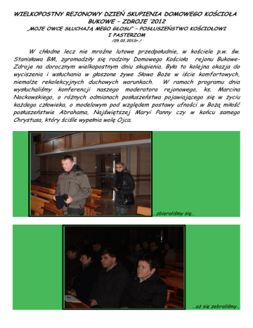 WIELKOPOSTNY REJONOWY DZIEŃ SKUPIENIA DOMOWEGO KOŚCIOŁA BUKOWE – ZDROJE ‘2012 „MOJE OWCE SŁUCHAJĄ MEGO GŁOSU” – POSŁUSZEŃSTWO KOŚCIOŁOWI I PASTERZOM /25.02.2012r./ W chłodne lecz nie mroźne lutowe przedpołudnie, w kościele p.w. św. Stanisława BM, zgromadziły się rodziny Domowego Kościoła rejonu BukoweZdroje na dorocznym wielkopostnym dniu skupienia. Była to kolejna okazja do wyciszenia i wsłuchania w głoszone żywe Słowo Boże w iście komfortowych, niemalże rekolekcyjnych duchowych warunkach. W ramach programu dnia wysłuchaliśmy konferencji naszego moderatora rejonowego, ks. Marcina Nockowskiego, o różnych odmianach posłuszeństwa pojawiającego się w życiu każdego człowieka, o modelowym pod względem postawy ufności w Bożą miłość posłuszeństwie Abrahama, Najświętszej Maryi Panny czy w końcu samego Chrystusa, który ściśle wypełnia wolę Ojca. …zbieraliśmy się… …aż się zebraliśmy… …i w imię Boże zaczęliśmy… … jeszcze tylko kilka informacji organizacyjnych… …i czas na konferencję… Po konferencji przenieśliśmy się wszyscy do parafialnej świetlicy, gdzie w przygotowanej salce kinowej mogliśmy obejrzeć i wysłuchać części kazania bł. Jana Pawła II, wygłoszonego w podczas wizyty papieskiej w Szczecinie na Jasnych Błoniach w 1987 roku. …zamiast Kroniki Filmowej przed projekcją archiwalnego już materiału… …a salka kinowa pękała w szwach… Część kawowo-herbaciana stanowiła krótki przerywnik przed kolejnym punktem programu dnia skupienia – pracą w grupach. …Poznaję! Ksiądz Marcin!! – Tak, to ja A w grupach próbowaliśmy znaleźć odpowiedzi na pytania: 1/ Czy posłuszeństwo Kościołowi (w tym zobowiązaniom wspólnoty, do której należymy) jest błogosławieństwem czy przekleństwem, lub inaczej: przywilejem, czy obowiązkiem? 2/ Jakie są obawy i zagrożenia wobec posłuszeństwa? 3/ Czym jest posłuszeństwo wobec Kościoła i do czego ono zaprasza? …40 minut nie wystarczyło by wyczerpać temat zagadnień … …pozostało więc wiele do osobistych przemyśleń … …kiedyśmy się rozdyskutowali nadszedł czas na Namiot Spotkania … …pytania w sercach pozostały … Praktycznie od razu po zakończeniu tej części ćwiczeń udaliśmy się do kościoła, gdzie miało miejsce wystawienie Najświętszego Sakramentu. Podczas adoracji można było odbyć Namiot Spotkania, który został wzbogacony modlitwami wstawienniczymi za pasterzy Kościoła, suto przeplatanymi ciszą… …przed Najświętszym Sakramentem… …wpatrzeni w posłuszeństwo Chrystusa… …umocnieni błogosławieństwem… Nadszedł kulminacyjny moment tego dnia wyciszenia, dnia skupienia – czas Eucharystii. Rejonowa diakonia muzyczna miała chwilę, by przećwiczyć cały mszalny repertuar. Jedną z intencji tej wspólnotowej Najświętszej Ofiary była prośba o Boże błogosławieństwo w kolejnych latach małżeńskiej drogi dla Eli i Jurka w 28 rocznicę zawarcia przez nich małżeńskiego związku sakramentalnego. …rejonowa diakonia muzyczna… Podczas Mszy św. miało również miejsce odnowienie ślubów małżeńskich przez wszystkie zgromadzone pary (jak i połówki, bo też były). Poniżej, kogo uchwyciło „wścibskie oko obiektywu”: …od 28 lat razem!!… …była więc okazja, by wspólnie śpiewać im 100 lat!!… Nadmienię, gdyż to ważne, że nasze dzieci znajdowały się pod opieką profesjonalnej diakonii wychowawczej – Bóg zapłać! …dzieciom czas się nie dłużył… …chyba … Grzegorz zameldował się u nas wprost z długiej podróży z zagranicy: …góry i morza przefrunął, by być z nami… Cóż, kończy się pomału relacja z zakończonego dnia skupienia. W sercach, głowach pozostało, myślę, wiele. Dajmy rozkwitać naszym duchowym refleksjom, by ubogacały nasze życia nieustanną tęsknotą za Bożą miłością... Nie byłoby wspólnoty, bez wspólnotowego zakończenia – takoż zakończyliśmy ten dzień duchowych manewrów tradycyjną już „agape” – ucztą miłości… …”życzymy, życzymy!”… …po raz kolejny zaślubieni… …uśmiech topi wszelkie lody… …choć niektórych to dziwi… …jemy, co nam nawarzono… …jak dobrze być razem – Oni to wiedzą!!… …To już koniec!! Zamykamy!!... I to by było na tyle… Z Panem Bogiem! Adaś S.