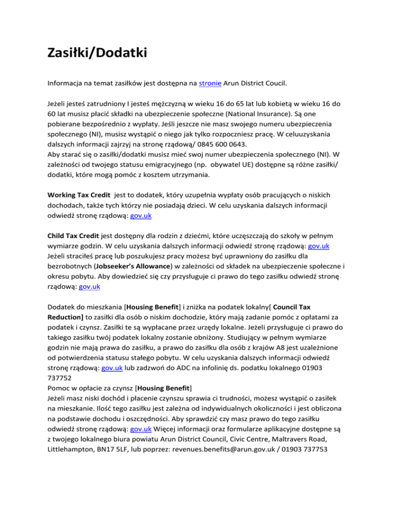Zasiłki/Dodatki Informacja na temat zasiłków jest dostępna na stronie Arun District Coucil. Jeżeli jesteś zatrudniony I jesteś mężczyzną w wieku 16 do 65 lat lub kobietą w wieku 16 do 60 lat musisz płacić składki na ubezpieczenie społeczne (National Insurance). Są one pobierane bezpośrednio z wypłaty. Jeśli jeszcze nie masz swojego numeru ubezpieczenia społecznego (NI), musisz wystąpić o niego jak tylko rozpoczniesz pracę. W celuuzyskania dalszych informacji zajrzyj na stronę rządową/ 0845 600 0643. Aby starać się o zasiłki/dodatki musisz mieć swoj numer ubezpieczenia społecznego (NI). W zależności od twojego statusu emigracyjnego (np. obywatel UE) dostępne są różne zasiłki/ dodatki, które mogą pomóc z kosztem utrzymania. Working Tax Credit jest to dodatek, który uzupełnia wypłaty osób pracujących o niskich dochodach, także tych którzy nie posiadają dzieci. W celu uzyskania dalszych informacji odwiedź stronę rządową: gov.uk Child Tax Credit jest dostępny dla rodzin z dziećmi, które uczęszczają do szkoły w pełnym wymiarze godzin. W celu uzyskania dalszych informacji odwiedź stronę rządową: gov.uk Jeżeli straciłeś pracę lub poszukujesz pracy możesz być uprawniony do zasiłku dla bezrobotnych (Jobseeker’s Allowance) w zależności od składek na ubezpieczenie społeczne i okresu pobytu. Aby dowiedzieć się czy przysługuje ci prawo do tego zasiłku odwiedź stronę rządową: gov.uk Dodatek do mieszkania [Housing Benefit] i zniżka na podatek lokalny[ Council Tax Reduction] to zasiłki dla osób o niskim dochodzie, który mają zadanie pomóc z opłatami za podatek i czynsz. Zasiłki te są wypłacane przez urzędy lokalne. Jeżeli przysługuje ci prawo do takiego zasiłku twój podatek lokalny zostanie obniżony. Studiujący w pełnym wymiarze godzin nie mają prawa do zasiłku, a prawo do zasiłku dla osób z krajów A8 jest uzależnione od potwierdzenia statusu stałego pobytu. W celu uzyskania dalszych informacji odwiedź stronę rządową: gov.uk lub zadzwoń do ADC na infolinię ds. podatku lokalnego 01903 737752 Pomoc w opłacie za czynsz [Housing Benefit] Jeżeli masz niski dochód i płacenie czynszu sprawia ci trudności, możesz wystąpić o zasiłek na mieszkanie. Ilość tego zasiłku jest zależna od indywidualnych okoliczności i jest obliczona na podstawie dochodu i oszczędności. Aby sprawdzić czy masz prawo do tego zasiłku odwiedź stronę rządową: gov.uk Więcej informacji oraz formularze aplikacyjne dostępne są z twojego lokalnego biura powiatu Arun District Council, Civic Centre, Maltravers Road, Littlehampton, BN17 5LF, lub poprzez: [email protected] / 01903 737753 Dodatek do dochodu [Income Support] jest wypłacany osobom, których dochód nie wystarcza na życie. Wszystkie pieniądze jakie osoba posiada są brane pod uwagę przy określaniu wysokości dodatku do dochodu. Dodatek do dochodu jest zasiłkiem nieskładkowym, co oznacza, że jest niezależny od ilości składek na ubezpieczenie społeczne. Możesz uzyskać dodatek do dochodu, nawet jeśli nigdy nie płaciłeś składek na ubezpieczenie społeczne, ale aby wystąpić o taki zasiłek trzeba mieć przyznany numer ubezpieczenia społecznego [National Insurance Number]. Zasiłek ten jest dla osób w wieku 18-60 lat, żyjących w UK. Jeżeli przyjechałeś z zagranicy lub niedawno zamieszkałeś w UK, możesz mieć trudności w uzyskaniu dodatku do dochodu, ze względu na status imigracyjny. W celu uzyskania dalszych informacji odwiedź stronę rządową: gov.uk (Ustawowe) Chorobowe [Statutory Sick Pay ( SSP)] Jeżeli chorujesz i nie jesteś w stanie pracować przez więcej niż 4 dni i płacisz składki na ubezpieczenie społeczne to możesz kwalifikować się na chorobowe. (Ustawowy) Urlop Macierzyński [Statutory Maternity Pay (SMP)] Jeżeli jesteś w ciąży i byłaś zatrudniona przez całe 26 tygodni przed momentem 15 tygodnia przed porodem, to przysługuje ci prawo do urlopu macierzyńskiego. Jeśli takie prawo ci nie przysługuje to można wystąpić o zasiłek macierzyński [Maternity Allowance]do lokalnego biura zajmującego się zasiłkami, ale będzie on uzależniony od sumy składek na ubezpieczenie społeczne jaką zapłaciliście. Zasiłek Rodzinny [Child Benefit] Jeżeli pochodzisz z kraju należącego do Europejskiego Obszaru Gospodarczego (EOG)[European Economic Area (EEA)] i nabyłeś prawo do pobytu w UK, możesz być uprawniony do zasiłku rodzinnego, nawet jeśli twoje dziecko żyje w innym kraju EOG. Szczegółowe informacje na temat zasad przyznawania zasiłku rodzinnego znajdują się na stronie rządowej: gov.uk Pension credit – Przepisy na temat emerytów i dodatków dla osób w wieku emerytalnym aktualnie ulegają zmianie. W celu uzyskania najnowszych informacji skontaktuj się z lub odwiedź stronę rządową. Aby uzyskać więcej informacji na temat inny zasiłków I dodatków skontaktuj się z Jobcentre Plus poprzez ich stronę internetową lub 0845 600 0643 Lub przez lokalne biuro Jobcentre Plus: Littlehampton Jobcentre Plus 33 Church Street Littlehampton BN17 5ER Bognor Regis Jobcentre Plus Gloucester House High Street Bognor Regis PO21 1HH Infolinia: 0845 6043719 Pomoc Lokalna [Local Assistance] Urząd Hrabstwa West Sussex [West Sussex County Council] wprowadził nowy projekt w celu wspierania lokalnej społeczności, który nosi nazwę Sieci Lokalnej Pomocy [Local Assistance Network]. Stonepillow jest w stanie pomóc praktyczną pomoc w znalezieniu zakwaterowania dla osób, które znalazły się w sytuacji kryzysowej i nie mają dostępu do innego rodzaju pomocy. Wszelka udzielana pomoc leży w dyskrecji projektu i można być utytułowany do tej pomocy, jeśli: mieszkasz w powiacie Chichester lub Arun posiadasz niski dochód lub utrzymujesz się z zasiłków zdarzenie losowe sprawiło, że ty i twoja rodzina zostaliście postawieni w sytuacji zagrożenia potrzebujesz pomocy aby przeprowadzić si