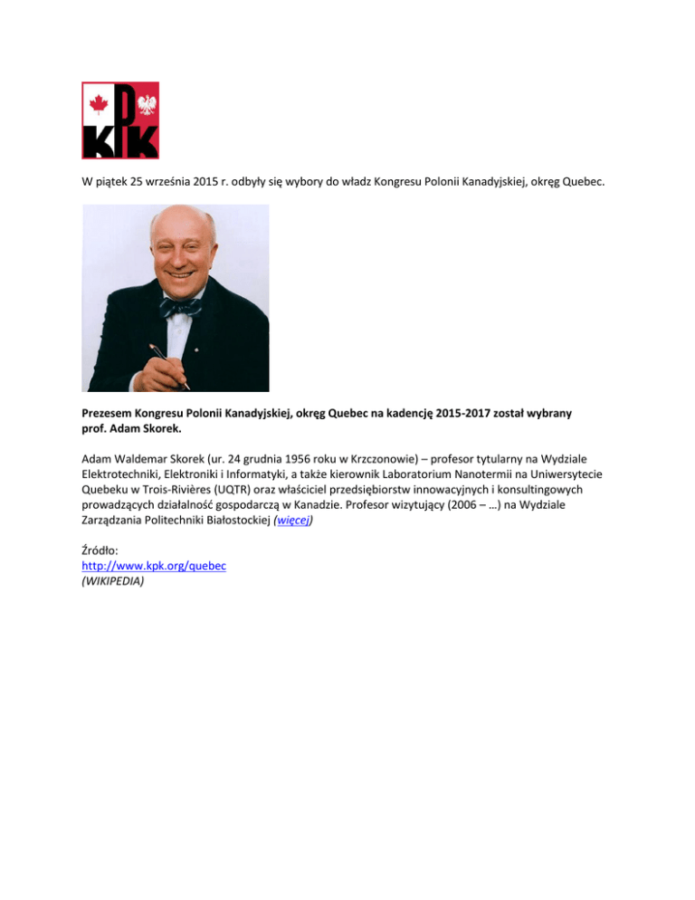 W piątek 25 września 2015 r. odbyły się wybory do władz Kongresu Polonii Kanadyjskiej, okręg Quebec. Prezesem Kongresu Polonii Kanadyjskiej, okręg Quebec na kadencję 2015-2017 został wybrany prof. Adam Skorek. Adam Waldemar Skorek (ur. 24 grudnia 1956 roku w Krzczonowie) – profesor tytularny na Wydziale Elektrotechniki, Elektroniki i Informatyki, a także kierownik Laboratorium Nanotermii na Uniwersytecie Quebeku w Trois-Rivières (UQTR) oraz właściciel przedsiębiorstw innowacyjnych i konsultingowych prowadzących działalnośd gospodarczą w Kanadzie. Profesor wizytujący (2006 – …) na Wydziale Zarządzania Politechniki Białostockiej (więcej) Źródło: http://www.kpk.org/quebec (WIKIPEDIA)