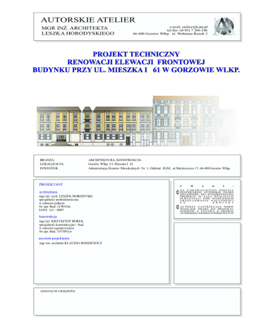AUTORSKIE ATELIER MGR INŻ. ARCHITEKTA LESZKA HORODYSKIEGO BRANŻA: LOKALIZACJA: INWESTOR: ARCHITEKTURA, KONSTRUKCJA Gorzów Wlkp. Ul. Mieszka I 61 Administracja Domów Mieszkalnych Nr 1, Oddział ZGM, ul.Mickiewicza 17, 66-400 Gorzów Wlkp. PROJEKTANT architektura mgr inż. arch. LESZEK HORODYSKI specjalność architektoniczna w zakresie pełnym Nr upr. Bud. 31/90/Gw. LOIA LU - 0007 konstrukcja mgr inż. KRZYSZTOF BOREK specjalność konstrukcyjno - bud. w zakresie ograniczonym Nr upr. Bud. 107/89/Lw asystent projektanta mgr inż. architekt KLAUDIA RODZIEWICZ ADNOTACJE URZĘDOWE: e-mail: [email protected] tel/fax: (0-95) 7 206 246 66-400 Gorzów Wlkp. ul. Wełniany Rynek 3 U W A G I : N A Z A M AW I A J Ą C E G O Z O S TA J Ą PRZENIES IONE AUTO R SKIE P RAWA MAJ ĄTK OWE DO W YKORZYSTANIA P R OJE K TU W C E L U R E AL I Z A C J I I N W E S T Y C J I P O D WA R U N K I E M U R E GU L O WA N IA N AL E Ż NO Ś C I Z A P R O J E K T AU TO R Z Y Z A S T R Z E G A JĄ S O B I E W SZEL KIE P R AWA D O PR OJEKT U Z GO D NI E Z US TAW Ą O P R AW I E AUTORSKIM I PRAWACH POKREWNYCH PROJEKT TECHNICZNY RENOWACJI ELEWACJI FRONTOWEJ BUDYNKU PRZY UL. MIESZKA I 61 W GORZOWIE WLKP. Kamienica jest częścią historycznego układu urbanistycznego tzw. Nowego Miasta w m. Gorzów Wlkp. wpisanego do rejestru zabytków województwa lubuskiego pod numerem rejestru L-224/A 1. STAN ISTNIEJĄCY Budynek mieszkalny wielorodzinny, 3 kondygnacje użytkowe z poddaszem nieużytkowym, budynek podpiwniczony. W parterze- lokal gastronomiczny. Balkony w konstrukcji stalowej z balustradami stalowymi. Dach w konstrukcji drewnianej, kryty dachówką cementową. Elewacja: Ściana w technologii tradycyjnej, budowana z cegły ceramicznej klinkierowej ze zdobieniami. Pokrycie tynkiem cementowo-wapiennym oryginalnym. Cokół – okładzina z piaskowca. 2. OCENA STANU TECHNICZNEGO. 2.1. Ogólna charakterystyka konstrukcji i wykończenia ściany zewnętrznej budynku. Ściana zewnętrzna stanowiąca dwie elewacje ( + cześć narożna ) budynku od ulicy Mieszka I i Jagiellończyka wykonana jako tradycyjna ściana murowana z cegły pełnej, grubości 2 ½ do 1 cegły, obejmująca 3 kondygnacje budynku. Powierzchnia ściany częściowo wykończona cegłą licówką - pierwsze i drugie piętro, częściowo pokryta tynkiem wapiennym wraz ze zdobieniami elewacji w postaci gzymsów, obramowań okiennych. Na narożniku ścian zewnętrznych występują na pierwszym i drugim piętrze balkony o stalowej konstrukcji wspornikowej, wypełnione materiałem ceramicznym (płyta balkonowa), zakotwione w ścianach i prawdopodobnie w belkowej konstrukcji stropów. Balustrady balkonów masywne, murowane z cegły. Ściana jak i cały budynek wykonana w okresie przedwojennym. 2.2. Opis uszkodzeń W wyniku przeprowadzonych oględzin ścian zewnętrznej stanowiących elewacje budynku od strony ulicy Mieszka I i Jagiellończyka stwierdzono: – zarysowanie konstrukcji murowej ścian - podokienniki (od strony ulicy Jagiellończyka i Mieszka I ), szerokość zarysowania jest nieznaczna i wynosi około 1-2mm, – zarysowanie poprzeczne elementów nadproży nadokiennych, w pobliżu środka rozpiętości, szerokości do 1 – 2 mm, – ubytki w fugach fragmentów ściany wykonanej z cegły licówki, – liczne spękania gzymsów ozdobnych ścian, – skorodowanie belek stalowych stanowiących konstrukcję podtrzymującą balkony, skorodowanie ma charakter powierzchniowy, w wyniku którego nie nastąpiło widoczne zmniejszenie się przekrojów poprzecznych nośnych elementów stalowych, – poziome zarysowanie murów balustrad na płytach balkonowych, – elementy drewniane elewacji jak deskowanie gzymsu okapowego w stanie widocznego całkowitego zniszczenia (zmurszale i obluzowane deski), – elementy blaszane obróbek, rynny i rury spustowe w stanie dość dużego zużycia, nieszczelne, ze skorodowanymi połączeniami, – stwierdzono stan zawilgocenia ścian na parterze przy odprowadzeniach wody z rur spustowych, przy czym nie wyklucza się lokalnej, nadmiernej wilgoci w ścianach w strefie piwnic i parteru ze względów na brak izolacji poziomej murów oraz nieprawidłowym funkcjonowaniem odwodnienia dachu (stwierdzono ślady drobnych nieszczelności rur spustowych). 2.3. Wnioski / zalecane odnośnie zakresu prac naprawczych Nie stwierdzono widocznych uszkodzeń konstrukcji murowej stanowiących zagrożenie bezpieczeństwa zarówno dla ludzi jak i samego budynku. Stan techniczny samej konstrukcji murowej ścian zewnętrznych określa się jako dość dobry, w przypadku balkonów ich stan określa się jako dostateczny, tzn. wymagający w ciągu najbliższych lat radykalnych prac naprawczo-wzmacniających. Wobec powyższego zaleca się: – naprawę zarysowania ścian i nadproży za pomocą technologii elastycznych profili śrubowych (cięgna, kotwy) ze stali nierdzewnej wklejanych w wyfrezowanych szczelinach w konstrukcjach murowych za pomocą specjalnych, szybkowiążących zapraw klejowych, – odsłonięcie stalowej konstrukcji wsporczej balkonów poprzez skucie tynków, wypraw i dokonanie jej gruntownego oczyszczenia i zabezpieczenia antykorozyjnego, w przypadku stwierdzenia po odsłonięciu elementów stalowych stanu korozyjnego przekraczającego stan korozji powierzchniowej, należy wykonać bezwzględnie prace wzmacniające. Stan techniczny elementów wykończeniowo-ozdobnych elewacji określa się jak zły, wymagający prac naprawczych. Zakres tych prac winien m.in. objąć: – całkowite skucie i wykonanie nowych tynków zewnętrznych, zabezpieczonych nowymi powłokami malarskimi, – oczyszczenie i zafugowanie fragmentów elewacji wykonanych z cegły licówki, – naprawę bądź wykonanie nowych elementów ozdobnych jak gzymsy, bonie, obramowania okienne, – wykonanie nowej podbitki drewnianej okapu, – kompletną wymianę obróbek blacharskich, rynien i rur spustowych. 3. ZAKRES ROBÓT – naprawa izolacji pionowych ścian fundamentowych, – 