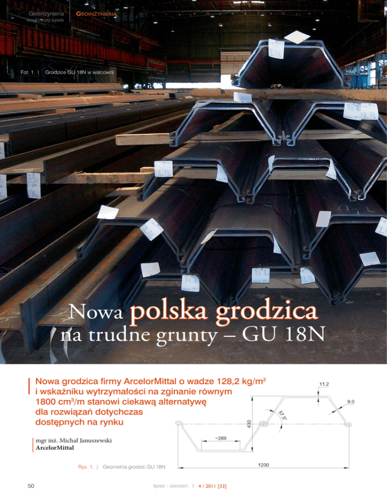 Geoinżynieria GEOINŻYNIERIA drogi mosty tunele Fot. 1. | Grodzice GU 18N w walcowni Nowa polska grodzica na trudne grunty – GU 18N Nowa grodzica firmy ArcelorMittal o wadze 128,2 kg/m2 i wskaźniku wytrzymałości na zginanie równym 1800 cm3/m stanowi ciekawą alternatywę dla rozwiązań dotychczas dostępnych na rynku mgr inż. Michał Januszewski ArcelorMittal Rys. 1. | Geometria grodzic GU 18N 50 lipiec - sierpień 4 / 2011 [33] GEOINŻYNIERIA Geoinżynieria drogi mosty tunele Fot. 2. | Nowe grodzice GU 18N W czerwcu 2006 r. zarządy firm Arcelor i Mittal Steel Company, podejmując decyzję o połączeniu obu przedsiębiorstw, doprowadziły do powstania w wyniku owej fuzji największego na świecie producenta stali, koncernu zatrudniającego 320 000 pracowników, będącego w stanie produkować ponad 120 mln ton stali rocznie. Bycie największym na świecie wytwórcą stali i zarazem grodzic jest nie tylko powodem do dumy, ale także, a może przede wszystkim, powodem do dalszej wytężonej pracy nad zwiększaniem konkurencyjności swoich produktów. ZAPOWIEDŹ NOWEGO ArcelorMittal Oddział w Dąbrowie Górniczej (dawniej Huta Katowice), aby sprostać oczekiwaniom klientów, nieustannie pracuje nad poszerzaniem swojej oferty produkcyjnej w zakresie stalowych grodzic gorącowalcowanych, czego efektem jest wprowadzenie do produkcji nowego profilu GU 18N, będącego obok pocienianego GU 16N i pogrubianego GU 20N zapowiedzią nowej gamy grodzic o szerokości modułowej 600 mm. Ciągły rozwój sprzętu stwarzający możliwości do pogrążania za jego pomocą coraz szerszych grodzic oraz doświadczenie specjalistycznych firm w tymże zakresie zaowocowały wyzbyciem się obaw przed stosowaniem profili o wspomnianej szerokości. Atutem tego jest wyraźnie szybszy czas realizacji obiektów, co zauważalnie przyczynia się do obniżania kosztów inwestycji. CZYSTY ZYSK GU 18N to polskie wcielenie luksemburskiego PU 18 – światowa jakość w konkurencyjnej cenie. Korzystna relacja wagi metra kwadratowego (128,2 kg/m2) do wskaźnika wytrzyma- Rys. 2. | Parametry profilu GU 18N lipiec - sierpień 4 / 2011 [33] 51 Geoinżynieria GEOINŻYNIERIA drogi mosty tunele Fot. 4. | Trudne warunki wymagaly podwiercania gruntu przy wskaźniku wytrzymałości na zginanie Wx = 1800 cm3/m pozwala na bezpiecznie przeniesienie momentu zginającego o wartości Myk = 639 kNm/m. PRAKTYKA Fot. 3. | Pogrążanie grodzic GU 18N łości na zginanie (Wx = 1800 cm3/m) czynią z wytwarzanego w polskiej hucie nowego profilu niezwykle atrakcyjną propozycję zamienną wobec dostępnych na rynku rozwiązań. W epoce dynamicznie zmieniających się kosztów transportu, taka przewaga wagowa wynikająca z mniejszego tonażu wymagającego przewiezienia i rozładowania, stanowi niewątpliwy argumentem „za”. WYTRZYMAŁOŚĆ Wspomniane wyżej wielkości są rezultatem prac nad modyfikacją i optymalizacją kształtu i wymiarów, dających swój wyraz we wzmocnionych ściankach oraz narożnikach. Wyniki powyższego wyraźnie dedykują profil do wielokrotnego pogrążania oraz do zastosowania w trudnych warunkach gruntowych. Profil GU 18N produkowany jest wg polskiej normy PN/EN 10248 – 1,2 z 1999 roku. Norma ta wyraźnie określa gatunki stali, z których wykonywane są grodzice. Omawiany profil dostępny jest w gatunkach stali do S 355 GP, co Jednym z pierwszym projektów, w którym nowa grodzica GU 18N znalazła zastosowanie jest budowa obiektu Makro Cash & Carry przy ul. Zakopiańskiej w Krakowie. Prywatne Przedsiębiorstwo Inżynieryjne Gerharda Chroboka otrzymało od generalnego wykonawcy inwestycji firmy Budus S.A. zadanie wykonania ściany oporowej z grodzic stalowych zabezpieczającej skarpę w pobliżu nowo wznoszonego obiektu. Na długości 236 m należało pogrążyć grodzice o długościach 9–13 m, co zaowocowało zużyciem ponad 300 t stali. Występujące warunki gruntowe w postaci zalegających, miejscami pod warstwą nasypu piaszczysto-gliniastego, glin pylastych i iłów pylastych nastręczały początkowo pewne trudności. Zastosowane przez specjalistów z PPI Chrobok podwiercanie gruntu ułatwiło pogrążanie grodzic, które z uwagi na bliskie sąsiedztwo budynków biurowych odbywało się przy użyciu wibromłota o regulowanej częstotliwości drgań. Teoretyczne właściwości profilu znalazły swe potwierdzenie w praktycznym zastosowaniu. Projekt w dalszym ciągu jest w fazie realizacji. Przypominamy, że pomoc i doradztwo wykwalifikowanych inżynierów ArcelorMittal zarówno w obszarze projektowym, jak i wykonawczym, obok szerokiej gamy profili grodzicowych, stanowi integralną część oferty dla geotechnicznego rynku. Więcej szczegółowych informacji na temat grodzic ArcelorMittal dostępne jest na stronie www.grodzice.pl Rys. 3. | Rzut ściany oporowej 52 lipiec - sierpień 4 / 2011 [33]