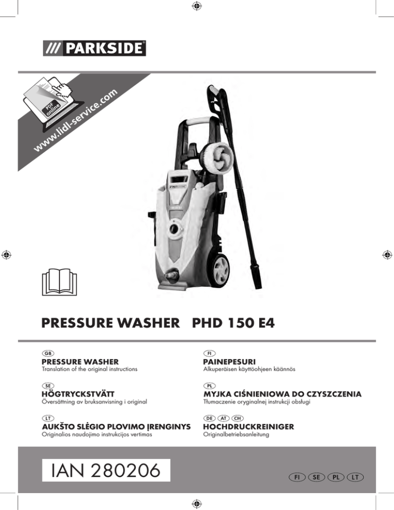 PRESSURE WASHER PHD 150 E4 PRESSURE WASHER PAINEPESURI HÖGTRYCKSTVÄTT MYJKA CIŚNIENIOWA DO CZYSZCZENIA AUKŠTO SLĖGIO PLOVIMO ĮRENGINYS HOCHDRUCKREINIGER Translation of the original instructions Översättning av bruksanvisning i original Originalios naudojimo instrukcijos vertimas IAN 280206 Alkuperäisen käyttöohjeen käännös Tłumaczenie oryginalnej instrukcji obsługi Originalbetriebsanleitung Before reading, unfold the page containing the illustrations and familiarise yourself with all functions of the device. Käännä ennen lukemista kuvallinen sivu esiin ja tutustu seuraavaksi laitteen kaikkiin toimintoihin. Vik ut bildsidan och ha den till hands när du läser igenom anvisningarna och gör dig bekant med apparatens/ maskinens funktioner. Przed przeczytaniem proszę rozłożyć stronę z ilustracjami, a następnie proszę zapoznać się z wszystkimi funkcjami urządzenia. Prieš skaitydami išlankstykite lapą su paveikslėliais ir susipažinkite su visomis prietaiso funkcijomis. Klappen Sie vor dem Lesen die Seite mit den Abbildungen aus und machen Sie sich anschließend mit allen Funktionen des Gerätes vertraut. GB FI SE PL LT DE / AT / CH Translation of the original instructions Alkuperäisen käyttöohjeen käännös Översättning av bruksanvisning i original Tłumaczenie oryginalnej instrukcji obsługi Originalios naudojimo instrukcijos vertimas Originalbetriebsanleitung Page Sivu Sidan Strona Puslapis Seite 4 16 27 39 52 65 A 1 21 2 3 4 5 20 19 18 17 16 6 15 7 22 8 14 23 9 13 24 10 12 11 25 1 9 10 4 24 18 B 1 3 23 26 2 GB Content Introduction Introduction .................................4 Areas of Application ....................4 General Description......................5 Scope of Delivery............................. 5 Functional description ....................... 5 Overview ........................................ 5 Technical data ..............................6 Notes on Safety ...........................6 Explanation of symbols ..................... 6 Symbols in the manual ...................... 7 General notes on safety .................... 7 Start-up .......................................9 Setting up ....................................... 9 Mains connection ........................... 10 Operation ..................................... 10 Interrupting operation ..................... 11 Ending operation ........................... 11 Using detergents ............................ 11 Cleaning and Maintenance .........12 Cleaning ....................................... 12 Maintenance ................................. 12 Storage ......................................12 Waste Disposal and Environmental Protection ...........12 Guarantee .................................13 Repair Service ............................14 Service-Center ............................14 Importer ....................................14 Spare parts/Accessories .............14 Trouble shooting ........................15 Translation of the original EC declaration of conformity ............ 78 Congratulations on the purchase of your new device. With it, you have chosen a high quality product. During production, this equipment has been checked for quality and subjected to a final inspection. The functionality of your equipment is therefore guaranteed. It cannot be ruled out that residual quantities of water or lubricants will remain on or in the equipment/hose lines in isolated cases. This is not a fault or defect and it represents no cause for concern. 4 The operating instructions constitute part of this product. They contain important information on safety, use and disposal. Before using the product, familiarise yourself with all of the operating and safety instructions. Use the product only as described and for the applications specified. Keep this manual safely and in the event that the product is passed on, hand over all documents to the third party. Areas of Application Only use the pressure cleaner in the following private home areas: • This equipment is not suitable for commercial use. Commercial use will invalidate the guarantee. • To clean machines, vehicles, buildings, work tools, facades, terraces, gardening tools, etc. with a high-pressure water jet. • Only use with original accessories and spares. • Cleaning the object according to its manufacturer’s information. • The rotating wash brush is fundamentally not suitable for sensitive and painted surfaces (e.g. automotive paint). GB General Description The diagram of the most important functional elements can be found on the foldout side. Overview A Scope of Delivery Unpack the pressure cleaner and verify the contents: - Pressure cleaner with mains cable High-pressure hose on hose reel Holder for mains cable Jet gun holder Quick connector for garden hose adaptor Jet gun Turbo dirt blaster Standard Vario nozzle Rotating wash brush Nozzle cleaning needle Cleaning agent container with nozzle 0.5 l cleaning agent Instructions for use 12 13 14 15 16 17 18 19 20 21 22 23 24 25 26 Dispose of the packaging material correctly. Functional description The pressure cleaner cleans by means of a water jet, with a choice of high or low pressure operation. A detergent can be added if this is required. For the functions of the operating elements please refer to the subsequent description. Ensure that the safety instructions are always observed! 1 2 3 4 5 6 7 8 9 10 11 B Jet gun Locking lever Starting lever High-pressure fitting (gun) Release button Holder for spray gun Accessories holder On/Off switch Jet lance Turbo dirt blaster Water connection coupling with strainer insert Water connection Wheels Rotatable holder for mains cable Fixed holder for mains cable Carrying handle Hose reel crank Rotating wash brush High-pressure hose on hose reel Bow-type handle Quick connector for garden hose adaptor Cleaning agent container with nozzle Nozzle cleaning needle Standard Vario nozzle Holder for nozzles Cleaning agent 1 Jet gun 2 Locking leve