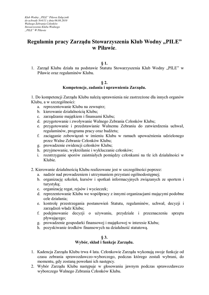 Regulamin pracy Zarządu Stowarzyszenia Klub Wodny „PILE” w