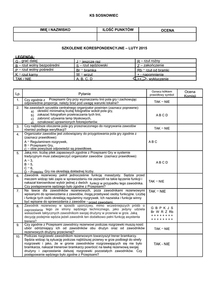 KS SOSNOWIEC IMIĘ I NAZWISKO ILOŚĆ PUNKTÓW OCENA SZKOLENIE KORESPONDENCYJNE – LUTY 2015 LEGENDA: G - grać dalej B – rzut wolny bezpośredni P – rzut wolny pośredni K – rzut karny TAK / NIE J – jeszcze raz S – rzut sędziowski Br – bramka W – wrzut A, B, C, D R – rzut rożny Z – zakończenie Rb – rzut od bramki + - napomnienie ++ - wykluczenie Lp. Pytanie 1. Czy zgodnie z Przepisami Gry przy wyznaczaniu linii pola gry i zachowując odpowiednie proporcje, należy brać pod uwagę warunki lokalne? Na zawodach szczebla centralnego organizator powinien (zaznacz poprawne): a) określić minimalną liczbę fotografów wokół pola gry, b) zakazać fotografom przekraczania tych linii, c) zabronić używania lamp błyskowych, d) oznakować uprawnionych fotoreporterów. Czy najbliższe otoczenie pola gry przeznaczonego do rozgrywania zawodów również podlega weryfikacji? Organizator zawodów jest zobowiązany do przygotowania pola gry zgodnie z (zaznacz prawidłowe): A – Regulaminem rozgrywek, B – Przepisami Gry, C – obie powyższe odpowiedzi są prawidłowe. Jaką min. liczbę piłek zapasowych zgodnie z Przepisami Gry w systemie tradycyjnym musi zabezpieczyć organizator zawodów (zaznacz prawidłowe): A – 3, B – 5, C – 6, D – Przepisy Gry nie określają dokładnej liczby. Zawodnik rezerwowy pełnił jednocześnie funkcję masażysty. Sędzia przed meczem widząc taki zapis w sprawozdaniu nie zezwolił na takie łączenie funkcji i nakazał kierownikowi wybór jednej z dwóch funkcji w przypadku tego zawodnika. Czy postępowanie sędziego było zgodne z Przepisami? Na ławce dla zawodników rezerwowych, poza zawodnikami rezerwowymi wpisanymi do sprawozdania z zawodów, mogą przebywać osoby funkcyjne. Liczbę i funkcje tych osób określają regulaminy rozgrywek. Ich nazwiska i funkcje winny być wpisane do sprawozdania z zawodów – przed zawodami. Zawodnik rezerwowy w sposób uporczywy, mimo wcześniejszych próśb o zaprzestanie tego ze strony sędziego technicznego, jako jedyny udziela wskazówek taktycznych zawodnikom swojej drużyny w przerwie w grze. Jaką decyzję podejmie sędzia jeżeli zawodnik ten dodatkowo pełni funkcję asystenta trenera? Czy zgodnie z Przepisami zawodnicy rezerwowi podczas rozgrzewki muszą nosić ubiór odróżniający ich od zawodników obu drużyn oraz od zawodników rezerwowych drużyny przeciwnej? Podczas rozgrzewki zawodnikom rezerwowym towarzyszył trener bramkarzy. Sędzia widząc tą sytuację podczas najbliższej przerwy w grze podbiegł do strefy rozgrzewki i jako, że w gronie zawodników rozgrzewających się nie było bramkarza, nakazał trenerowi bramkarzy powrócić na ławkę rezerwową swojej drużyny i zaprzestanie dalszej rozgrzewki pozostałych zawodników. Czy postępowanie sędziego było zgodne z Przepisami? 2. 3. 4. 5. 6. 7. 8. 9. 10. Oznacz kółkiem prawidłowy symbol TAK – NIE ABCD TAK – NIE ABC ABCD TAK – NIE TAK – NIE G B P K J S Br W R Z Rb ++++++++ ++++++++ TAK – NIE TAK - NIE Ocena Komisji LEGENDA: G - grać dalej B – rzut wolny bezpośredni P – rzut wolny pośredni K – rzut karny TAK / NIE J – jeszcze raz S – rzut sędziowski Br – bramka W – wrzut A, B, C, D R – rzut rożny Z – zakończenie Rb – rzut od bramki + - napomnienie ++ - wykluczenie Lp. Pytanie 11. Sędzia zobowiązany jest do zakończenia zawodów przed upływem ustalonego czasu gry w szczególności, jeżeli (zaznacz prawidłowe): a) jeden z sędziów zostanie czynnie znieważony przez osobę niepożądaną lub jednego z uczestników meczu, a dalsze prowadzenie zawodów zagraża komfortowi pracy któregokolwiek z sędziów, b) podczas zawodów publiczność wtargnie na pole gry i nie zostanie usunięta w ciągu 5 min., c) publiczność ponownie będzie próbowała wtargnąć na boisko, d) nastąpi awaria oświetlenia i będzie można je naprawić w realnie ustalonym przez sędziego czasie. Czy zgodnie z Przepisami to organizator rozgrywek odpowiedzialny jest za bezpieczeństwo sędziów zarówno przed, podczas trwania i po zawodach, jak i podczas opuszczania miejsca rozgrywania zawodów? Sędziowie muszą posiadać następujące elementy ubioru i wyposażenia (zaznacz nieprawidłowe): a) gwizdek i gwizdek zapasowy, b) koszule tego samego koloru, c) notatnik z ołówkiem, d) koszule o tej samej długości rękawów, e) kartki: żółta i czerwona, f) żadne z powyższych Mierzenie czasu gry przez sędziego rozpocznie się z chwilą, gdy: a) sędzia da sygnał gwizdkiem na rozpoczęcie, b) piłka zostanie zagrana na połowę zawodników wykonujących rozpoczęcie, c) prawidłowego wprowadzenia piłki do gry przy rozpoczęciu każdej z części zawodów, d) wszystkie z powyższych. Czy przed uznaniem bramki i wskazaniem ręką na punkt środkowy pola gry sędzia powinien wzrokowo skontaktować się z pozostałymi sędziami celem uzyskania potwierdzenia prawidłowości zdobytej bramki? Czy zgodnie z Przepisami, poza sędzią asystentem, również sędzia musi być przekonany, że zawodnik jest aktywny w grze, zanim podejmie decyzję o spalonym? Zawodnik gospodarzy wykonuje wślizg z nogą uniesioną 1m nad murawą i zagrywa piłkę, która znajduje się 5m od przeciwnika, który widząc tego rodzaju zagranie powstrzymuje się od dalszego podążania w jej kierunku. Jaką decyzję podejmie sędzia? 12. 13. 14. 15. 16. 17. 18. 19. 20. Czy w przypadku zawodnika wymachującego łokciami i ramionami w walce o piłkę, będącego zbyt blisko przeciwnika i czyniącego to bez należytej ostrożności aż do zaistnienia kontaktu z ciałem przeciwnika jedynym aspektem decydującym jakie sankcje karne winien zastosować sędzia jest ocena stopnia dynamiki tego zachowania? Czy ataki przy użyciu łokci, względnie ramion, wykonane z nieproporcjonalną siłą mogą zostać ukarane napomnieniem winnego zawodnika w zależności od tego czy zawodnik ten użył łokcia/ramion jako broni czy jako narzędzia? Po sy