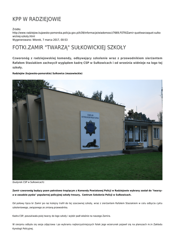 KPP W RADZIEJOWIE Źródło: http://www.radziejow.kujawsko-pomorska.policja.gov.pl/k39/informacje/wiadomosci/7669,FOTKIZamir-quottwarzaquot-sulko wickiej-szkoly.html Wygenerowano: Wtorek, 7 marca 2017, 00:53 FOTKI.ZAMIR "TWARZĄ" SUŁKOWICKIEJ SZKOŁY Czworonóg z radziejowskiej komendy, odbywający szkolenie wraz z przewodnikiem sierżantem Rafałem Stasiakiem zachwycił wyglądem kadrę CSP w Sułkowicach i od września widnieje na logo tej szkoły. Radziejów (kujawsko-pomorskie) Sułkowice (mazowieckie) (budynek CSP w Sułkowicach) Zamir czworonóg będący psem patrolowo tropiącym z Komendy Powiatowej Policji w Radziejowie wybrany został do "twarzya w zasadzie pyska" popularnej policyjnej szkoły tresury, Centrum Szkolenia Policji w Sułkowicach. Od połowy lipca br Zamir po raz kolejny trafił do tej szacownej szkoły, wraz z sierżantem Rafałem Stasiakiem w celu odbycia cyklu szkoleniowego, związanego ze zmianą przewodnika. Kadra CSP, poszukiwała psiej twarzy do logo szkoły i wybór padł właśnie na naszego Zamira. W sierpniu odbyła się sesja zdjęciowa i po wybraniu najkorzystniejszych fotek jego wizerunek pojawił się na planszach m.in Zakładu Kynologii Policyjnej. ( sierżant Rafał Stasiak z psem ZAMIR) Jest to bardzo miłe wyróżnienie dla mnie jako opiekuna i przewodnika Zamira. Po odejściu na emeryturę sierżanta sztabowego Jacka Roszaka w czerwcu br, zostałem jego nowym opiekunem. Od lipca wspólnie "uczymy się" współdziałania i odbywamy regularne szkolenie w sułkowickiej szkole tresury- mówi R. Stasiak. Na kursach jest około 60 psów wraz z przewodnikami z całego kraju, ale właśnie Zamir został wybrany na "psią twarz" sułkowickiej szkoły i obecnie będę miał przyjemność pełnić z nim codzienną służbę. Mam nadzieję, że oprócz wizualnych walorów, przyczynimy się do poprawy stanu bezpieczeństwa radziejowskiego garnizonu, na teren którego wracamy pod koniec br., przystępując do służby. (foto: sierżant Rafał Stasiak KPP Radziejów) Autor: red2.kpra Publikacja: red2.kpra Ocena: 0/5 (0) Tweetnij