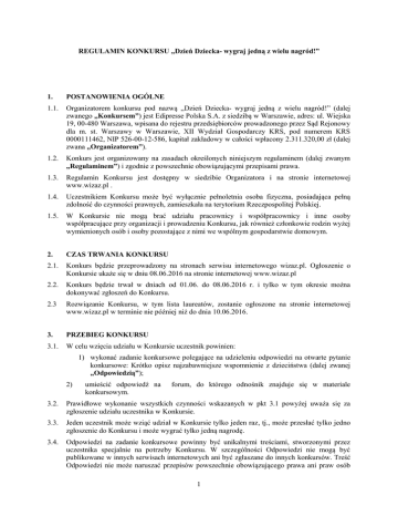 REGULAMIN KONKURSU „Dzień Dziecka- wygraj jedną z wielu nagród!” 1. POSTANOWIENIA OGÓLNE 1.1. Organizatorem konkursu pod nazwą „Dzień Dziecka- wygraj jedną z wielu nagród!” (dalej zwanego „Konkursem”) jest Edipresse Polska S.A. z siedzibą w Warszawie, adres: ul. Wiejska 19, 00-480 Warszawa, wpisana do rejestru przedsiębiorców prowadzonego przez Sąd Rejonowy dla m. st. Warszawy w Warszawie, XII Wydział Gospodarczy KRS, pod numerem KRS 0000111462, NIP 526-00-12-586, kapitał zakładowy w całości wpłacony 2.311.320,00 zł (dalej zwana „Organizatorem”). 1.2. Konkurs jest organizowany na zasadach określonych niniejszym regulaminem (dalej zwanym „Regulaminem”) i zgodnie z powszechnie obowiązującymi przepisami prawa. 1.3. Regulamin Konkursu jest dostępny w siedzibie Organizatora i na stronie internetowej www.wizaz.pl . 1.4. Uczestnikiem Konkursu może być wyłącznie pełnoletnia osoba fizyczna, posiadająca pełną zdolność do czynności prawnych, zamieszkała na terytorium Rzeczpospolitej Polskiej. 1.5. W Konkursie nie mogą brać udziału pracownicy i współpracownicy i inne osoby współpracujące przy organizacji i prowadzeniu Konkursu, jak również członkowie rodzin wyżej wymienionych osób i osoby pozostające z nimi we wspólnym gospodarstwie domowym. 2. CZAS TRWANIA KONKURSU 2.1. Konkurs będzie przeprowadzony na stronach serwisu internetowego wizaz.pl. Ogłoszenie o Konkursie ukaże się w dniu 08.06.2016 na stronie internetowej www.wizaz.pl 2.2. Konkurs będzie trwał w dniach od 01.06. do 08.06.2016 r. i tylko w tym okresie można dokonywać zgłoszeń do Konkursu. 2.3 Rozwiązanie Konkursu, w tym lista laureatów, zostanie ogłoszone na stronie internetowej www.wizaz.pl w terminie nie później niż do dnia 10.06.2016. 3. PRZEBIEG KONKURSU 3.1. W celu wzięcia udziału w Konkursie uczestnik powinien: 1) wykonać zadanie konkursowe polegające na udzieleniu odpowiedzi na otwarte pytanie konkursowe: Krótko opisz najzabawniejsze wspomnienie z dzieciństwa (dalej zwanej „Odpowiedzią”); 2) umieścić odpowiedź na konkursowym. forum, do którego odnośnik znajduje się w materiale 3.2. Prawidłowe wykonanie wszystkich czynności wskazanych w pkt 3.1 powyżej uważa się za zgłoszenie udziału uczestnika w Konkursie. 3.3. Jeden uczestnik może wziąć udział w Konkursie tylko jeden raz, tj., może przesłać tylko jedno zgłoszenie do Konkursu i może wygrać tylko jedną nagrodę. 3.4. Odpowiedzi na zadanie konkursowe powinny być unikalnymi treściami, stworzonymi przez uczestnika specjalnie na potrzeby Konkursu. W szczególności Odpowiedzi nie mogą być publikowane w innych serwisach internetowych ani być zgłaszane do innych konkursów. Treść Odpowiedzi nie może naruszać przepisów powszechnie obowiązującego prawa ani praw osób 1 trzecich, jak również nie może zawierać zwrotów powszechnie uznanych za obelżywe. Odpowiedzi na zadanie konkursowe nie spełniające wymogów Regulaminu będą wykluczane z Konkursu przez Organizatora. 3.5. W celu zapewnienia prawidłowego przebiegu Konkursu Organizator powoła trzyosobową komisję (zwaną dalej „Komisją”), w skład której wejdzie trzech przedstawicieli Organizatora. Komisja zobowiązana będzie do pełnienia nadzoru nad przestrzeganiem postanowień Regulaminu przez uczestników i podejmowania innych czynności, wskazanych w Regulaminie. W razie braku porozumienia wszystkich członków Komisji, decyzje Komisji zapadają większością głosów. 3.6. Przy wyborze najlepszych Odpowiedzi Komisja będzie się kierować własnym uznaniem, biorąc pod uwagę walory artystyczne Odpowiedzi, w szczególności oryginalność i pomysłowość uczestnika – autora Odpowiedzi, oraz adekwatność Odpowiedzi do tematu zadania konkursowego. Decyzje Komisji są ostateczne. Nie ma znaczenia kolejność zgłoszeń. 4. PRAWA AUTORSKIE. DANE OSOBOWE 4.1. Uczestnik niniejszym oświadcza, że: (i) jest jedynym autorem Odpowiedzi zgłoszonej przez niego do Konkursu; (ii) Odpowiedź nie narusza praw osób trzecich; (iii) przysługują mu wyłączne i niczym nieograniczone autorskie prawa majątkowe do Odpowiedzi; (iv) Odpowiedź nie stanowi opracowania w rozumieniu ustawy z dnia 4 lutego 1994 r. o prawie autorskim i prawach pokrewnych. 4.2. Z chwilą dokonania zgłoszenia do Konkursu Uczestnik udziela Organizatorowi niewyłącznej, nieodpłatnej licencji do zgłoszonej w Konkursie Odpowiedzi, zwanej dalej „Utworem”, w celu przeprowadzenia Konkursu, w szczególności w celu zamieszczenia Odpowiedzi w serwisie www.wizaz.pl, na czas trwania Konkursu, bez ograniczeń terytorialnych, na następujących polach eksploatacji: 4.3. 4.4. 1) zwielokrotnianie określoną techniką egzemplarzy Utworu, w tym techniką drukarską, reprograficzną, zapisu magnetycznego oraz techniką cyfrową; 2) publiczne wykonanie, wystawienie, wyświetlenie, odtworzenie oraz nadawanie i reemitowanie, jak również publiczne udostępnianie Utworu w taki sposób, aby każdy mógł mieć do niego dostęp w miejscu i w czasie przez siebie wybranym (Internet), w tym w serwisach mobilnych i w aplikacjach mobilnych. Laureat wyłoniony w wyniku procedury opisanej w pkt 3 Regulaminu, z chwilą zawiadomienia laureata o wygranej w Konkursie, udziela każdemu z osobna, niewyłącznej, nieodpłatnej licencji do zgłoszonej w Konkursie Odpowiedzi, zwanej dalej „Utworem”, na okres 5 lat, bez ograniczeń terytorialnych, wraz z prawem do sublicencji na rzecz osób trzecich, na polach eksploatacji wskazanych w pkt 4.2 powyżej oraz: 1) wprowadzanie do obrotu, użyczenie lub najem oryginału albo egzemplarzy Utworu; 2) wykorzystanie Utworu i jego fragmentów w celach promocyjnych i reklamowych, we wszelkich formach reklamy i promocji, w tym: w formie reklamy prasowej, telewizyjnej, kinowej, zewnętrznej i internetowej, na dowolnych stronach i domenach internetowych i w serwisach mobilnych, w materiałach i gadżetach promocyjno-
