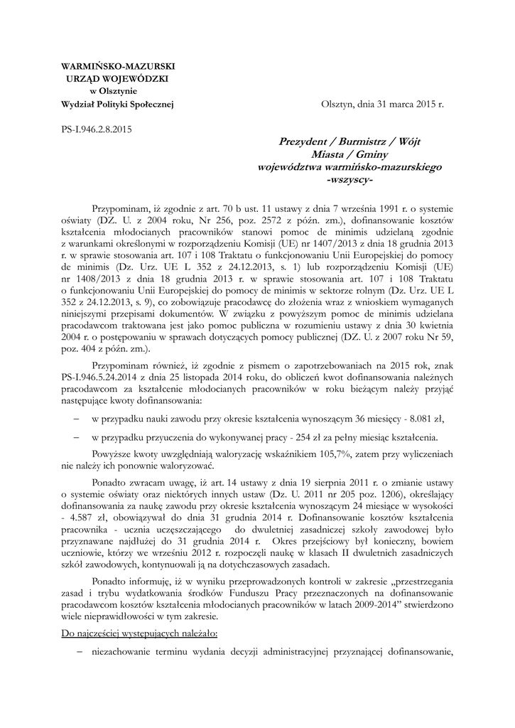 WARMIŃSKO-MAZURSKI URZĄD WOJEWÓDZKI w Olsztynie Wydział Polityki Społecznej PS-I.946.2.8.2015 Olsztyn, dnia 31 marca 2015 r. Prezydent / Burmistrz / Wójt Miasta / Gminy województwa warmińsko-mazurskiego -wszyscy- Przypominam, iż zgodnie z art. 70 b ust. 11 ustawy z dnia 7 września 1991 r. o systemie oświaty (DZ. U. z 2004 roku, Nr 256, poz. 2572 z późn. zm.), dofinansowanie kosztów kształcenia młodocianych pracowników stanowi pomoc de minimis udzielaną zgodnie z warunkami określonymi w rozporządzeniu Komisji (UE) nr 1407/2013 z dnia 18 grudnia 2013 r. w sprawie stosowania art. 107 i 108 Traktatu o funkcjonowaniu Unii Europejskiej do pomocy de minimis (Dz. Urz. UE L 352 z 24.12.2013, s. 1) lub rozporządzeniu Komisji (UE) nr 1408/2013 z dnia 18 grudnia 2013 r. w sprawie stosowania art. 107 i 108 Traktatu o funkcjonowaniu Unii Europejskiej do pomocy de minimis w sektorze rolnym (Dz. Urz. UE L 352 z 24.12.2013, s. 9), co zobowiązuje pracodawcę do złożenia wraz z wnioskiem wymaganych niniejszymi przepisami dokumentów. W związku z powyższym pomoc de minimis udzielana pracodawcom traktowana jest jako pomoc publiczna w rozumieniu ustawy z dnia 30 kwietnia 2004 r. o postępowaniu w sprawach dotyczących pomocy publicznej (DZ. U. z 2007 roku Nr 59, poz. 404 z późn. zm.). Przypominam również, iż zgodnie z pismem o zapotrzebowaniach na 2015 rok, znak PS-I.946.5.24.2014 z dnia 25 listopada 2014 roku, do obliczeń kwot dofinansowania należnych pracodawcom za kształcenie młodocianych pracowników w roku bieżącym należy przyjąć następujące kwoty dofinansowania: w przypadku nauki zawodu przy okresie kształcenia wynoszącym 36 miesięcy - 8.081 zł, w przypadku przyuczenia do wykonywanej pracy - 254 zł za pełny miesiąc kształcenia. Powyższe kwoty uwzględniają waloryzację wskaźnikiem 105,7%, zatem przy wyliczeniach nie należy ich ponownie waloryzować. Ponadto zwracam uwagę, iż art. 14 ustawy z dnia 19 sierpnia 2011 r. o zmianie ustawy o systemie oświaty oraz niektórych innych ustaw (Dz. U. 2011 nr 205 poz. 1206), określający dofinansowania za naukę zawodu przy okresie kształcenia wynoszącym 24 miesiące w wysokości - 4.587 zł, obowiązywał do dnia 31 grudnia 2014 r. Dofinansowanie kosztów kształcenia pracownika - ucznia uczęszczającego do dwuletniej zasadniczej szkoły zawodowej było przyznawane najdłużej do 31 grudnia 2014 r. Okres przejściowy był konieczny, bowiem uczniowie, którzy we wrześniu 2012 r. rozpoczęli naukę w klasach II dwuletnich zasadniczych szkół zawodowych, kontynuowali ją na dotychczasowych zasadach. Ponadto informuję, iż w wyniku przeprowadzonych kontroli w zakresie „przestrzegania zasad i trybu wydatkowania środków Funduszu Pracy przeznaczonych na dofinansowanie pracodawcom kosztów kształcenia młodocianych pracowników w latach 2009-2014” stwierdzono wiele nieprawidłowości w tym zakresie. Do najczęściej występujących należało: niezachowanie terminu wydania decyzji administracyjnej przyznającej dofinansowanie, od momentu złożenia wniosku przez pracodawcę; wypłacanie pracodawcom środków Funduszu Pracy za kształcenie młodocianych pracowników, przed terminem kiedy decyzja administracyjna stała się ostateczna, przy czym nie można było stwierdzić, ze względu na brak kwoty we wniosku pracodawcy, że była zgodna z żądaniem strony nie biorąc tym samym oświadczenia od pracodawcy w tym zakresie; przekazywane środków Funduszu Pracy za kształcenie młodocianych pracowników na konta pracodawców w dniu wystawienia decyzji administracyjnej i przed jej odebraniem przez pracodawcę; wydawanie zaświadczeń dla pracodawców wystawianych przy udzielaniu pomocy publicznej z błędną datą jej udzielenia; przekazywanie sprawozdań w systemie SHRiMP (Systemie Harmonogramowania Rejestracji i Monitorowania Pomocy) do UOKiK w Warszawie bez zachowania ustawowego terminu; wzywanie przez gminę do usunięcia braków formalnych pracodawców na podstawie niewłaściwej ustawy; sposób naliczania kwot dotacji, co skutkowało wypłatą wyższego bądź niższego dofinansowania niż należny pracodawcom za kształcenie młodocianych pracowników. nieuwzględnianie w zapotrzebowaniach składnych do Urzędu Wojewódzkiego wniosków złożonych przez pracodawców w danym roku budżetowym i złożenie ich w roku następnym; składanie zapotrzebowań na środki Funduszu Pracy do W-MUW na podstawie ustnie złożonego zapotrzebowania przez pracodawcę, bez pisemnego wniosku; dokonywanie zwrotów niewykorzystanych środków oraz odsetek na konto Warmińsko -Mazurskiego Urzędu Wojewódzkiego w Olsztynie po terminie zapisanym w porozumieniu; powierzenie realizacji omawianego zadania finansowego jednostce podległej, np. Zespołowi Ekonomicznej Obsługi Szkół i Przedszkoli wyłącznie na podstawie ustnego upoważnienia; ewidencjonowanie rozrachunków z Funduszu Pracy oraz rozrachunków od tych środków na kontach innych niż 139 i 240; wskazywanie w porozumieniu z Funduszu Pracy do przelewów rachunku bankowego innego niż ustawowo wymaganego - wyodrębnionego rachunku bankowego służącego do obsługi środków z FP, nieprzestrzeganie terminów określonych w porozumieniu na przesyłanie wniosków i rozliczeń z Funduszu Pracy. W związku z przedstawionymi wyżej nieprawidłowościami i uchybieniami w celu unormowania zasad prowadzenia zadania pt. „dofinansowanie pracodawcom kosztów kształcenia młodocianych pracowników ze środków Funduszu Pracy”, uprzejmie proszę i zalecam: zachować miesięczny termin wydawania decyzji administracyjnej od dnia wpłynięcia wniosku od pracodawcy, zgodnie z kpa; przekazywać dla pracodawców środki z FP, po terminie kiedy decyzje stały się ostateczne, chyba że są zgodne z żądaniem strony, tj. kwotą wskazaną na wniosku lub przyjmować oświadczenia od pracodawcy w tym zakresie. przedłużać termin rozpatrzenia wniosku, zgodnie z Kpa, tj. przy spr