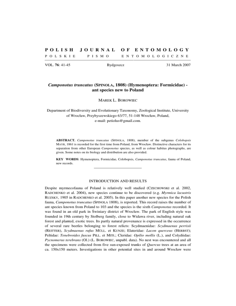 P O L I S H J O U R N A L P O L S K I E P I S M O VOL. 76: 41-45 O F E N T O M O L O G Y E N T O M O L O G I C Z N E Bydgoszcz 31 March 2007 Camponotus truncatus (SPINOLA, 1808) (Hymenoptera: Formicidae) ant species new to Poland MAREK L. BOROWIEC Department of Biodiversity and Evolutionary Taxonomy, Zoological Institute, University of Wrocław, Przybyszewskiego 63/77, 51-148 Wrocław, Poland, e-mail: [email protected]. ABSTRACT. Camponotus truncatus (SPINOLA, 1808), member of the subgenus Colobopsis MAYR, 1861 is recorded for the first time from Poland, from Wrocław. Distinctive characters for its separation from other European Camponotus species, as well as colour habitus photographs, are given. Some notes on its biology and distribution are also provided. KEY WORDS: Hymenoptera, Formicidae, Colobopsis, Camponotus truncatus, fauna of Poland, new records. INTRODUCTION AND RESULTS Despite myrmecofauna of Poland is relatively well studied (CZECHOWSKI et al. 2002, RADCHENKO et al. 2004), new species continue to be discovered (e.g. Myrmica lacustris RUZSKY, 1905 in RADCHENKO et al. 2005). In this paper another new species for the Polish fauna, Camponotus truncatus (SPINOLA 1808), is reported. This record raises the number of ant species known from Poland to 103 and the species is the sixth Camponotus recorded. It was found in an old park in Świniary district of Wrocław. The park of English style was founded in 19th century by Stolberg family, close to Widawa river, including natural oak forest and planted, exotic trees. Its partly natural provenance is expressed in the occurrence of several rare beetles belonging to forest relicts: Scydmaenidae: Scydmaenus perrisii (REITTER), Scydmaenus rufus MÜLL. et KUNZE; Elateridae: Lacon querceus (HERBST); Peltidae: Tenebroides fuscus PILL. et MITt.; Cleridae: Opilio mollis (L.), and Colydiidae: Pycnomerus terebrans (Ol.) (L. BOROWIEC, unpubl. data). No nest was encountered and all the specimens were collected from five sun-exposed trunks of Quercus trees at an area of ca. 150x150 meters. Investigations in other potential sites in and around Wrocław were Polish Journal of Entomology 76 (1) 42 unsuccessful. At latitude of 51º12’N, the site is by far the norternmost of known species range, reaching 50º30’ N in Germany (SEIFERT 1996). Settling whether the species occurence in this site is due to introduction, occasional successful colony foundation by airborne queen from south, recent range expansion or is the site a relict, remains speculative. Material examined 20 minor workers. Lower Silesia, Wrocław – Świniary (51º12’ N 16º59’ E; UTM: XS37), 4 V 2006, leg. L. BOROWIEC, and 6 V 2006, leg. L. BOROWIEC & M. L. BOROWIEC. Voucher specimens in M. L. BOROWIEC private collection and Museum and Institute of Zoology, Polish Academy of Sciences, Warsaw. REMARKS ON DISTRIBUTION, IDENTIFICATION AND BIOLOGY Camponotus MAYR, 1861 is the largest and most diverse ant genus with more than 1500 taxa described worldwide (SHATTUCK 1999). Phylogenetic relationships among species are poorly resolved and genus is provisionally divided into 46 subgenera. Five species in two subgenera (Camponotus s. str. and Myrmentoma FOREL, 1912) have been reported from Poland so far. Camponotus truncatus is the first member of the subgenus Colobopsis MAYR, 1861 known from Poland. Most of about 115 described species and subspecies are known from warm and tropical regions of Southeast Asia, Australasia and North America, and in Europe the subgenus Colobopsis is represented by this sole species (BOLTON et al. 2006). Until now, it has been recorded from Albania, Austria, Bulgaria, Cyprus, Czech Republic, Turkey, France, Germany, Greece, Hungary, Italia, Macedonia, Malta, Portugal, Romania, Southern Russia, Slovakia, Slovenia, Spain, Switzerland, Ukraine and Yugoslavia (RADCHENKO 2005). Outside Europe, it is known to occur in North-Western Africa, Crimea, Caucasus, Kopet Dag and Middle East (RADCHENKO 1996). It has never been recorded from Finland, as erroneously stated in Fauna Europaea (RADCHENKO pers. comm.). Camponotus truncatus is representing, according to classificaton in CZECHOWSKI et al. 2002, Euro-Caucasian zoogeographical element, meaning that this species is distributed mainly in deciduous and partly mixed forest zone in Europe and Caucasia. Species of this subgenus are dendrobionts; i.e. nesting in wood, and colonies are monogynous (ATANASSOV & DLUSSKY 1992). Strict worker dimorphism occurs, meaning that two morphologically distinct size groups (soldiers and minor workers) with no intermediates are present. Queens and soldier subcaste are highly distinctive because of their obliquely or perpendicularly truncated anterior part of head (Figs 3, 5), which is used to plug nest entrances. Such phenomenon is known under the name phragmosis (HÖLLDOBLER & WILSON 1990). BOROWIEC L. M.: Camponotus truncatus (SPINOLA, 1808) (Hymenoptera: 43 The species is distinctive in its morphology and it usually falls out in the first couplet in regional keys to species of the genus. However, its identification can be difficult when using some popular identification sources. The reason is that commonly used keys (particularly AGOSTI & COLLINGWOOD 1987) use the sole character of truncated head without pointing out that it applies to queens and soldiers only. This may be confusing because soldiers of C. truncatus leave nests only seldomly and minor workers are much more frequently encountered. BERNARD (1967) gives straight frontal carinae as a distinguishing character (versus S-shaped) for Colobopsis in Europe. With worker body 3.0-6.0 mm in length, the presence of metanotal groove, yellowish band on the gaster and red-brownish overall body colour, this allows certain separation from other European Camponotus (ATANASSOV & DLUSSKY 1992, RADCHENKO 1996). It is worthy to note that minor workers of C. truncatus can look similar in the field to the more common in central Europe Dolichoderus 