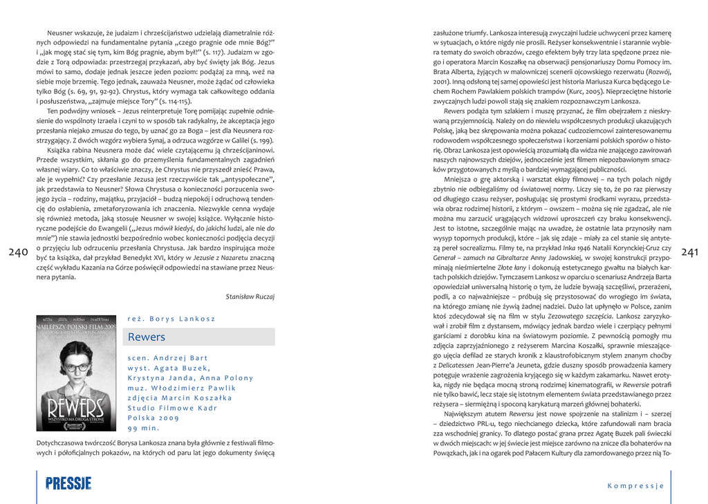 240 Neusner wskazuje, że judaizm i chrześcijaństwo udzielają diametralnie różnych odpowiedzi na fundamentalne pytania „czego pragnie ode mnie Bóg?” i „jak mogę stać się tym, kim Bóg pragnie, abym był?” (s. 117). Judaizm w zgodzie z Torą odpowiada: przestrzegaj przykazań, aby być święty jak Bóg. Jezus mówi to samo, dodaje jednak jeszcze jeden poziom: podążaj za mną, weź na siebie moje brzemię. Tego jednak, zauważa Neusner, może żądać od człowieka tylko Bóg (s. 69, 91, 92-92). Chrystus, który wymaga tak całkowitego oddania i posłuszeństwa, „zajmuje miejsce Tory” (s. 114-115). Ten podwójny wniosek – Jezus reinterpretuje Torę pomijając zupełnie odniesienie do wspólnoty Izraela i czyni to w sposób tak radykalny, że akceptacja jego przesłania niejako zmusza do tego, by uznać go za Boga – jest dla Neusnera rozstrzygający. Z dwóch wzgórz wybiera Synaj, a odrzuca wzgórze w Galilei (s. 199). Książka rabina Neusnera może dać wiele czytającemu ją chrześcijaninowi. Przede wszystkim, skłania go do przemyślenia fundamentalnych zagadnień własnej wiary. Co to właściwie znaczy, że Chrystus nie przyszedł znieść Prawa, ale je wypełnić? Czy przesłanie Jezusa jest rzeczywiście tak „antyspołeczne”, jak przedstawia to Neusner? Słowa Chrystusa o konieczności porzucenia swojego życia – rodziny, majątku, przyjaciół – budzą niepokój i odruchową tendencję do osłabienia, zmetaforyzowania ich znaczenia. Niezwykle cenna wydaje się również metoda, jaką stosuje Neusner w swojej książce. Wyłącznie historyczne podejście do Ewangelii („Jezus mówił kiedyś, do jakichś ludzi, ale nie do mnie”) nie stawia jednostki bezpośrednio wobec konieczności podjęcia decyzji o przyjęciu lub odrzuceniu przesłania Chrystusa. Jak bardzo inspirująca może być ta książka, dał przykład Benedykt XVI, który w Jezusie z Nazaretu znaczną część wykładu Kazania na Górze poświęcił odpowiedzi na stawiane przez Neusnera pytania. Stanisław Ruczaj reż. Borys Lankosz Rewers scen. Andrzej Bart wyst. Agata Buzek, Krystyna Janda, Anna Polony muz. Włodzimierz Pawlik zdjęcia Marcin Koszałka Studio Filmowe Kadr Polska 2009 99 min. Dotychczasowa twórczość Borysa Lankosza znana była głównie z festiwali filmowych i półoficjalnych pokazów, na których od paru lat jego dokumenty święcą zasłużone triumfy. Lankosza interesują zwyczajni ludzie uchwyceni przez kamerę w sytuacjach, o które nigdy nie prosili. Reżyser konsekwentnie i starannie wybiera tematy do swoich obrazów, czego efektem były trzy lata spędzone przez niego i operatora Marcin Koszałkę na obserwacji pensjonariuszy Domu Pomocy im. Brata Alberta, żyjących w malowniczej scenerii ojcowskiego rezerwatu (Rozwój, 2001). Inną odsłoną tej samej opowieści jest historia Mariusza Kurca będącego Lechem Rochem Pawlakiem polskich trampów (Kurc, 2005). Nieprzeciętne historie zwyczajnych ludzi powoli stają się znakiem rozpoznawczym Lankosza. Rewers podąża tym szlakiem i muszę przyznać, że film obejrzałem z nieskrywaną przyjemnością. Należy on do niewielu współczesnych produkcji ukazujących Polskę, jaką bez skrępowania można pokazać cudzoziemcowi zainteresowanemu rodowodem współczesnego społeczeństwa i korzeniami polskich sporów o historię. Obraz Lankosza jest opowieścią zrozumiałą dla widza nie znającego zawirowań naszych najnowszych dziejów, jednocześnie jest filmem niepozbawionym smaczków przygotowanych z myślą o bardziej wymagającej publiczności. Mniejsza o grę aktorską i warsztat ekipy filmowej – na tych polach nigdy zbytnio nie odbiegaliśmy od światowej normy. Liczy się to, że po raz pierwszy od długiego czasu reżyser, posługując się prostymi środkami wyrazu, przedstawia obraz rodzimej historii, z którym – owszem – można się nie zgadzać, ale nie można mu zarzucić urągających widzowi uproszczeń czy braku konsekwencji. Jest to istotne, szczególnie mając na uwadze, że ostatnie lata przynosiły nam wysyp topornych produkcji, które − jak się zdaje − miały za cel stanie się antytezą pereł socrealizmu. Filmy te, na przykład Inka 1946 Natalii Korynckiej-Gruz czy Generał – zamach na Gibraltarze Anny Jadowskiej, w swojej konstrukcji przypominają nieśmiertelne Złote łany i dokonują estetycznego gwałtu na białych kartach polskich dziejów. Tymczasem Lankosz w oparciu o scenariusz Andrzeja Barta opowiedział uniwersalną historię o tym, że ludzie bywają szczęśliwi, przerażeni, podli, a co najważniejsze – próbują się przystosować do wrogiego im świata, na którego zmianę nie żywią żadnej nadziei. Dużo lat upłynęło w Polsce, zanim ktoś zdecydował się na film w stylu Zezowatego szczęścia. Lankosz zaryzykował i zrobił film z dystansem, mówiący jednak bardzo wiele i czerpiący pełnymi garściami z dorobku kina na światowym poziomie. Z pewnością pomogły mu zdjęcia zaprzyjaźnionego z reżyserem Marcina Koszałki, sprawnie mieszającego ujęcia defilad ze starych kronik z klaustrofobicznym stylem znanym choćby z Delicatessen Jean-Pierre’a Jeuneta, gdzie duszny sposób prowadzenia kamery potęguje wrażenie zagrożenia kryjącego się w każdym zakamarku. Nawet erotyka, nigdy nie będąca mocną stroną rodzimej kinematografii, w Rewersie potrafi nie tylko bawić, lecz staje się istotnym elementem świata przedstawianego przez reżysera – siermiężną i spoconą karykaturą marzeń głównej bohaterki. Największym atutem Rewersu jest nowe spojrzenie na stalinizm i – szerzej – dziedzictwo PRL-u, tego niechcianego dziecka, które zafundowali nam bracia zza wschodniej granicy. To dlatego postać grana przez Agatę Buzek pali świeczki w dwóch miejscach: w jej świecie jest miejsce zarówno na znicze dla bohaterów na Powązkach, jak i na ogarek pod Pałacem Kultury dla zamordowanego przez nią To- Kompressje 241 porka – aman