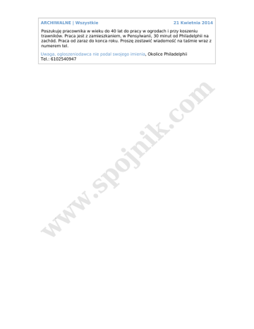 ARCHIWALNE | Wszystkie 21 Kwietnia 2014 Poszukuję pracownika w wieku do 40 lat do pracy w ogrodach i przy koszeniu trawników. Praca jest z zamieszkaniem, w Pensylwanii, 30 minut od Philadelphii na zachód. Praca od zaraz do konca roku. Proszę zostawić wiadomość na taśmie wraz z numerem tel. w w w .s po jn ik .c o m Uwaga, ogloszeniodawca nie podal swojego imienia, Okolice Philadelphii Tel.: 6102540947