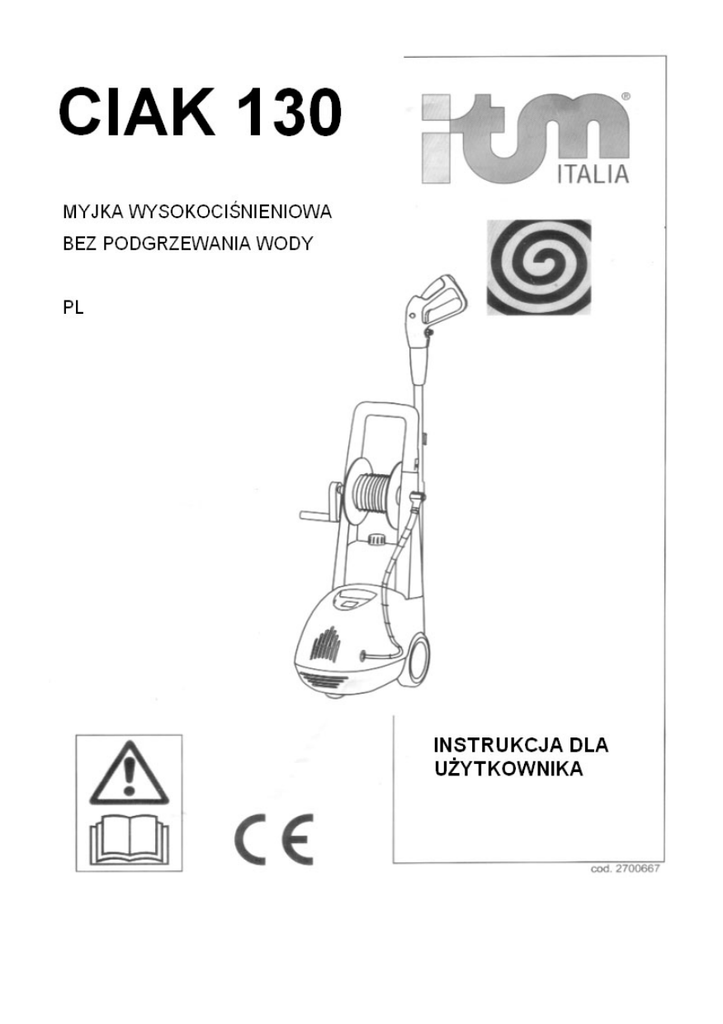 SPIS TREŚCI MYJKA WYSOKOCIŚNIENIOWA CIAK 130 1. TABLICZKA ZNAMIONOWA 2. OPIS URZĄDZENIA 3. ZASTOSOWANIE 4. ZASADY BEZPIECZEŃSTWA 5. INSTRUKCJA UŻYTKOWANIA 6. SCHEMAT ELEKTRYCZNY 7. ROZWIĄZYWANIE PROBLEMÓW 8. CERTYFIKAT ZGODNOŚCI CE WARUNKI GWARANCJI 1. TABLICZKA ZNAMIONOWA MODEL NR KATALOGOWY NR SERYJNY ZASILANIE ROK MOC CIŚNIENIE PRZEPŁYW MAX TEMP. 2. OPIS URZĄDZENIA Model Max Ciśnienie Przepływ CIAK 130 Bar 130 Lt/h 6/6 Max ciśnienie wody dostarczanej Bar 4 Moc Zasilanie Obroty silnika Kw 1,6 V/Hz 230/50 O/m 2800 Max temp. Dostarczanej wody °C 50 Długość węża Wa ga Wymiary M 7 Kg 15 Cm 53X53X36 Opis urządzenia: 1. Wlot wody 2. Wyłącznik główny 3. Zbiornik na detergent 4. Korbka bębna 5. Bęben na wąż 6. Wąż wysokiego ciśnienia 7. Wylot węża wysokociśnieniowego 8. Wózek jezdny 9. Uchwyt 10. Rączka 11. Pistolet 3. ZASTOSOWANIE Zimno wodna myjka wysokociśnieniowa Ciak 130 jest wysoko wyspecjalizowanym urządzeniem z dobrym systemem zabezpieczeń, który może być stosowany do mycia i czyszczenia samochodów, rowerów lub innego sprzętu do użytku na zewnątrz oraz altanek ogrodowych, szklarni itp. 4. ZASADY BEZPIECZEŃSTWA UWAGA: Przeczytaj uważnie instrukcję przed użyciem urządzenia. Aby zmniejszyć ryzyko zranienia, należy zachować szczególną ostrożność podczas używania myjki w pobliżu dzieci. Myjka wysokociśnieniowa nie może być używana przez dzieci lub osoby nie przeszkolone. Proszę zaznajomić się instrukcją włączania/wyłączania urządzenia i wypuszczania zbędnego ciśnienia. Zapoznaj się z kontrolkami. Podczas używania urządzenia proszę zachować ostrożność. Nie używaj myjki jeśli jesteś zmęczony lub pod wpływem alkoholu. W zasięgu działania myjki nie powinny przebywać żadne osoby oprócz operatora. Podczas pracy z myjką zachowaj stabilną pozycję. Przestrzegaj zaleceń dotyczących konserwacji urządzenia zawartych w tej instrukcji. Ten produkt musi być uziemiony. W razie jakichkolwiek zakłóceń lub awarii uziemienie zapewnia opór dla zasilania w celu zmniejszenia ryzyka porażenia prądem. Wtyczka musi być podłączona do właściwie zainstalowanego i uziemionego gniazda (zgodnie z lokalnymi przepisami). Zasilanie urządzenia musi być zgodne z zasilaniem dostarczanym przez lokalną sieć. Jeśli masz wątpliwości, czy gniazdo jest właściwie uziemione, zwróć się o pomoc do wykwalifikowanego elektryka lub obsługi technicznej. Nie zmieniaj wtyczki dostarczanej przez producenta. Jeśli nie pasuje do gniazda – zainstaluj odpowiednie gniazdo. Nie wolno stosować żadnego rodzaju redukcji/adapterów z tym urządzeniem. Używaj jedynie 3-żyłowych przedłużaczy z wtyczką z uziemieniem, która pasuje do wtyczki dostarczanej przez producenta. Stosuj wyłącznie przedłużacze przystosowane do pracy na zewnątrz z wodoodpornym przyłączem wtyczki. Przedłużacze muszą mieć parametry elektryczne nie mniejsze, niż parametry produktu. Nie używaj uszkodzonych przewodów – w razie uszkodzenia należy wymienić przewód. Przed każdym użyciem sprawdź przedłużacz i jeśli jest uszkodzony – wymień. Niewłaściwe przedłużacze mogą stanowić zagrożenie. Nie wolno szarpać za przewód, należy trzymać go z dala źródeł ciepła i ostrych przedmiotów. Przed odłączeniem przewodu urządzenia od przedłużacza należy wyjąć wtyczkę przedłużacza z gniazda. W przypadku użycia przedłużaczy zasad: długość przedłużacza może przekroju 2,5 mm2, i do 50 m dla Połączenie pomiędzy przewodem i zgodnie z zasadami. należy przestrzegać następujących wynosić do 25m dla przewodów o przewodów o przekroju do 4 mm2. przedłużaczem musi być wykonane Jeśli przewód zasilający jest uszkodzony musi być wymieniony na przewód dostarczony przez producenta lub przedstawiciela. Nie wolno zmieniać długości przewodu. Aby zmniejszyć ryzyko porażenia prądem nie włączaj i nie używaj urządzenia podczas deszczu lub burzy. Wszystkie połączenia powinny być suche i trzymane nad ziemią. Nie dotykaj wtyczki mokrymi rękoma. Absolutnie nie wolno dopuścić, by woda dostawała się z zewnątrz do urządzenia. Po włączeniu urządzenia przy zamkniętym pistolecie wewnętrzny przepływ może osiągnąć 11-12 l/m, a temperatura może znacznie wzrosnąć, co może spowodować uszkodzenie myjki po dłuższym czasie - aby tego uniknąć, nie należy zamykać pistoletu na więcej niż 4 minuty. Podczas pracy urządzenia zapewnij stały dopływ wody. Bez odpowiedniego przepływu wody (ok.10 l/h ) może dojść do zniszczenia uszczelek w myjce. Pistolet z lancą powinien zostać otwarty najpóźniej w ciągu 1 - 2 minut od momentu włączenia urządzenia. W przeciwnym wypadku temperatura wody cyrkulującej wewnątrz urządzenia szybko wzrośnie do punktu, w którym ulegną uszkodzeniu uszczelki wewnątrz myjki. Nie włączaj i nie używaj myjki przy niskich temperaturach, aby uniknąć zamrożenia wody. To urządzenie zostało zaprojektowane do użytku z czysta wodą – nie wolno używać żrących chemikaliów. Nie używaj myjki w pobliżu ludzi – chyba, że mają na sobie ubranie ochronne. Strumień myjki wysokociśnieniowej może być niebezpieczny, jeśli niewłaściwie użyty. Nigdy nie kieruj strumienia wody na ludzi, urządzenia elektryczne pod napięciem czy też na samą myjkę. Nigdy nie kieruj strumienia myjki na siebie lub innych w celu oczyszczenia odzieży. Przed podjęciem jakichkolwiek działań konserwacyjnych odłącz urządzenie od zasilania. Aby zapewnić bezpieczeństwo proszę używać jedynie oryginalnych części zamiennych dostarczonych lub zatwierdzonych przez producenta. W razie uszkodzenia jakiejś części nie wolno używać urządzenia zanim ta część nie zostanie wymieniona. 5. INSTRUKCJA UŻYTKOWANIA - Podłącz wąż wysokociśnieniowy do urządzenia, następnie podłącz do węża pistolet. Przyłącz dyszę i jej przedłużenie. Sprawdź, czy filtr ni