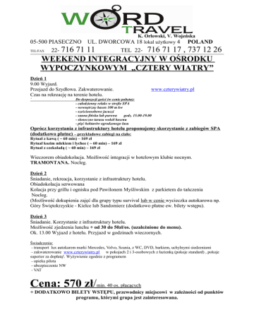K. Orłowski, V. Wojeńska 05-500 PIASECZNO UL. DWORCOWA 18 lokal użytkowy 4 POLAND 71 11 TEL 22- 716 71 17 , 737 12 26 WEEKEND INTEGRACYJNY W OŚRODKU WYPOCZYNKOWYM „CZTERY WIATRY” TEL/FAX 22- 716 Dzień 1 9.00 Wyjazd. Przejazd do Szydłowa. Zakwaterowanie. Czas na rekreację na terenie hotelu. ` www.czterywiatry.pl Do dyspozycji gości (w cenie pobytu): - całodzienny relaks w strefie SPA - wewnętrzny basen 100 m kw - sześcioosobowe jacuzzi - sauna fińska lub parowa godz. 15.00-19.00 - słoneczne tarasu wokół basenu - pięć hektarów ogrodzonego lasu Oprócz korzystania z infrastruktury hotelu proponujemy skorzystanie z zabiegów SPA (dodatkowo płatne) – przykładowe zabiegi na ciało: Rytuał z kawą ( ~ 60 min) – 169 zł Rytuał kozim mlekiem i lychee ( ~ 60 min) – 169 zł Rytuał z czekoladą ( ~ 60 min) – 169 zł Wieczorem obiadokolacja. Możliwość integracji w hotelowym klubie nocnym. TRAMONTANA. Nocleg. Dzień 2 Śniadanie, rekreacja, korzystanie z infrastruktury hotelu. Obiadokolacja serwowana Kolacja przy grillu i ognisku pod Pawilonem Myśliwskim z parkietem do tańczenia Nocleg. (Możliwość dokupienia zajęć dla grupy typu survival lub w cenie wycieczka autokarowa np. Góry Świętokrzyskie - Kielce lub Sandomierz (dodatkowo płatne ew. bilety wstępu). Dzień 3 Śniadanie. Korzystanie z infrastruktury hotelu. Możliwość zjedzenia lunchu + od 30 do 50zł/os. (uzależnione do menu). Ok. 13.00 Wyjazd z hotelu. Przyjazd w godzinach wieczornych. Świadczenia: - transport lux autokarem marki Mercedes, Volvo, Scania, z WC, DVD, barkiem, uchylnymi siedzeniami - zakwaterowanie www.czterywiatry.pl w pokojach 2 i 3-osobowych z łazienką (pokoje standard) , pokoje superior za dopłatą!. Wyżywienie zgodnie z programem - opieka pilota - ubezpieczenie NW - VAT Cena: 570 zł/min. 40 os. płacących + DODATKOWO BILETY WSTĘPU, przewodnicy miejscowi w zależności od punktów programu, którymi grupa jest zainteresowana.