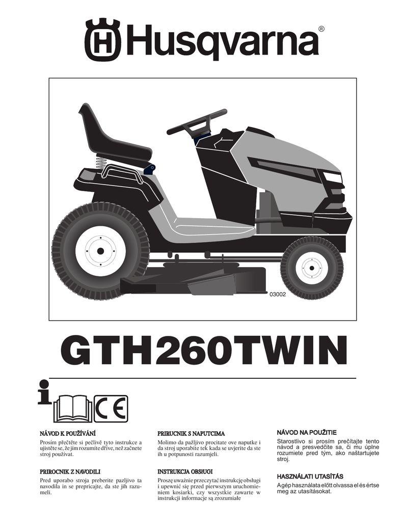 03002 GTH260TWIN NÁVOD K POUŽÍVÁNÍ Prosím pøeètìte si peèlivì tyto instrukce a ujistìte se, že jím rozumíte døíve, než zaènete stroj používat. PRIRUCNIK S NAPUTCIMA Molimo da pažljivo procitate ove naputke i da stroj uporabite tek kada se uvjerite da ste ih u potpunosti razumjeli. NÁVOD NA POUŽITIE Starostlivo si prosím prečítajte tento návod a presvedčite sa, či mu úplne rozumiete pred tým, ako naštartujete stroj. PRIROCNIK Z NAVODILI Pred uporabo stroja preberite pazljivo ta navodila in se prepricajte, da ste jih razumeli. INSTRUKCJA OBS³UGI Proszê uwa¿nie przeczytaæ instrukcjê obs³ugi i upewniæ siê przed pierwszym uruchomieniem kosiarki, czy wszystkie zawarte w instrukcji informacje s¹ zrozumia³e HASZNÁLATI UTASÍTÁS A gép használata előtt olvassa el és értse meg az utasításokat. 1 Bezpeènostní pokyny Varnostni predpisi Sigurnosni propisi Zasady Zachowania Bezpieczeństwa Bezpečnostné pravidlá Biztonsági előírások 2 Montáž Sestavljanje Sklapanje Montaż Montáž Összeszerelés 18 3 Popis funkcí Funkcionalni opis Funkcijki opis Opis Przyrz¹dów Sterowniczych Popis funkcií Működési leírás 26 4 Pøed nastartováním Pred zagonom Prije pokretanja motora Przygotowanie Do Uruchomienia Pred naštartovaním Beindítás előtt 36 5 Provoz Vožnja Vožnja Jazda-Koszenie Riadenie Vezetés 38 6 Údržba a seøízení Vzdrževanje, nastavitve Održavanje, podešavanje Obs³uga Techniczn¹ Regulacje Opravy a nastavovanie Karbantartás, beállítás 49 7 Hledání a odstranìní závad Odpravljanje težav Pronalaženje kvarova Przyczyny Najczęœciej Spotykanych Niesprawnoœci Riešenie problémov Hibakeresés 77 8 Uložení Shranjevanje Skladištenje Prezechowywanie Uskladnenie Tárolás 80 Vyhrazujeme si právo provádìt zmìny bez pøedchozího uvìdomìní. Pridržujemo si pravico do sprememb brez predhodnega obvestila. Zadržavamo si pravo na unošenje izmjena bez prethodnog obaviještavanja. Producent zastrzega sobie prawo do wprowadzenia zmian i modyfikacji bez uprzedniego zwaiadomienia. Vyhradzujeme si právo vykonávať zmeny bez predchádzajúceho upozornenia. A vállalat fenntartja a jogot, hogy előzetes értesítés nélkül változtatásokat hozzon. 2 3 1. Bezpečnostní pravidla Bezpeèný provoz na traktorových sekaèkách DÙLEŽITÉ: TATO TRAKTOROVÁ SEKAÈKA DOKÁŽE USEKNOUT RUCE A NOHY A ODMRŠT’OVAT PØEDMÌTY. NEDODRŽENÍ NÁSLEDUJÍCÍCH BEZPEÈNOSTNÍCH POKYNÙ MÙŽE MÍT ZA NÁSLEDEK VÁŽNÁ NEBO SMRTELNÁ PORANÌNÍ. I. Školení Školení – prùprava CZ III. Provoz • Peèlivì si pøeètìte instrukce. Seznamte se s ovládacími prvky a správným použitím stroje. • Nikdy nedovolte dìtem, nebo osobám, které nebyly seznámeny s tìmito instrukcemi, aby použily sekaèku. Sekaèku nesmí obsluhovat osoby mladší 18 let. • Nikdy nesekejte, pokud se v blízkosti pohybují lidé, zejména dìtí a domácí zvíøata. • Mějte vždy na paměti, že obsluha stroje nebo uživatel, je odpovědný za nehody nebo za škody, způsobené jiným osobám nebo na jejich majetku. • Nepøevážejte lidi. • Všichni řidiči musí získat odborné instrukce a praktické zkušenosti. Takovéto instrukce by měly zdůrazňovat: - nutnost být opatrní a soustředění při práci na traktorové sekačce; - že použitím brzdy, nelze získat zpět kontrolu nad traktorovou sekačkou, která se klouže se svahu. Hlavními dùvodu ztráty kontroly jsou: a) nedostateèná trakce kol b) pøíliš rychlá jízda c) nedostateèné brždìní d) typ stroje není vhodný pro daný úkol e) nedostateèné zhodnocení pùdních podmínek, zejména pøi práci na svazích f) nesprávné zapojení a pøipojení zaøízení, a rozložení zátìže. • • • • • • II. Pøíprava • • • • • • • • Nebezpečí vzniku požáru snížíte, když před použitím, doplňováním paliva a na konci každého žacího cyklu stroj prohlédnete a odstraníte veškeré nahromaděné nečistoty z traktoru, žacího ústrojí a z prostoru za všemi kryty. Pøi sekání vždy noste pevnou obuv a dlouhé kalhoty. Sekaèku neprovozujte, pokud jste bosí nebo v sandálech. Peèlivì prohlédnìte pracovní plochu a odstraòte z ní všechny pøedmìty, které by mohly být odmrštìny strojem. VAROVÁNÍ – Benzin je vysoce zápalný. - Skladujte palivo v nádobách specificky k tomu urèených. - Palivo doplòujte pouze venku a nekuøte pøi doplòování paliva. - Palivo se doplòuje pøed nastartováním motoru. Nikdy nesnímejte víèko palivové nádrže, nebo nedoplòujte benzin, pokud je motor v chodu, nebo je horký. - Pokud rozlijete benzin, nepokoušejte se nastartovat motor, ale pøemístìte stroj dál od místa rozlití. Vyhnìte se vytvoøení jakéhokoliv zdroje zapálení do doby, než budou benzínové páry rozptýleny. - Øádnì dotáhnìte víèka palivových nádrží a nádob. Vymìòte vadný tlumiè výfuku. Pøed použitím, vizuálnì pøekontrolujte, zda nejsou žací nože, upevòovací šrouby nožù a žací ústrojí, opotøebované nebo poškozené. Poškozené nebo opotøebované žací nože vymìòujte vždy v sadì spoleènì s upevòovacími šrouby, aby bylo dodrženo správné vyvážení. U vícenožových strojů buďte opatrní, jelikož otáčení jednoho nože může způsobit, že se roztočí ostatní nože. • • • • • • 3 Neprovozujte stroj v uzavøeném prostoru, kde by mohlo dojít ke koncentraci nebezpeèného kyslièníku uhelnatého. Se sekaèkou pracujte pouze za denního svìtla nebo pøi dobrém umìlém osvìtlení. Pøed nastartováním motoru, vždy vypnìte náhon žacího ústrojí a zaøaïte neutrál. Sekaèku nepoužívejte na svazích s vìtším sklonem než 5°. Pamatujte si, že neexistuje „bezpeèný“ svah. Jízda po trávnatých svazích vyžaduje zvýšenou pozornost. Abyste pøedešli pøevrácení dodržujte násled