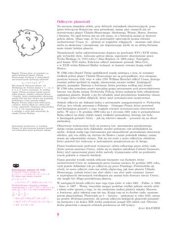 Odkrycie planetoid Na nocnym ziemskim niebie, przy dobrych warunkach obserwacyjnych, poza jasno świecącym Księżycem oraz gwiazdami, mamy pięć, znanych już od starożytności planet Układu Słonecznego: Merkurego, Wenus, Marsa, Jowisza i Saturna. Na ogół świecą one na tyle jasno, że z łatwością można je dostrzec gołym okiem. Mimo tego, że bez przyrządów optycznych można również zaobserwować Urana, to – głównie ze względów religijnych – uważano taki obraz nieba za skończony i niezmienny, nie dopuszczając myśli, że za orbitą Saturna może istnieć kolejna planeta. Niezmienność nieba zakwestionowano dopiero na przełomie XVI i XVII wieku, gdy wybuchły dwie, widoczne gołym okiem, supernowe obserwowane przez Tycho Brahego (w 1572 roku) i Jana Keplera (w 1604 roku). Następnie, pod koniec XVI wieku, Fabricius odkrył zmienność gwiazdy Mira Ceti, a w XVII wieku Edmond Halley wykazał, że komety również krążą wokół Słońca. Reguła Titiusa głosi, że rozmiary an półosi kolejnych planet Układu Słonecznego wyrażone w jednostkach astronomicznych spełniają zależność an = 0, 4 + 0, 3 · 2 n−1 . Dla znanych Titiusowi planet, od Merkurego do Jowisza mamy n = −∞, 1, 2, 3, 5, 6. Łatwo zauważyć, że według reguły Titiusa powinna istnieć jeszcze jedna planeta, między orbitami Marsa i Jowisza, która wypełniałaby olbrzymią pustkę 550 mln km i której już wcześniej próbowano z tego powodu szukać. Reguła Titiusa znana była nielicznym i dopiero Johann Bode po odkryciach Urana, planetoid i Neptuna (odpowiednio n = 7, 4 i 8) rozpowszechnił ją, w związku z czym dziś nazywamy ją regułą Titiusa–Bodego. Instrument przejściowy to teleskop, służący do precyzyjnego pomiaru przejść ciał niebieskich przez południk lokalny. W 1766 roku Daniel Titius opublikował regułę mówiącą o tym, że rozmiary wielkich półosi planet Układu Słonecznego nie są przypadkowe, lecz związane prostym wzorem. Gdy więc w roku 1781 William Herschel odkrył Urana, którego rozmiar półosi spełniał tę regułę, intensywnie zaczęto szukać „brakującej” planety pomiędzy Marsem a Jowiszem, która powinna według niej istnieć. W 1799 roku powołano nawet specjalną grupę astronomów pod przewodnictwem barona von Zacha zwaną Niebiańską Policją, której zadaniem było odnalezienie zaginionej planety. Każdy z jej 24 członków miał przydzielony konkretny obszar 15 stopni nieba wzdłuż ekliptyki, który miał systematycznie monitorować. Jednak odkrycia nie dokonał żaden z astronomów zaangażowanych w Niebiańską Policję, lecz włoski astronom z Palermo – Giuseppe Piazzi, który pracował nad katalogiem gwiazd i z tego względu również systematycznie obserwował niebo. W nocy z 31 grudnia 1800 roku na 1 stycznia 1801 roku w gwiazdozbiorze Byka odkrył on słaby obiekt ósmej wielkości gwiazdowej, którego nie było w katalogach gwiazd i który – jak się wkrótce okazało – poruszał się na sferze niebieskiej. Obserwacje wykonywane były za pomocą tzw. instrumentu przejściowego, dzięki czemu można było dokładnie ustalać położenie ciał niebiańskich na niebie. Jednak wadą tego instrumentu jest niemożliwość prowadzenia obserwacji obiektu, gdy ten zbliży się zbytnio do Słońca i minie południk lokalny, zanim stanie się odpowiednio ciemno. Tak się też stało z nowo odkrytym obiektem, który przestał być widoczny w instrumencie przejściowym po 11 lutego. Piazzi bezskutecznie próbował wyznaczyć orbitę odkrytego przez siebie ciała (które potem nazwano Ceres), udało się to dopiero młodemu Carlowi Gaussowi, który użył opracowanej przez siebie metody wyznaczania orbit na podstawie trzech położeń w różnych chwilach. Rozwiązanie zadania M 1506. Z wzorów Viete’a wiemy, że a + b + c = −2 oraz ab + bc + ca = 0. W takim razie mamy również 2 2 2 a +b +c = 2 = (a + b + c) − 2(ab + bc + ca) = 4. Przekształcając równanie z zadania otrzymujemy 1 = 3x3 + 6x2 = 3x2 (x + 2), czyli x12 = 3(x + 2). Stąd otrzymujemy 1 1 1 + 4 + 4 = a4 b c 2 2 2 = 9(a + 2) + 9(b + 2) + 9(c + 2) = 2 2 2 = 9 (a + b + c ) + 4(a + b + c) + 12 = = 9(4 − 8 + 12) = 72. Gauss przesłał wyniki swoich obliczeń baronowi von Zachowi, który zaobserwował Ceres we wskazanym przez Gaussa miejscu 31 grudnia 1801 roku, czyli prawie dokładnie rok po odkryciu jej przez Piazziego. Potwierdziło się wtedy, że nowo odkryte ciało ma orbitę eliptyczną, jak inne planety Układu Słonecznego, jednak świeci ono zbyt słabo i ma zbyt małe rozmiary (nawet w największych ówczesnych teleskopach nie można było dostrzec tarczy Ceres), aby mogło być długo poszukiwaną planetą. W następnych latach odkryto inne tego typu ciała: w roku 1801 – Pallas, w 1804 – Juno, w 1807 – Westę, wszystkie mające podobne wielkie półosie swoich orbit i zdano sobie sprawę z tego, że nie znaleziono żadnej planety między Marsem a Jowiszem, gdyż takowej tam nie ma. Krążą tam za to drobne ciała, nazwane potem planetoidami. Planetoidę nr 5 – Astraeę – znaleziono w roku 1845, zatem po prawie 40-letniej przerwie, ale potem odkrycia kolejnych planetoid posypały się lawinowo i do końca XIX wieku znaleziono ponad 450 takich ciał. Obecnie liczba planetoid o znanych orbitach przekracza aż 450 tysięcy. Ariel MAJCHER 5