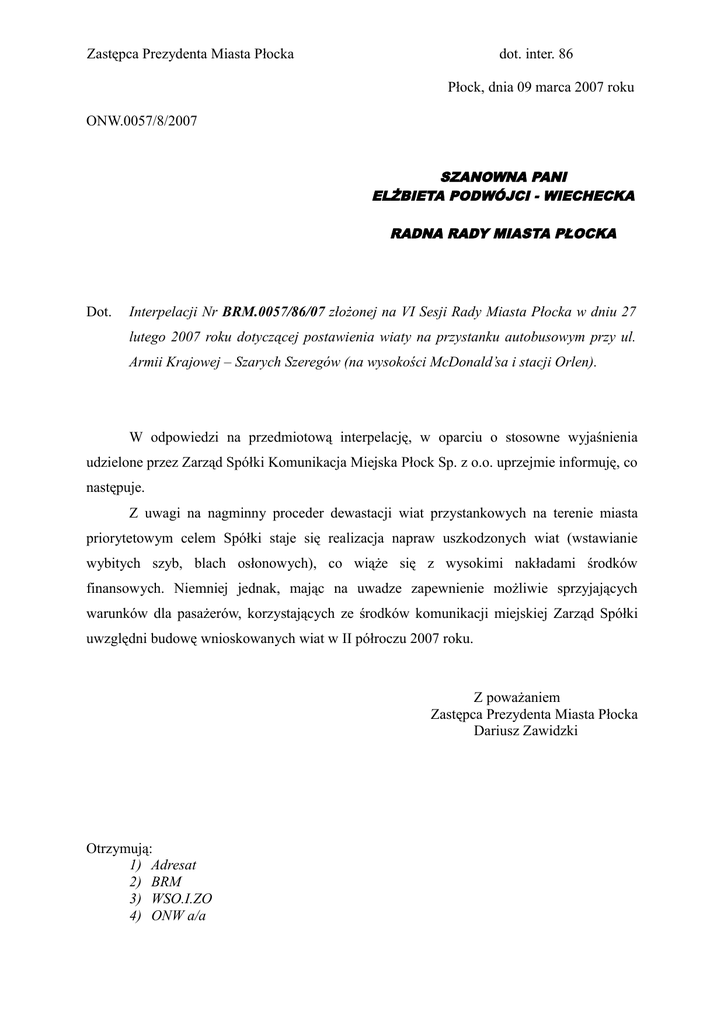 Zastępca Prezydenta Miasta Płocka dot. inter. 86 Płock, dnia 09 marca 2007 roku ONW.0057/8/2007 SZANOWNA PANI ELŻBIETA PODWÓJCI - WIECHECKA RADNA RADY MIASTA PŁOCKA Dot. Interpelacji Nr BRM.0057/86/07 złożonej na VI Sesji Rady Miasta Płocka w dniu 27 lutego 2007 roku dotyczącej postawienia wiaty na przystanku autobusowym przy ul. Armii Krajowej – Szarych Szeregów (na wysokości McDonald’sa i stacji Orlen). W odpowiedzi na przedmiotową interpelację, w oparciu o stosowne wyjaśnienia udzielone przez Zarząd Spółki Komunikacja Miejska Płock Sp. z o.o. uprzejmie informuję, co następuje. Z uwagi na nagminny proceder dewastacji wiat przystankowych na terenie miasta priorytetowym celem Spółki staje się realizacja napraw uszkodzonych wiat (wstawianie wybitych szyb, blach osłonowych), co wiąże się z wysokimi nakładami środków finansowych. Niemniej jednak, mając na uwadze zapewnienie możliwie sprzyjających warunków dla pasażerów, korzystających ze środków komunikacji miejskiej Zarząd Spółki uwzględni budowę wnioskowanych wiat w II półroczu 2007 roku. Z poważaniem Zastępca Prezydenta Miasta Płocka Dariusz Zawidzki Otrzymują: 1) Adresat 2) BRM 3) WSO.I.ZO 4) ONW a/a