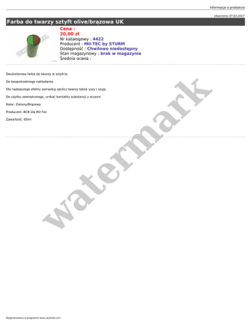 Informacje o produkcie Utworzono 07-03-2017 Farba do twarzy sztyft olive/brązowa UK Cena : 20,00 zł Nr katalogowy : 4422 Producent : Mil-TEC by STURM Dostępność : Chwilowo niedostępny Stan magazynowy : brak w magazynie Średnia ocena : Dwukolorowa farba do twarzy w sztyfcie. Do bezpośredniego nakładania. er m ar k Dla najlepszego efektu zamaskuj oprócz twarzy także uszy i szyję. Do użytku zewnętrznego, unikać kontaktu substancji z oczami. Kolor: Zielony/Brązowy Producent: BCB dla Mil-Tec w at Zawartość: 60ml Wygenerowano w programie www.oscGold.com