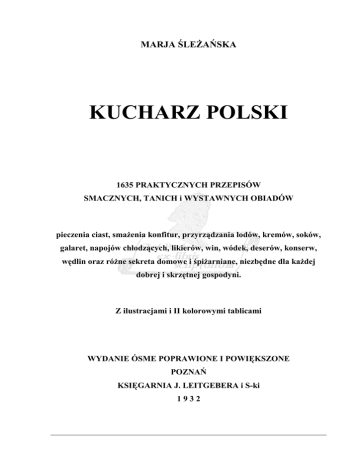 MARJA ŚLEśAŃSKA KUCHARZ POLSKI 1635 PRAKTYCZNYCH PRZEPISÓW SMACZNYCH, TANICH i WYSTAWNYCH OBIADÓW pieczenia ciast, smaŜenia konfitur, przyrządzania lodów, kremów, soków, galaret, napojów chłodzących, likierów, win, wódek, deserów, konserw, wędlin oraz róŜne sekreta domowe i śpiŜarniane, niezbędne dla kaŜdej dobrej i skrzętnej gospodyni. Z ilustracjami i II kolorowymi tablicami WYDANIE ÓSME POPRAWIONE I POWIĘKSZONE POZNAŃ KSIĘGARNIA J. LEITGEBERA i S-ki 1932 Jedną z najwaŜniejszych czynności gospodarstwa kobiecego jest bez wątpienia gotowanie. Ale nie tak łatwo zadanie to spełnić, jakby się zdawało i gospodyni nieobeznana z sztuką kucharską, chociaŜby nie Ŝałowała pracy i kosztów, sama nie będzie mogła go spełnić jak naleŜy. Ta myśl powodowała mną, aby podjąć się niniejszej pracy i przyjść w tej mierze z pomocą naszym gosposiom, zwłaszcza młodszym. KsiąŜka moja zawiera przepisy gotowania poŜywnych, smacznych, eleganckich, a przytem tanich potraw i tak przystępnie napisana, Ŝe nie tylko doświadczone gospodynie, lecz i osoby najmniej z kuchnią obeznane korzystać z niej mogą. I przy uroczystościach, gdy naleŜy z wykwintniejszym wystąpić obiadem lub sutszą kolacją, czyni mój podręcznik zadość, przy umiejętnem ich zastosowaniu objętych nim przepisów. Ogłaszając tedy nagromadzone w ciągu lat i przewaŜnie na własnem doświadczeniu oparte przepisy umiejętnego gospodarstwa kobiecego, mianowicie jak ma się postępować, aby przy oszczędności podawane na stół potrawy były smaczne i poŜywne, jestem przekonana, Ŝe nowa ta praca na polu kucharstwa mile przez Szanowne Czytelniczki będzie przyjęta. Nie podaję dyspozycji obiadów na cały rok, gdyŜ uwaŜam to za niepraktyczne i nie dające się w gospodarstwie przeprowadzić, najczęściej bowiem dyspozycja obiadu zaleŜy od zapasów, w jakie spiŜarnia zaopatrzona. 2 Nakrycie stołu. Nakrycie i przybranie stołu nie naleŜy do wydziału kuchni, jednakowoŜ obeznanie się z niem przy większych obiadach jest dla gospodyni koniecznem. Stół ustawia się wzdłuŜ pokoju, jeŜeli zaś pokój nie jest dość długi, moŜna w podkowę ustawić; miejsca rachuje się na osobę 3 stopy. Po nakryciu obrusem stawia się na środku stołu wazon z kwiatami lub baumkuch, kosze z owocami, zastawę z deserem, świece w kandelabrach, jeŜeli pokój nie jest lampami oświetlony w odstępach stosownych, kilka drobnych naczyń z solą, pieprzem i cukrem etc. Dla kaŜdej osoby z brzegu stołu stawia się w pewnej odległości płytki talerz, na talerzu elegancko ustawiona serwetka z bułeczką. Na prawo kaŜdego talerza, widelec, nóŜ i łyŜka, które zmieniać za kaŜdą potrawą naleŜy. Przed kaŜdego nakryciem kilka róŜnych kieliszków, stosownie do jakości i ilości win, mających być podawanych w czasie uczty, i szklanki. Karafki z wodą i winem powinny być w pewnej odległości tak porozstawiane po stole, Ŝe kaŜdy z gości łatwo sięgnąć moŜe, nie deranŜując sąsiada; wreszcie przed kaŜdem nakryciem stawia się krzesło. W wielu domach utrzymał się jeszcze zwyczaj sadzania najpowaŜniejszych osób z prawej strony stołu, zaczynając od rogu; zwyczaj ten juŜ teraz niemodny, gdyŜ, tylko środek stołu jest uwaŜany za pierwsze miejsce. Od tego miejsca poczyna słuŜba obnoszenie potraw, jedna w prawo, druga w lewo, podając półmisek z lewej strony. Na 10 osób potrzebny 1 słuŜący, oprócz tego inni donoszą sosy do potraw lub podstawki z octem, oliwą i musztardą. Po zmianie talerzy, widelcy i noŜy podaje się następne dania w nowym porządku. Po obiedzie podaje się zwykle w przyległym salonie czarną kawę oraz likiery i koniak. Do kolacji ciepłej nakrywa się stół jak do obiadu, lecz często nie siada się do wspólnego stołu, tylko słuŜba roznosi po małych stoliczkach serwety, talerze, widelce, noŜe i obnosi potrawy. Bardzo u nas weszła w zwyczaj zimna kolacja, tak zwana herbata angielska; w takim razie zastawia się bufet, ubiera elegancko w środku kwiatami, po bokach stawiają się konfitury, ciasta, kandelabry z świecami, po obu końcach stołu talerze, serwety, noŜe, widelce, łyŜki i zastawia się zimną kolacją podług gustu. 3 O drugich śniadaniach i zakąskach przedobiednich. Rozmaitego rodzaju są drugie śniadania. JeŜeli panowie po czystej herbacie udają się w drogę lub na polowanie, w takim razie podają się starodawne polskie potrawy jak kiełbasa z kapusta lub sosem, zrazy, bigos, zrobiony z kapusty kwaszonej i róŜnych resztek pieczeni, zwierzyna, peklówka, szynka na gorąco, wędliny zimne, masło i ser jako dopełnienie śniadania. Przy takich syczących potrawach gorzka lub jaka korzenna wódka jest konieczną. JeŜeli obiad ma nastąpić za trzy godziny, gospodyni nie da wtedy tak cięŜkiego śniadania, moŜe podać jedną z tych potraw na gorąco i zimne zakąski jak np. wędliny, pasztety na zimno, sery rozmaite, podawane zawsze pod kloszem. Dawniej podawano przy śniadaniach konfitury w róŜnych gatunkach, ale Ŝe słodycze nie pobudzają apetytu i zły kontrast stanowią ze słonymi przysmakami, dlatego dziś podaje się konfitury jako deser przy końcu obiadu, kolacji lub na podwieczorek. Przy śniadaniach spotykamy je tylko przy wystawnych, gorących, tak zwanych, „dejeunés dinatoires,” przy których podaje się bulion lub barszcz w filiŜankach, majonezy, polędwica, pasztety gorące, ryby, zwierzyna, a na deser w lecie owoce, w zimie konfitury. Śniadania takie bywają podawane o późniejszej godzinie, np. o 2 lub 3. Przed samem podaniem bulionu podaje się jeszcze małe przekąski, złoŜone z rozlicznych ale bardzo delikatnych i w małych ilościach podawanych słonych przysmaków, jak: kawior, sardynki, śledzie, pasztety w puszkach, kanapki, rzodkiewka itp., kilka gatunków wódek, masło, chleb i bułka zręcznie pokrajane. Przekąska stawia się zwykle na osobnym stoliku w jad