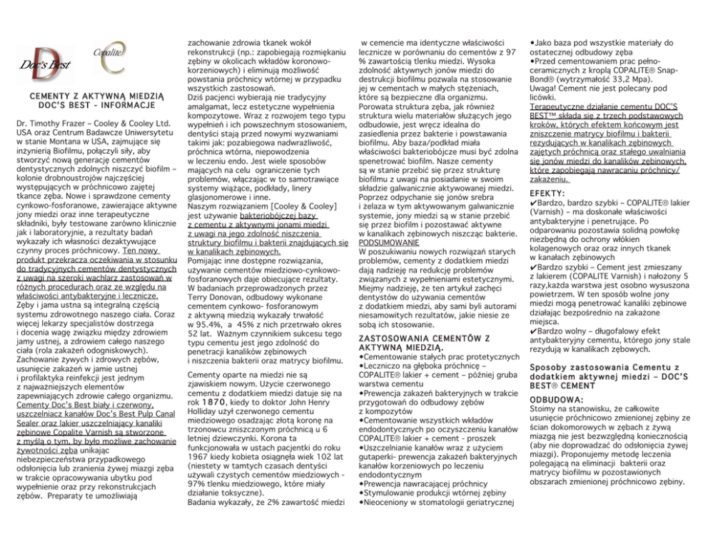 C EMENTY Z AKTYWN Ą MI EDZIĄ DO C’S BE ST - I NFO RM ACJ E Dr. Timothy Frazer – Cooley & Cooley Ltd. USA oraz Centrum Badawcze Uniwersytetu w stanie Montana w USA, zajmujące się inżynierią Biofilmu, połączyli siły, aby stworzyć nową generację cementów dentystycznych zdolnych niszczyć biofilm – kolonie drobnoustrojów najczęściej występujących w próchnicowo zajętej tkance zęba. Nowe i sprawdzone cementy cynkowo-fosforanowe, zawierające aktywne jony miedzi oraz inne terapeutyczne składniki, były testowane zarówno klinicznie jak i laboratoryjnie, a rezultaty badań wykazały ich własności dezaktywujące czynny proces próchnicowy. Ten nowy produkt przekracza oczekiwania w stosunku do tradycyjnych cementów dentystycznych z uwagi na szeroki wachlarz zastosowań w różnych procedurach oraz ze względu na właściwości antybakteryjne i lecznicze. Zęby i jama ustna są integralną częścią systemu zdrowotnego naszego ciała. Coraz więcej lekarzy specjalistów dostrzega i docenia wagę związku między zdrowiem jamy ustnej, a zdrowiem całego naszego ciała (rola zakażeń odogniskowych). Zachowanie żywych i zdrowych zębów, usunięcie zakażeń w jamie ustnej i profilaktyka reinfekcji jest jednym z najważniejszych elementów zapewniających zdrowie całego organizmu. Cementy Doc’s Best biały i czerwony, uszczelniacz kanałów Doc’s Best Pulp Canal Sealer oraz lakier uszczelniający kanaliki zębinowe Copalite Varnish są stworzone z myślą o tym, by było możliwe zachowanie żywotności zęba unikając niebezpieczeństwa przypadkowego odsłonięcia lub zranienia żywej miazgi zęba w trakcie opracowywania ubytku pod wypełnienie oraz przy rekonstrukcjach zębów. Preparaty te umożliwiają zachowanie zdrowia tkanek wokół rekonstrukcji (np.: zapobiegają rozmiękaniu zębiny w okolicach wkładów koronowokorzeniowych) i eliminują możliwość powstania próchnicy wtórnej w przypadku wszystkich zastosowań. Dziś pacjenci wybierają nie tradycyjny amalgamat, lecz estetyczne wypełnienia kompozytowe. Wraz z rozwojem tego typu wypełnień i ich powszechnym stosowaniem, dentyści stają przed nowymi wyzwaniami takimi jak: pozabiegowa nadwrażliwość, próchnica wtórna, niepowodzenia w leczeniu endo. Jest wiele sposobów mających na celu ograniczenie tych problemów, włączając w to samotrawiące systemy wiążące, podkłady, linery glasjonomerowe i inne. Naszym rozwiązaniem [Cooley & Cooley] jest używanie bakteriobójczej bazy z cementu z aktywnymi jonami miedzi z uwagi na jego zdolność niszczenia struktury biofilmu i bakterii znajdujących się w kanalikach zębinowych. Pomijając inne dostępne rozwiązania, używanie cementów miedziowo-cynkowofosforanowych daje obiecujące rezultaty. W badaniach przeprowadzonych przez Terry Donovan, odbudowy wykonane cementem cynkowo- fosforanowym z aktywną miedzią wykazały trwałość w 95.4%, a 45% z nich przetrwało okres 52 lat. Ważnym czynnikiem sukcesu tego typu cementu jest jego zdolność do penetracji kanalików zębinowych i niszczenia bakterii oraz matrycy biofilmu. Cementy oparte na miedzi nie są zjawiskiem nowym. Użycie czerwonego cementu z dodatkiem miedzi datuje się na rok 1 8 7 0 , kiedy to doktor John Henry Holliday użył czerwonego cementu miedziowego osadzając złotą koronę na trzonowcu zniszczonym próchnicą u 6 letniej dziewczynki. Korona ta funkcjonowała w ustach pacjentki do roku 1967 kiedy kobieta osiągnęła wiek 102 lat (niestety w tamtych czasach dentyści używali czystych cementów miedziowych 97% tlenku miedziowego, które miały działanie toksyczne). Badania wykazały, że 2% zawartość miedzi w cemencie ma identyczne właściwości lecznicze w porównaniu do cementów z 97 % zawartością tlenku miedzi. Wysoka zdolność aktywnych jonów miedzi do destrukcji biofilmu pozwala na stosowanie jej w cementach w małych stężeniach, które są bezpieczne dla organizmu. Porowata struktura zęba, jak również struktura wielu materiałów służących jego odbudowie, jest wręcz idealna do zasiedlenia przez bakterie i powstawania biofilmu. Aby baza/podkład miała właściwości bakteriobójcze musi być zdolna spenetrować biofilm. Nasze cementy są w stanie przebić się przez strukturę biofilmu z uwagi na posiadanie w swoim składzie galwanicznie aktywowanej miedzi. Poprzez odpychanie się jonów srebra i żelaza w tym aktywowanym galwanicznie systemie, jony miedzi są w stanie przebić się przez biofilm i pozostawać aktywne w kanalikach zębinowych niszcząc bakterie. PODSUMOWANIE W poszukiwaniu nowych rozwiązań starych problemów, cementy z dodatkiem miedzi dają nadzieję na redukcję problemów związanych z wypełnieniami estetycznymi. Miejmy nadzieję, że ten artykuł zachęci dentystów do używania cementów z dodatkiem miedzi, aby sami byli autorami niesamowitych rezultatów, jakie niesie ze sobą ich stosowanie. Z AST OS OWA NI A CE ME N TÓW Z AKTYWNĄ MI ED ZI Ą. •Cementowanie stałych prac protetycznych •Leczniczo na głęboka próchnicę – COPALITE® lakier + cement – później gruba warstwa cementu •Prewencja zakażeń bakteryjnych w trakcie przygotowań do odbudowy zębów z kompozytów •Cementowanie wszystkich wkładów endodontycznych po oczyszczeniu kanałów COPALITE® lakier + cement - proszek •Uszczelnianie kanałów wraz z użyciem gutaperki- prewencja zakażeń bakteryjnych kanałów korzeniowych po leczeniu endodontycznym •Prewencja nawracającej próchnicy •Stymulowanie produkcji wtórnej zębiny •Nieoceniony w stomatologii geriatrycznej •Jako baza pod wszystkie materiały do ostatecznej odbudowy zęba •Przed cementowaniem prac pełnoceramicznych z kroplą COPALITE® SnapBond® (wytrzymałość 33,2 Mpa). Uwaga! Cement nie jest polecany pod licówki. Terapeutyczne działanie cementu DOC’S BEST™ składa się z trzech podstawowych kroków, których efektem końcowym jest zniszczenie matrycy biofilmu