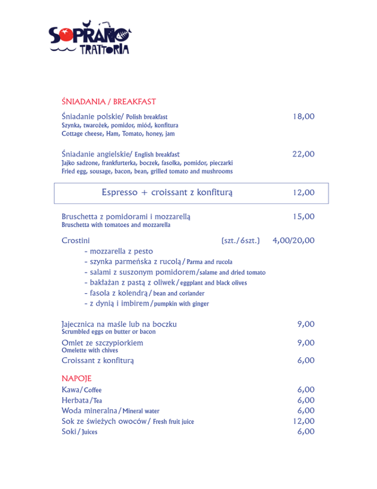 Śniadania / Breakfast Śniadanie polskie/ Polish breakfast 18,00 Szynka, twarożek, pomidor, miód, konfitura Cottage cheese, Ham, Tomato, honey, jam Śniadanie angielskie/ English breakfast 22,00 Jajko sadzone, frankfurterka, boczek, fasolka, pomidor, pieczarki Fried egg, sousage, bacon, bean, grilled tomato and mushrooms Espresso + croissant z konfiturą Bruschetta z pomidorami i mozzarellą 15,00 Bruschetta with tomatoes and mozzarella Crostini 12,00 (szt. / 6szt.) 4,00/20,00 - mozzarella z pesto - szynka parmeńska z rucolą / Parma and rucola - salami z suszonym pomidorem / salame and dried tomato - bakłażan z pastą z oliwek / eggplant and black olives - fasola z kolendrą / bean and coriander - z dynią i imbirem / pumpkin with ginger Jajecznica na maśle lub na boczku 9,00 Omlet ze szczypiorkiem 9,00 Croissant z konfiturą 6,00 Scrumbled eggs on butter or bacon Omelette with chives NAPOJE Kawa / Coffee 6,00 Herbata / Tea 6,00 Woda mineralna / Mineral water 6,00 Sok ze świeżych owoców / Fresh fruit juice Soki / Juices 12,00 6,00