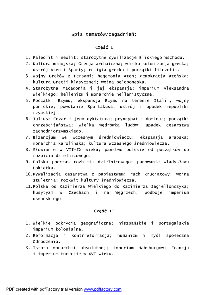 Spis tematów/zagadnień: Część I 1. Paleolit i neolit; starożytne cywilizacje Bliskiego Wschodu. 2. Kultura minojska; Grecja archaiczna; wielka kolonizacja grecka; ustrój Aten i Sparty; religia grecka i początki filozofii. 3. Wojny Greków z Persami; hegemonia Aten; demokracja ateńska; kultura Grecji klasycznej; wojna peloponeska. 4. Starożytna Macedonia i jej ekspansja; imperium Aleksandra Wielkiego; hellenizm i monarchie hellenistyczne. 5. Początki Rzymu; ekspansja Rzymu na terenie Italii; wojny punickie; powstanie Spartakusa; ustrój i upadek republiki rzymskiej. 6. Juliusz Cezar i jego dyktatura; pryncypat i dominat; początki chrześcijaństwa; wielka wędrówka ludów; upadek cesarstwa zachodniorzymskiego. 7. Bizancjum we wczesnym średniowieczu; ekspansja arabska; monarchia karolińska; kultura wczesnego średniowiecza. 8. Słowianie w VII-IX wieku; państwo polskie od początków do rozbicia dzielnicowego. 9. Polska podczas rozbicia dzielnicowego; panowanie Władysława Łokietka. 10.Rywalizacja cesarstwa z papiestwem; ruch krucjatowy; wojna stuletnia; rozkwit kultury średniowiecza. 11.Polska od Kazimierza Wielkiego do Kazimierza Jagiellończyka; husytyzm w Czechach i na Węgrzech; podboje imperium osmańskiego. Część II 1. Wielkie odkrycia geograficzne; hiszpańskie i portugalskie imperium kolonialne. 2. Reformacja i kontrreformacja; humanizm i myśl społeczna Odrodzenia. 3. Istota monarchii absolutnej; imperium Habsburgów; Francja i imperium tureckie w XVI wieku. PDF created with pdfFactory trial version www.pdffactory.com 4. Dualizm ekonomiczny Europy; gospodarka polska w XVI wieku; demokracja szlachecka. 5. Unia lubelska; polityka bałtycka ostatnich Jagiellonów; reformacja w Polsce. 6. Pierwsze wolne elekcje; polityka bałtycka Stefana Batorego; unia brzeska; Rzeczypospolita na przełomie XVI i XVII wieku. 7. Wojna trzydziestoletnia; panowanie Ludwika XIV; rewolucja angielska w XVII wieku. 8. Wojny Rzeczypospolitej w XVII wieku; Rzeczypospolita u schyłku XVII wieku. 9. Charakterystyka Oświecenia; myśl społeczna i polityczna Oświecenia; liberalizm ekonomiczny. 10. Rosja Piotra Wielkiego i Katarzyny Wielkiej; państwo brandenbursko-pruskie w XVIII wieku; monarchia austriacka w XVIII wieku; reformy Marii Teresy i Józefa II; wojna siedmioletnia 1756-1763. 11. Wojna północna na ziemiach polskich; epoka saska w dziejach Rzeczypospolitej; pierwsze reformy za Stanisława Augusta Poniatowskiego; konfederacja barska; Oświecenie w Polsce. 12. Kolonizacja Ameryki Północnej w XVI-XVII wieku; walka o niepodległość Stanów Zjednoczonych. 13. Francja przed rewolucją; wybuch rewolucji; obalenie monarchii; rządy żyrondystów; dyktatura jakobinów; rządy Dyrektoriatu. 14. Sejm Wielki i Konstytucja 3 Maja; wojna polsko-rosyjska 1792 roku; II rozbiór Polski; powstanie kościuszkowskie; III rozbiór Polski. Część III 1. 2. 3. 4. Europa napoleońska; Księstwo Warszawskie; wojna Napoleona z Rosją; upadek I Cesarstwa. Kongres wiedeński i jego postanowienia; Święte Przymierze; ruch karbonariuszy. Powstanie dekabrystów; wojna Greków o niepodległość; rewolucja przemysłowa. Nurty polityczne w Europie na początku XIX wieku; rewolucja lipcowa we Francji; rewolucja lutowa we Francji; proklamowanie II Republiki. PDF created with pdfFactory trial version www.pdffactory.com 5. 6. 7. 8. 9. 10. 11. 12. 13. 14. 15. 16. 17. 18. 19. 20. 21. Królestwo Polskie w latach 1815-1830; powstanie listopadowe; represje po powstaniu listopadowym. Wielka Emigracja; tajne organizacje na ziemiach polskich po powstaniu listopadowym; powstanie krakowskie 1846 r. Wiosna Ludów w Austrii i Prusach; II Cesarstwo we Francji; wojna krymska; wiosna posewastopolska w Rosji. Królestwo Polskie po wojnie krymskiej; polityka Aleksandra Wielopolskiego; powstanie styczniowe. Wojna secesyjna w USA; Zjednoczenie Niemiec; powstanie Austro-Węgier; Komuna Paryska. Zjednoczenie Włoch; polityka wewnętrzna Bismarcka; ekspansja kolonialna państw europejskich. Partie polityczne na ziemiach polskich na przełomie XIX i XX wieku; rewolucja 1905 r. w Rosji i Królestwie Polskim; polityka germanizacji w zaborze pruskim. Sojusze przed I wojną światową; sytuacja na Bałkanach; na frontach I wojny światowej; rewolucja lutowa i bolszewicka w Rosji. Sprawa polska podczas I wojny światowej; państwa centralne w latach 1918-1919; porządek wersalski. Odrodzenie państwa polskiego po I wojnie światowej; walka o granice II Rzeczypospolitej. Polska w latach 1919-1926; reforma monetarna Władysława Grabskiego; koalicja Chjeno-Piasta. Zamach majowy; rządy sanacji; działalność gospodarcza Eugeniusza Kwiatkowskiego. ZSRR w okresie międzywojennym; narodziny faszyzmu we Włoszech; Niemcy przed wybuchem II wojny światowej. Inwazja niemiecka na Czechosłowację; wojna obronna 1939 r.; agresja niemiecka na Danię i Norwegię. Niemiecka inwazja na Francję w 1940 r.; ekspansja ZSRR w latach 1939-1940; bitwa o Wielką Brytanię; sytuacja na Bałkanach w latach 1940-1941. Wojna niemiecko-radziecka; działania wojenne w Afryce i na Dalekim Wschodzie; wojna w Europie w latach 1943-1945. Polska pod okupacją; rząd RP na uchodźstwie; wojsko polskie w ZSRR; polskie państwo podziemne. PDF created with pdfFactory trial version www.pdffactory.com 22. 23. 24. 25. 26. Koalicja antyfaszystowska; początek zimnej wojny; okupacja Niemiec; sowietyzacja Europy środkowowschodniej. Polska w latach 1944-1956. Bliski i Daleki Wschód po II wojnie światowej; ZSRR po śmierci Stalina; rewolucja na Kubie; powstanie na Węgrzech w 1956 r.; Praska Wiosna 1968 r. PRL w latach 1956-1989. Wojna wietnamska; Czerwoni Khmerzy; Michaił Gorbaczow i rozpad ZSRR; Jesień Narodów 1989 r.; III Rzeczpospolita w latach 1989-2001. PDF created with pdfFactory trial version www.pdffactory.com