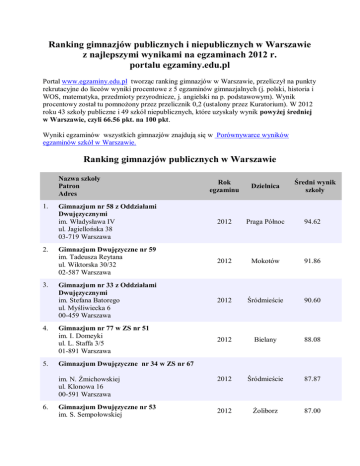 Ranking gimnazjów publicznych i niepublicznych w Warszawie z najlepszymi wynikami na egzaminach 2012 r. portalu egzaminy.edu.pl Portal www.egzaminy.edu.pl tworząc ranking gimnazjów w Warszawie, przeliczył na punkty rekrutacyjne do liceów wyniki procentowe z 5 egzaminów gimnazjalnych (j. polski, historia i WOS, matematyka, przedmioty przyrodnicze, j. angielski na p. podstawowym). Wynik procentowy został tu pomnożony przez przelicznik 0,2 (ustalony przez Kuratorium). W 2012 roku 43 szkoły publiczne i 49 szkół niepublicznych, które uzyskały wynik powyżej średniej w Warszawie, czyli 66.56 pkt. na 100 pkt. Wyniki egzaminów wszystkich gimnazjów znajdują się w Porównywarce wyników egzaminów szkół w Warszawie. Ranking gimnazjów publicznych w Warszawie Nazwa szkoły Patron Adres 1. 2. 3. 4. 5. Dzielnica Gimnazjum nr 58 z Oddziałami Dwujęzycznymi im. Władysława IV ul. Jagiellońska 38 03-719 Warszawa 2012 Praga Północ 94.62 Gimnazjum Dwujęzyczne nr 59 im. Tadeusza Reytana ul. Wiktorska 30/32 02-587 Warszawa 2012 Mokotów 91.86 Gimnazjum nr 33 z Oddziałami Dwujęzycznymi im. Stefana Batorego ul. Myśliwiecka 6 00-459 Warszawa 2012 Śródmieście 90.60 Gimnazjum nr 77 w ZS nr 51 im. I. Domeyki ul. L. Staffa 3/5 01-891 Warszawa 2012 Bielany 88.08 2012 Śródmieście 87.87 2012 Żoliborz 87.00 Gimnazjum Dwujęzyczne nr 34 w ZS nr 67 im. N. Żmichowskiej ul. Klonowa 16 00-591 Warszawa 6. Średni wynik szkoły Rok egzaminu Gimnazjum Dwujęzyczne nr 53 im. S. Sempołowskiej ul. Ks. J. Popiełuszki 01-786 Warszawa Gimnazjum nr 42 z Oddziałami Dwujęzycznymi ul. Twarda 8/12 00-105 Warszawa 2012 Śródmieście 85.62 Ogólnokształcąca Szkoła Muzyczna II stopnia w ZS Szkół Muzycznych nr 1 im. Zenona Brzewskiego ul. Miodowa 22c 00-246 Warszawa 2012 Śródmieście 85.06 Gimnazjum nr 25 z Oddziałami Dwujęzycznymi w ZS nr 84 im. Czesława Niemena ul. Zwycięzców 44 03-938 Warszawa 2012 Praga Południe 82.44 10. Gimnazjum nr 38 im. Marii Skłodowskiej-Curie ul. Świętokrzyska 18 A 00-052 Warszawa 2012 Śródmieście 80.16 11. Ogólnokształcąca Szkoła Muzyczna II stopnia w ZPSM nr 4 im. Karola Szymanowskiego ul. Krasińskiego 1 01-530 Warszawa 2012 Żoliborz 77.78 12. Gimnazjum nr 106 w ZS nr 70 ul. Bajkowa 17/21 04-855 Warszawa 2012 Wawer 76.76 13. Gimnazjum nr 13 im. Stanisława Staszica ul. Nowowiejska 37A 02-010 Warszawa 2012 Ochota 76.76 14. Zespół Ogólnokształcących Szkół Muzycznych I i II stopnia nr 3 im. Grażyna Bacewicz ul. Tyszkiewicza 42 01-172 Warszawa 2012 Wola 76.68 15. Gimnazjum nr 44 ul. Smolna 30 00-375 Warszawa 2012 Śródmieście 75.86 16. Gimnazjum nr 72 im. A.B. Dobrowolskiego ul. Przybyszewskiego 45 2012 Bielany 75.76 7. 8. 9. 01-849 Warszawa 17. Gimnazjum nr 49 im. Stefana Starzyńskiego ul. Smocza 19 01-051 Warszawa 2012 Wola 75.76 18. Gimnazjum nr 19 z Oddziałami Dwujęzycznymi w ZS nr 77 im. Bolesława Prusa ul. Zwycięzców 7/9 03-936 Warszawa 2012 Praga Południe 75.22 19. Gimnazjum nr 86 w ZS nr 46 im. płk. I.A. Boernera ul. Thommeego 1 01-491 Warszawa 2012 Bemowo 75.22 20. Gimnazjum nr 112 im. Króla Jana III Sobieskiego ul. Solipska 17/19 02-482 Warszawa 2012 Włochy 75.10 Ranking gimnazjów niepublicznych w Warszawie Nazwa szkoły Patron Adres 1. 2. 3. 4. 5. Średni wynik szkoły Rok egzaminu Dzielnica Gimnazjum przy Społecznym LO nr 4 im. Batalionu AK "Parasol" ul. Hawajska 14 A 02-776 Warszawa 2012 Ursynów 89.74 Społeczne Gimnazjum nr 5 STO ul. Astronautów 11 02-154 Warszawa 2012 Włochy 89.42 Społeczne Gimnazjum "Dwójka" nr 45 STO ul. Nowowiejska 5 00-643 Warszawa 2012 Śródmieście 88.50 Gimnazjum "Żagle" Stowarzyszenia STERNIK ul. Pożaryskiego 28 Warszawa 2012 Wawer 87.58 Prywatne Gimnazjum nr 1 2012 Wawer 87.40 ul. Patriotów 347 04-760 Warszawa Społeczne Gimnazjum nr 27 STO im. Kardynała Stefana Wyszyńskiego ul. Ostrobramska 72 04-175 Warszawa 2012 Praga Południe 86.70 Gimnazjum Przymierza Rodzin im. Jana Pawła II ul. M. Grzegorzewskiej 10 02-778 Warszawa 2012 Ursynów 86.30 Społeczne Gimnazjum nr 333 STO ul. Dziatwy 6 03-109 Warszawa 2012 Białołęka 86.00 Społeczne Gimnazjum nr 4 STO ul. Bachmacka 3 02-647 Warszawa 2012 Mokotów 85.70 10. Społeczne Gimnazjum nr 16 STO Aleja Solidarności 113C 00-140 Warszawa 2012 Śródmieście 85.30 11. Gimnazjum Prywatne nr 2 ul. Jasielska 49/53 02-128 Warszawa 2012 Ochota 84.40 12. Gimnazjum Sióstr Felicjanek nr 4 im. Błogosławionej M. Angeli Truszkowskiej Azaliowa 10 04-539 Warszawa 2012 Wawer 84.10 13. Społeczne Gimnazjum nr 1 STO im. Jana Nowaka-Jeziorańskiego ul. Polinezyjska 10 A 02-777 Warszawa 2012 Ursynów 83.80 14. Prywatne Gimnazjum nr 10 ul. Świętojerska 24 00-202 Warszawa 2012 Śródmieście 83.70 15. Prywatne Gimnazjum nr 22 LauderMorasha ul. Wawelberga 10 01-188 Warszawa 2012 Wola 82.10 16. Gimnazjum nr 6 Zgromadzenia Sióstr Najświętszej Rodziny z Nazaretu ul. Czerniakowska 137 00-720 Warszawa 2012 Mokotów 82.00 17. Niepubliczne Gimnazjum nr 9 Fundacji 2012 Ursynów 80.70 6. 7. 8. 9. Primus im. Roberta Schumana ul. Zoltana Balo 1 02-792 Warszawa 18. Gimnazjum nr 14 Fundacji Szkolnej im. Jana Gutenberga ul. Obrzeźna 12 A 02-691 Warszawa 2012 Mokotów 80.00 19. Społeczne Gimnazjum nr 4 STO ul. Traktorzystów 16 02-495 Warszawa 2012 Ursus 79.90 20. Społeczne Gimnazjum STO ul. Toruńska 23 03-226 Warszawa 2012 Targówek 79.80