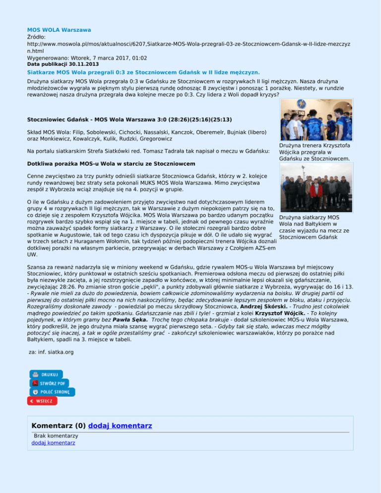 MOS WOLA Warszawa Źródło: http://www.moswola.pl/mos/aktualnosci/6207,Siatkarze-MOS-Wola-przegrali-03-ze-Stoczniowcem-Gdansk-w-II-lidze-mezczyz n.html Wygenerowano: Wtorek, 7 marca 2017, 01:02 Data publikacji 30.11.2013 Siatkarze MOS Wola przegrali 0:3 ze Stoczniowcem Gdańsk w II lidze mężczyzn. Drużyna siatkarzy MOS Wola przegrała 0:3 w Gdańsku ze Stoczniowcem w rozgrywkach II ligi mężczyzn. Nasza drużyna młodzieżowców wygrała w pięknym stylu pierwszą rundę odnosząc 8 zwycięstw i ponosząc 1 porażkę. Niestety, w rundzie rewanżowej nasza drużyna przegrała dwa kolejne mecze po 0:3. Czy lidera z Woli dopadł kryzys? Stoczniowiec Gdańsk - MOS Wola Warszawa 3:0 (28:26)(25:16)(25:13) Skład MOS Wola: Filip, Sobolewski, Cichocki, Nassalski, Kanczok, Oberemelr, Bujniak (libero) oraz Monkiewicz, Kowalczyk, Kulik, Rudzki, Gregorowicz Na portalu siatkarskim Strefa Siatkówki red. Tomasz Tadrała tak napisał o meczu w Gdańsku: Dotkliwa porażka MOS-u Wola w starciu ze Stoczniowcem Drużyna trenera Krzysztofa Wójcika przegrała w Gdańsku ze Stoczniowcem. Cenne zwycięstwo za trzy punkty odnieśli siatkarze Stoczniowca Gdańsk, którzy w 2. kolejce rundy rewanżowej bez straty seta pokonali MUKS MOS Wola Warszawa. Mimo zwycięstwa zespół z Wybrzeża wciąż znajduje się na 4. pozycji w grupie. O ile w Gdańsku z dużym zadowoleniem przyjęto zwycięstwo nad dotychczasowym liderem grupy 4 w rozgrywkach II ligi mężczyzn, tak w Warszawie z dużym niepokojem patrzy się na to, co dzieje się z zespołem Krzysztofa Wójcika. MOS Wola Warszawa po bardzo udanym początku rozgrywek bardzo szybko wspiął się na 1. miejsce w tabeli, jednak od pewnego czasu wyraźnie można zauważyć spadek formy siatkarzy z Warszawy. O ile stołeczni rozegrali bardzo dobre spotkanie w Augustowie, tak od tego czasu ich dyspozycja pikuje w dół. O ile udało się wygrać w trzech setach z Huraganem Wołomin, tak tydzień później podopieczni trenera Wójcika doznali dotkliwej porażki na własnym parkiecie, przegrywając w derbach Warszawy z Czołgiem AZS-em UW. Drużyna siatkarzy MOS Wola nad Bałtykiem w czasie wyjazdu na mecz ze Stoczniowcem Gdańsk Szansa za rewanż nadarzyła się w miniony weekend w Gdańsku, gdzie rywalem MOS-u Wola Warszawa był miejscowy Stoczniowiec, który punktował w ostatnich sześciu spotkaniach. Premierowa odsłona meczu od pierwszej do ostatniej piłki była niezwykle zacięta, a jej rozstrzygnięcie zapadło w końcówce, w której minimalnie lepsi okazali się gdańszczanie, zwyciężając 28:26. Po zmianie stron goście „pękli", a punkty zdobywali głównie siatkarze z Wybrzeża, wygrywając do 16 i 13. - Rywale nie mieli za dużo do powiedzenia, bowiem całkowicie zdominowaliśmy wydarzenia na boisku. W drugiej partii od pierwszej do ostatniej piłki mocno na nich naskoczyliśmy, będąc zdecydowanie lepszym zespołem w bloku, ataku i przyjęciu. Rozegraliśmy doskonałe zawody - powiedział po meczu skrzydłowy Stoczniowca, Andrzej Skórski. - Trudno jest cokolwiek mądrego powiedzieć po takim spotkaniu. Gdańszczanie nas zbili i tyle! - grzmiał z kolei Krzysztof Wójcik. - To kolejny pojedynek, w którym gramy bez Pawła Sęka. Trochę tego chłopaka brakuje - dodał szkoleniowiec MOS-u Wola Warszawa, który podkreślił, że jego drużyna miała szansę wygrać pierwszego seta. - Gdyby tak się stało, wówczas mecz mógłby potoczyć się inaczej, a tak w ogóle przestaliśmy grać - zakończył szkoleniowiec warszawiaków, którzy po porażce nad Bałtykiem, spadli na 3. miejsce w tabeli. za: inf. siatka.org Komentarz (0) dodaj komentarz Brak komentarzy dodaj komentarz