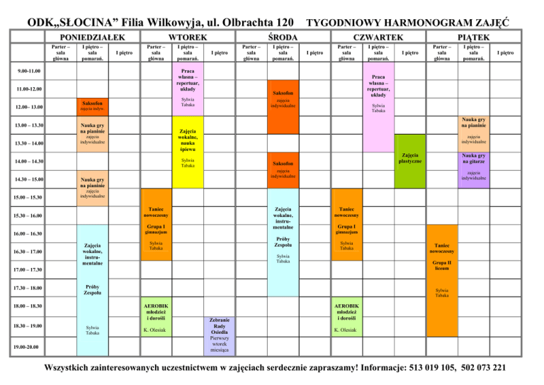 ODK„SŁOCINA” Filia Wilkowyja, ul. Olbrachta 120 PONIEDZIAŁEK Parter – sala główna I piętro – sala pomarań. I piętro WTOREK Parter – sala główna 9.00-11.00 zajęcia indyw. 13.00 – 13.30 Nauka gry na pianinie I piętro – sala pomarań. CZWARTEK I piętro Parter – sala główna zajęcia indywidualne I piętro Sylwia Tabaka Zajęcia plastyczne Saksofon Nauka gry na gitarze zajęcia indywidualne Nauka gry na pianinie zajęcia indywidualne zajęcia indywidualne 16.00 – 16.30 gimnazjum Zajęcia wokalne, instrumentalne Grupa I Zajęcia wokalne, instrumentalne Próby Zespołu Sylwia Tabaka Taniec nowoczesny Grupa I gimnazjum Sylwia Tabaka Sylwia Tabaka Próby Zespołu 18.00 – 18.30 Sylwia Tabaka AEROBIK młodzież i dorośli Sylwia Tabaka Taniec nowoczesny Grupa II liceum 17.00 – 17.30 19.00-20.00 I piętro – sala pomarań. zajęcia indywidualne Taniec 18.30 – 19.00 I piętro PIĄTEK Parter – sala główna Praca własna – repertuar, układy Saksofon Sylwia Tabaka nowoczesny 17.30 – 18.00 I piętro – sala pomarań. Zajęcia wokalne, nauka śpiewu zajęcia indywidualne 15.30 – 16.00 16.30 – 17.00 Parter – sala główna Nauka gry na pianinie 14.00 – 14.30 15.00 – 15.30 I piętro Sylwia Tabaka Saksofon 12.00– 13.00 14.30 – 15.00 ŚRODA Praca własna – repertuar, układy 11.00-12.00 13.30 – 14.00 I piętro – sala pomarań. TYGODNIOWY HARMONOGRAM ZAJĘĆ K. Olesiak Zebranie Rady Osiedla Pierwszy wtorek miesiąca AEROBIK młodzież i dorośli K. Olesiak Wszystkich zainteresowanych uczestnictwem w zajęciach serdecznie zapraszamy! Informacje: 513 019 105, 502 073 221