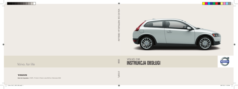 VOLVO C30 INSTRUKCJA OBSŁUGI 2008 Volvo_C30_V_2007_OKL.indd 1 INSTRUKCJA OBSŁUGI 0720PL Kdakd8Vg8dgedgVi^dcTP 8788 (English), Printed in Sweden, Göteborg 2006, 2008 Copyright © 2000-2006 Volvo Car 0720PL. PrintedATin0637, Poland, www.AM-D.pl, Warszawa VOLVO C30 2007-05-21 13:29:46 Drodzy Posiadacze Samochodu Volvo Dziękujemy za wybranie samochodu Volvo! Mamy nadzieję, że samochód ten przez długie lata będzie dostarczał wielu powodów do radości. Został on zaprojektowany z myślą o bezpieczeństwie i komforcie kierowcy i pasażerów. Samochody Volvo są jednymi z najbezpieczniejszych na świecie. Również i ten model spełnia wszystkie aktualne wymagania w zakresie bezpieczeństwa jazdy i ochrony środowiska. W trosce o zapewnienie maksimum przyjemności z korzystania z tego samochodu zalecamy zapoznanie się z zawartymi w niniejszej instrukcji obsługi informacjami i wskazówkami dotyczącymi zasad jego eksploatacji oraz obsługi zamontowanych w nim urządzeń. Spis treści 00 Wprowadzenie 01 Bezpieczeństwo Wprowadzenie .............................................6 Firma Volvo Car Corporation a środowisko naturalne ...............................7 Pasy bezpieczeństwa ............................... 12 System poduszek powietrznych .............. 15 Czołowe poduszki powietrzne (SRS) ...... 16 Włączanie/wyłączanie czołowej poduszki powietrznej (SRS) ..................... 18 Boczne poduszki powietrzne (SIPS) ....... 20 Kurtyny powietrzne (IC) ............................ 22 System WHIPS ......................................... 23 W razie zadziałania systemów ochronnych ............................................... 25 Tryb powypadkowy .................................. 26 Bezpieczeństwo dzieci ............................. 27 02 Wskaźniki, przełączniki i urządzenia sterujące Deska rozdzielcza, samochody z kierownicą po lewej stronie ................... 34 Deska rozdzielcza, samochody z kierownicą po prawej stronie ................ 36 Panel przycisków w drzwiach kierowcy... 38 Zespół wskaźników .................................. 39 Lampki kontrolne i ostrzegawcze ............ 40 Gniazdo elektryczne ................................. 45 Elementy sterujące oświetleniem ............ 46 Lewa dźwignia przełącznika zespolonego ............................................. 48 Prawa dźwignia przełącznika zespolonego ............................................. 50 Układ automatycznej kontroli prędkości (wyposażenia opcjonalne) ....................... 52 Przyciski sterujące w kierownicy (wyposażenie opcjonalne) ....................... 54 Regulacja ustawienia kierownicy, światła awaryjne ....................................... 54 Hamulec postojowy .................................. 55 Elektryczne podnośniki szyb ................... 56 Wewnętrzne lusterko wsteczne i lusterka zewnętrzne ................................ 58 Elektrycznie sterowane okno dachowe (wyposażenie opcjonalne) ....................... 62 Ustawienia indywidualne.......................... 64 00 01 02 2 Spis treści 03 Klimatyzacja 04 Wnętrze 05 Zamki i autoalarm Ogólne informacje na temat klimatyzacji 68 Ręczne sterowanie klimatyzacją, AC ....... 70 Elektroniczny układ klimatyzacji, ECC (wyposażenie opcjonalne) ....................... 73 Dystrybucja powietrza .............................. 76 Nagrzewnica spalinowa (wyposażenie opcjonalne) ............................................... 77 Przednie fotele .......................................... 82 Oświetlenie wnętrza ................................. 84 Schowki w przedziale pasażerskim samochodu ............................................... 86 Tylne siedzenia ......................................... 90 Bagażnik ................................................... 91 Pilot zdalnego sterowania z mechanicznym kluczykiem ................... 96 Zamki aktywne.......................................... 99 Jazda bez użycia kluczyka (wyposażenie opcjonalne) ..................... 100 Bateria w pilocie ..................................... 103 Otwieranie i zamykanie .......................... 104 Autoalarm (wyposażenie opcjonalne) ... 107 03 04 05 3 Spis treści 06 Uruchamianie silnika i jazda 07 Koła i ogumienie 08 Dbałość o samochód Uwagi ogólne.......................................... 112 Uzupełnianie paliwa ............................... 114 Uruchamianie silnika .............................. 115 Uruchamianie silnika – system Flexifuel ................................................... 117 Jazda bez użycia kluczyka (wyposażenie opcjonalne) ..................... 118 Manualna skrzynia biegów .................... 119 Automatyczna skrzynia biegów ............. 121 Układ hamulcowy ................................... 124 Układ stabilizujący tor jazdy i kontroli trakcji ........................................ 126 System wspomagający kierowcę podczas parkowania (wyposażenie opcjonalne) ............................................. 128 BLIS – system ostrzegający o obiektach w martwym polu lusterek zewnętrznych (wyposażenie opcjonalne) ..................... 131 Holowanie i transport unieruchomionego samochodu ............................................. 134 Awaryjne uruchamianie silnika............... 136 Jazda z przyczepą .................................. 137 Hak holowniczy ...................................... 139 Demontowany hak holowniczy .............. 141 Przewożenie bagażu .............................. 146 Regulacja wiązki światła reflektorów ..... 147 Uwagi ogólne.......................................... 150 Ciśnienie w oponach .............................. 154 Trójkąt ostrzegawczy i koło zapasowe .. 156 Wymiana koła ......................................... 157 Awaryjna naprawa przebitej opony ....... 159 Czyszczenie ............................................ 166 Uszkodzenia lakieru i ich naprawa ........ 169 Zabezpieczenie antykorozyjne .............. 170 06 07 08 4 S