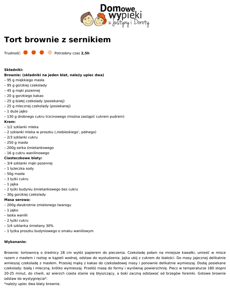 Tort brownie z sernikiem Trudność: Potrzebny czas 2,5h Składniki: Brownie: (składniki na jeden blat, należy upiec dwa) – 95 g miękkiego masła – 95 g gorzkiej czekolady – 45 g mąki pszennej – 20 g gorzkiego kakao – 25 g białej czekolady (posiekanej) – 25 g mlecznej czekolady (posiekanej) – 1 duże jajko – 130 g drobnego cukru trzcinowego (można zastąpić cukrem pudrem) Krem: – 1/2 szklanki mleka – 2 szklanki mleka w proszku (‚niebieskiego’, pełnego) – 2/3 szklanki cukru – 250 g masła – 200g serka śmietankowego – 16 g cukru wanilinowego Ciasteczkowe blaty: – 3/4 szklanki mąki pszennej – 1 łyżeczka sody – 50g masła – 3 łyżki cukru – 1 jajka – 2 łyżki budyniu śmietankowego bez cukru – 30g gorzkiej czekolady Masa serowa: – 200g dwukrotnie zmielonego twarogu – 1 jajko – laska wanilii – 2 łyżki cukru – 1/4 szklanka śmietany 30% – 1 łyżka proszku budyniowego o smaku waniliowym Wykonanie: Brownie: tortownicę o średnicy 28 cm wyłóż papierem do pieczenia. Czekoladę połam na mniejsze kawałki, umieść w misce razem z masłem i roztop w kąpieli wodnej, odstaw do wystudzenia. Jajka ubij z cukrem do białości. Do masy jajecznej delikatnie wmieszaj czekoladę z masłem. Przesiej mąkę z kakao do czekoladowej masy i ponownie delikatnie wymieszaj. Dodaj posiekane czekolady: białą i mleczną, krótko wymieszaj. Przełóż masę do formy i wyrównaj powierzchnię. Piecz w temperaturze 180 stopni 20-25 minut, do chwili, aż wierzch ciasta stanie się błyszczący, a boki zaczną odstawać od brzegów foremki. Gotowe brownie odstaw do wystygnięcia*. *należy upiec dwa blaty brownie. Krem: mleko zagotuj cukrem i cukrem wanilinowym. Odstaw do wystudzenia. Masło utrzyj z serkiem na gładką masę. Powoli dodawaj wystudzone mleko, dalej ucierając. Wsyp przesiane mleko w proszku i miksuj do uzyskania gładkiego kremu. Ciasteczkowe blaty: masło utrzyj z cukrem, dodaj jajka i miksuj ok. 2 minuty. Dodaj budyń w proszku i mąkę wymieszaną z sodą. Wszystko dokładnie połącz. Czekoladę pokrój na małe kawałki i dodaj do ciasta, dokładnie wymieszaj. Ciasto włóż do lodówki na 45 minut. Schłodzone ciasto podziel na 2 równe części (najlepiej zważyć). Wilgotnymi rękoma formuj kulki wielkości orzecha włoskiego i rozkładaj palcami na blaszce wyłożonej papierem do pieczenia formując placki (mają być dwa osobne), każdy o średnicy 28 cm. Piecz 12-13 minut w 200 stopniach ( im dłużej będziemy je piec, tym będą bardziej kruche ). Sernik: wszystkie składniki powinny mieć temperaturę pokojową. Twaróg utrzyj z jajkiem, cukrem i śmietaną na gładką masę. Dodaj budyń i nasionka z laski wanilii. Całość zmiksuj. Masę serową piecz w tortownicy o średnicy 28 cm w 175 stopniach przez ok 45 minut. Gotowy sernik odstaw do całkowitego wystygnięcia. Przełożenie: brownie – 1/4 kremu – blat ciasteczkowy – 1/4 kremu – sernik – 1/4 kremu – blat ciasteczkowy – 1/4 kremu – brownie