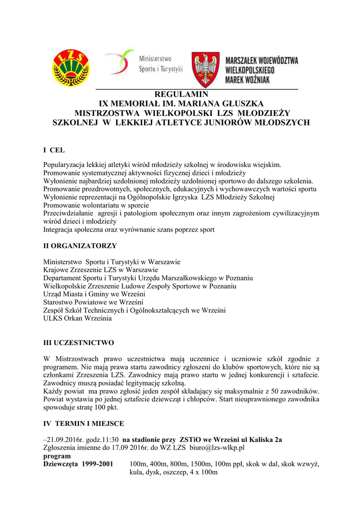 REGULAMIN IX MEMORIAŁ IM. MARIANA GŁUSZKA MISTRZOSTWA WIELKOPOLSKI LZS MŁODZIEŻY SZKOLNEJ W LEKKIEJ ATLETYCE JUNIORÓW MŁODSZYCH I CEL Popularyzacja lekkiej atletyki wśród młodzieży szkolnej w środowisku wiejskim. Promowanie systematycznej aktywności fizycznej dzieci i młodzieży Wyłonienie najbardziej uzdolnionej młodzieży uzdolnionej sportowo do dalszego szkolenia. Promowanie prozdrowotnych, społecznych, edukacyjnych i wychowawczych wartości sportu Wyłonienie reprezentacji na Ogólnopolskie Igrzyska LZS Młodzieży Szkolnej Promowanie wolontariatu w sporcie Przeciwdziałanie agresji i patologiom społecznym oraz innym zagrożeniom cywilizacyjnym wśród dzieci i młodzieży Integracja społeczna oraz wyrównanie szans poprzez sport II ORGANIZATORZY Ministerstwo Sportu i Turystyki w Warszawie Krajowe Zrzeszenie LZS w Warszawie Departament Sportu i Turystyki Urzędu Marszałkowskiego w Poznaniu Wielkopolskie Zrzeszenie Ludowe Zespoły Sportowe w Poznaniu Urząd Miasta i Gminy we Wrześni Starostwo Powiatowe we Wrześni Zespół Szkół Technicznych i Ogólnokształcących we Wrześni ULKS Orkan Września III UCZESTNICTWO W Mistrzostwach prawo uczestnictwa mają uczennice i uczniowie szkół zgodnie z programem. Nie mają prawa startu zawodnicy zgłoszeni do klubów sportowych, które nie są członkami Zrzeszenia LZS. Zawodnicy mają prawo startu w jednej konkurencji i sztafecie. Zawodnicy muszą posiadać legitymację szkolną. Każdy powiat ma prawo zgłosić jeden zespół składający się maksymalnie z 50 zawodników. Powiat wystawia po jednej sztafecie dziewcząt i chłopców. Start nieuprawnionego zawodnika spowoduje stratę 100 pkt. IV TERMIN I MIEJSCE –21.09.2016r. godz.11:30 na stadionie przy ZSTiO we Wrześni ul Kaliska 2a Zgłoszenia imienne do 17.09 2016r. do WZ LZS [email protected] program Dziewczęta 1999-2001 100m, 400m, 800m, 1500m, 100m ppł, skok w dal, skok wzwyż, kula, dysk, oszczep, 4 x 100m Chłopcy 1999-2001 100m,400m, 800m, 1500m, 110m ppł, skok w dal, skok wzwyż, kula, dysk, oszczep, 4 x 100m Sprzęt dla juniora młodszego. W biegach na 100m odbędą się eliminacje i FINAŁ V PUNKTACJA Lok. Pkt. 1 2 3 4 5 6 7 8 9 10 12 13 14 15 16 20 17 15 1 12 11 10 9 8 7 11 6 5 4 3 2 1 3 Powiaty -25 najlepszych wyników w zespole + 2 sztafety Szkoły – 15 najlepszych wyników (nie punktują sztafety) VI NAGRODY Indywidualne Za miejsca I – III w konkurencji medale Drużynowe szkół średnich Za miejsca I – VI puchary Drużynowe powiatów Za miejsca I – VI puchary VII ZGŁOSZENIA Zgodnie z terminem podanym w pkt IV wg wzoru: Nr Imię i nazwisko Data star urodzenia t Konkurencja/ wynik Szkoła Powiat Za aktualne badania lekarskie odpowiedzialni są opiekunowie reprezentacji powiatowych. X UWAGA Wszelkie sprawy sporne i nie ujęte w niniejszym regulaminie rozstrzyga komisja odwoławcza. Uczestnicy imprezy objęci są ubezpieczeniem zbiorowym zawartym przez Wielkopolskie Zrzeszenie LZS w Poznaniu. ORGANIZATORZY