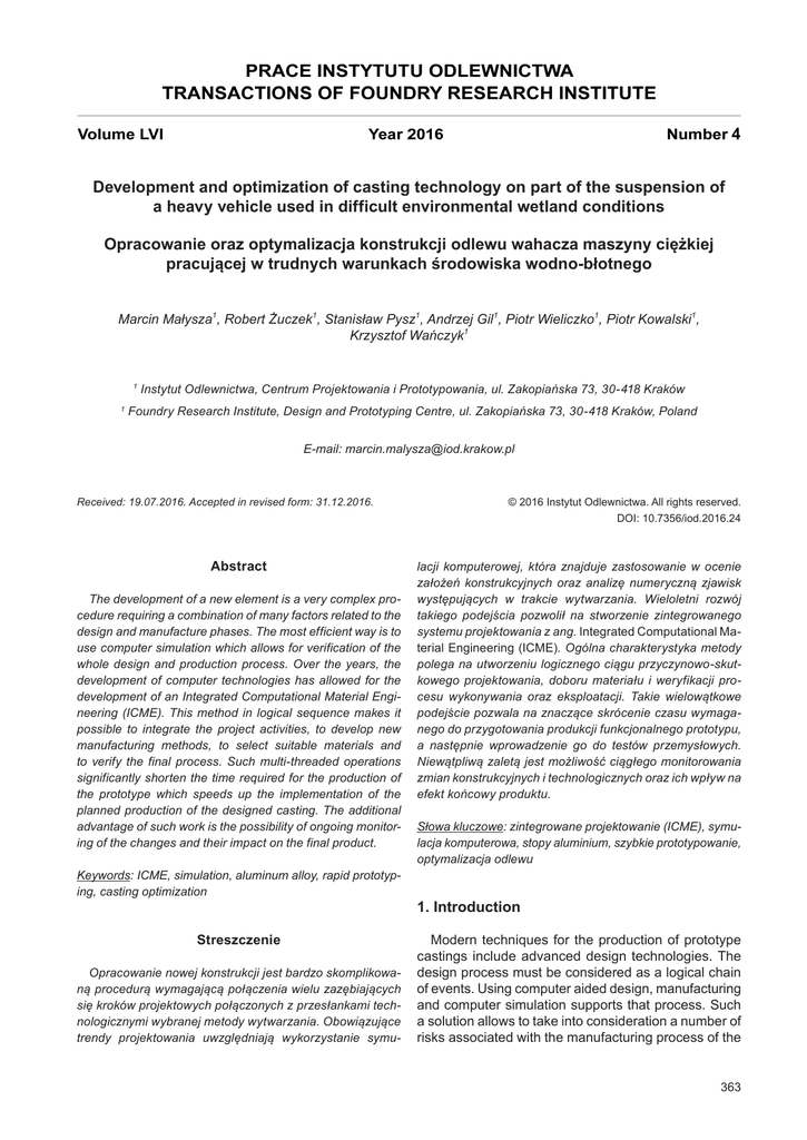 Development and optimization of casting technology on part of the suspension of a heavy vehicle used in difficult environmental wetland conditions Opracowanie oraz optymalizacja konstrukcji odlewu wahacza maszyny ciężkiej pracującej w trudnych warunkach środowiska wodno-błotnego Marcin Małysza1, Robert Żuczek1, Stanisław Pysz1, Andrzej Gil1, Piotr Wieliczko1, Piotr Kowalski1, Krzysztof Wańczyk1 1 1 Instytut Odlewnictwa, Centrum Projektowania i Prototypowania, ul. Zakopiańska 73, 30-418 Kraków Foundry Research Institute, Design and Prototyping Centre, ul. Zakopiańska 73, 30-418 Kraków, Poland E-mail: [email protected] Received: 19.07.2016. Accepted in revised form: 31.12.2016. Abstract The development of a new element is a very complex procedure requiring a combination of many factors related to the design and manufacture phases. The most efficient way is to use computer simulation which allows for verification of the whole design and production process. Over the years, the development of computer technologies has allowed for the development of an Integrated Computational Material Engineering (ICME). This method in logical sequence makes it possible to integrate the project activities, to develop new manufacturing methods, to select suitable materials and to verify the final process. Such multi-threaded operations significantly shorten the time required for the production of the prototype which speeds up the implementation of the planned production of the designed casting. The additional advantage of such work is the possibility of ongoing monitoring of the changes and their impact on the final product. © 2016 Instytut Odlewnictwa. All rights reserved. DOI: 10.7356/iod.2016.24 lacji komputerowej, która znajduje zastosowanie w ocenie założeń konstrukcyjnych oraz analizę numeryczną zjawisk występujących w trakcie wytwarzania. Wieloletni rozwój takiego podejścia pozwolił na stworzenie zintegrowanego systemu projektowania z ang. Integrated Computational Material Engineering (ICME). Ogólna charakterystyka metody polega na utworzeniu logicznego ciągu przyczynowo-skutkowego projektowania, doboru materiału i weryfikacji procesu wykonywania oraz eksploatacji. Takie wielowątkowe podejście pozwala na znaczące skrócenie czasu wymaganego do przygotowania produkcji funkcjonalnego prototypu, a następnie wprowadzenie go do testów przemysłowych. Niewątpliwą zaletą jest możliwość ciągłego monitorowania zmian konstrukcyjnych i technologicznych oraz ich wpływ na efekt końcowy produktu. Słowa kluczowe: zintegrowane projektowanie (ICME), symulacja komputerowa, stopy aluminium, szybkie prototypowanie, optymalizacja odlewu Keywords: ICME, simulation, aluminum alloy, rapid prototyping, casting optimization 1. Introduction Streszczenie Opracowanie nowej konstrukcji jest bardzo skomplikowaną procedurą wymagającą połączenia wielu zazębiających się kroków projektowych połączonych z przesłankami technologicznymi wybranej metody wytwarzania. Obowiązujące trendy projektowania uwzględniają wykorzystanie symu- Modern techniques for the production of prototype castings include advanced design technologies. The design process must be considered as a logical chain of events. Using computer aided design, manufacturing and computer simulation supports that process. Such a solution allows to take into consideration a number of risks associated with the manufacturing process of the 363 M. Małysza, R. Żuczek, S. Pysz, A. Gil, P. Wieliczko, P. Kowalski, K. Wańczyk: Development and optimization of casting… castingprocess part [1,2,3]. Established with the prototype manufacturing of the prototypemethodology casting part includes the optimization of the initial geometry of the hed methodology includes the optimization of the initial geometry swing arm of the heavy vehicle used in difficult wetland m of the heavy vehicle used in difficult wetland environmental environmental prototype withis prototype vehicle with theconditions. highlightedThe casting of the vehicle swing arm the highlighted casting of the swing arm is presented Figure 1. in Figure 1. lation conditions assume that the weight of the vehicle is m = 6000 kg and for one arm constitutes 1/6 of the total weight. The dynamic surplus ratio is on the level of k = 1.3. For the initial design, static impact of external forces is transferred by the fixed pipe to the wheels and powertrain. The example of load schematic for one of the optimized shapes is shown in Figure 3. A B risks associated with the manufacturing process of the prototype casting part [1,2,3]. Established methodology includes the optimization of the initial geometry of the swing arm of the heavy vehicle used in difficult wetland environmental Fig. 1. Prototype and the swing Fig.vehicle 1. Prototype vehicle and the swing conditions. The prototype vehicle with the arm highlighted castingarm of the swing arm is ys. 1. Koncepcja projektowa pojazdu oraz projektowany wahacz presentedRys. in the1.Figure 1. Koncepcja projektowa pojazdu oraz projektowany wahacz C D mization ization procedure is based on the strength criterion and the Fig. 3. The load schematic used in the exploitation e selected casting alloy. The use of the ICME methodology [4] 2. Shape optimization simulation with the force – A ≈ 4600 N, moment – ool to shape design based on the numerical analysis of exploitation B ≈ 36 000 N∙mm and two fix points C, D The optimization procedure is based the strength properties of used cast materials and integrate the on results in the an Rys. 3. Uproszczony schemat obciążenia wykorzystany criterion and the properties of the of an essence. The ICME approach allows for selected reducing casting the time w trakcie analizy eksploatacyjnej, siła A – A ≈ 4600 N, The use the ICME [4]Additional utilises opment andalloy. application of a1. Prototype new designed component. Fig.of vehicle methodology and the swing arm moment – B ≈ 36 000 N∙