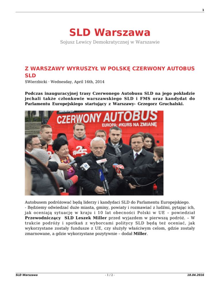 1 SLD Warszawa Sojusz Lewicy Demokratycznej w Warszawie Z WARSZAWY WYRUSZYŁ W POLSKĘ CZERWONY AUTOBUS SLD SWierzbicki · Wednesday, April 16th, 2014 Podczas inauguracyjnej trasy Czerwonego Autobusu SLD na jego pokładzie jechali także członkowie warszawskiego SLD i FMS oraz kandydat do Parlamentu Europejskiego startujący z Warszawy- Grzegorz Gruchalski. Autobusem podróżować będą liderzy i kandydaci SLD do Parlamentu Europejskiego. - Będziemy odwiedzać duże miasta, gminy, powiaty i rozmawiać z ludźmi, pytając ich, jak oceniają sytuację w kraju i 10 lat obecności Polski w UE – powiedział Przewodniczący SLD Leszek Miller przed wyjazdem w pierwszą podróż. – W trakcie podróży i spotkań z wyborcami politycy SLD będą też oceniać, jak wykorzystane zostały fundusze z UE, czy służyły właściwym celom, gdzie zostały zmarnowane, a gdzie wykorzystane pozytywnie – dodał Miller. SLD Warszawa -1/2- 18.04.2016 2 Autobus będzie odwiedzał miasta i wsie w całej Polsce do 25 maja. Będziecie go mogli spotkać także na drogach i ulicach Warszawy i Mazowsza. Do zobaczenia na trasie! Dokument utworzony Wednesday, April 16th, 2014 o 12:07 pm SLD Warszawa -2/2- 18.04.2016