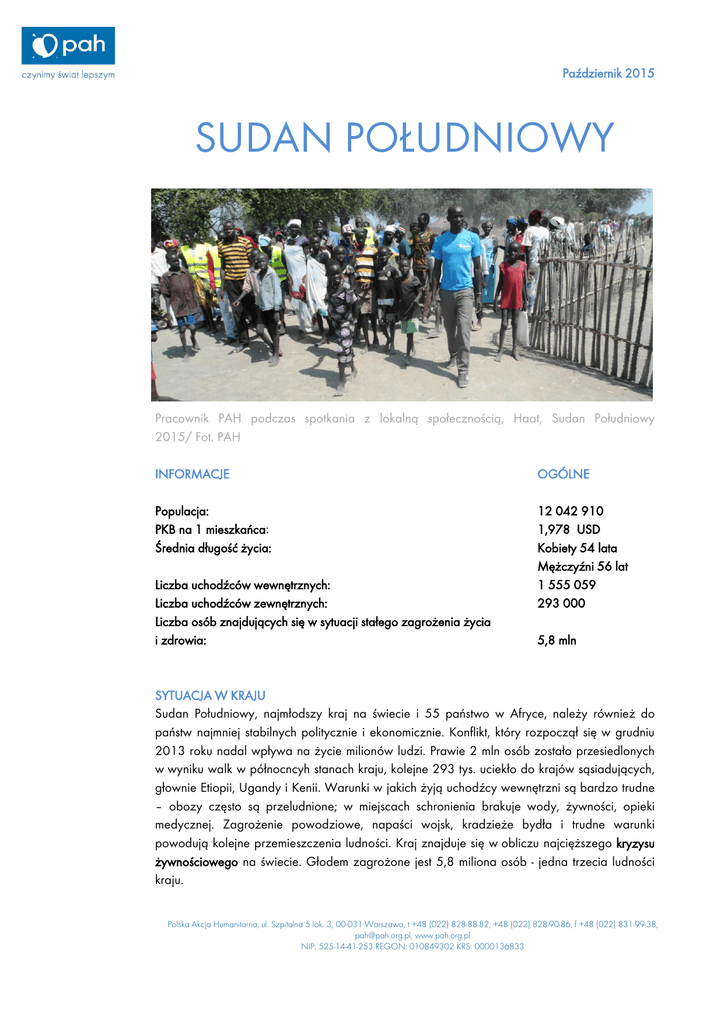 Październik 2015 SUDAN POŁUDNIOWY Pracownik PAH podczas spotkania z lokalną społecznością, Haat, Sudan Południowy 2015/ Fot. PAH INFORMACJE OGÓLNE Populacja: PKB na 1 mieszkańca: Średnia długość życia: 12 042 910 1,978 USD Kobiety 54 lata Mężczyźni 56 lat 1 555 059 293 000 Liczba uchodźców wewnętrznych: Liczba uchodźców zewnętrznych: Liczba osób znajdujących się w sytuacji stałego zagrożenia życia i zdrowia: 5,8 mln SYTUACJA W KRAJU Sudan Południowy, najmłodszy kraj na świecie i 55 państwo w Afryce, należy również do państw najmniej stabilnych politycznie i ekonomicznie. Konflikt, który rozpoczął się w grudniu 2013 roku nadal wpływa na życie milionów ludzi. Prawie 2 mln osób zostało przesiedlonych w wyniku walk w północncyh stanach kraju, kolejne 293 tys. uciekło do krajów sąsiadujących, głownie Etiopii, Ugandy i Kenii. Warunki w jakich żyją uchodźcy wewnętrzni są bardzo trudne – obozy często są przeludnione; w miejscach schronienia brakuje wody, żywności, opieki medycznej. Zagrożenie powodziowe, napaści wojsk, kradzieże bydła i trudne warunki powodują kolejne przemieszczenia ludności. Kraj znajduje się w obliczu najcięższego kryzysu żywnościowego na świecie. Głodem zagrożone jest 5,8 miliona osób - jedna trzecia ludności kraju. Polska Akcja Humanitarna, ul. Szpitalna 5 lok. 3, 00-031 Warszawa, t +48 (022) 828-88-82, +48 (022) 828-90-86, f +48 (022) 831-99-38, [email protected], www.pah.org.pl NIP: 525-14-41-253 REGON: 010849302 KRS: 0000136833 Październik 2015 POMOC HUMANITARNA UDZIELANA PRZEZ PAH Polska Akcja Humanitarna w Sudanie Południowym działa od 2006 roku. W ramach pomocy natychmiastowej (emergency) finansowanej przez Komisję Europejską (ECHO) oraz Common Humanitarian Funds (CHF) prowadzi działania wodno-sanitarne – „WASH” (Water, Sanitation and Hygiene) i dystrybucję produktów nieżywnościowych (NFIs – non food items: moskitiery, koce, garnki, tabletki uzdatniające wodę, wiadra, mydło – w zależności od potrzeb). PROGRAM WODNO-SANITARNY W STANIE JONGLEI Od początku działalności PAH w Sudanie Południowym wybudowanych zostało 184 nowych studni, a wyremontowanych 524. PAH zajmuje prestiżowe stanowisko WASH State Focal Point w stanie Jonglei. Oznacza to: koordynację działań wodno-sanitarnych wszystkich podmiotów działających w klastrze wodno-sanitarnym w stanie Jonglei, monitoring dystrybucji materiałów nieżywnościowych z obszaru WASH (mydła, zestawy higieniczne,zbiorniki na wodę itp.), organizację działań rozpoznawczych z zakresu wodno-sanitarnego oraz interwencji we współpracy z partnerami, uczestniczenie w spotkaniach klastra wodno-sanitarnego oraz reprezentowanie go na szczeblu krajowym, współpracę z rządem Sudanu Południowego w celu rozszerzenia strategii wodno-sanitarnej na obszar całego kraju; koordynację odpowiedzi na nagłe wybuchy epidemii chorób przenoszonych przez zanieczyszczoną wodę i inne pojawiające się gwałtowne kryzysy. Działania PAH w 2015 roku: Obecnie na Misji w Sudanie Południowym reailzowanych jest pięć projektów: ECHO (1 500 000 EUR): projekt wodno-sanitarny i dystrybucja nieżywnościowych środków pierwszej potrzeby dla osób najbardziej narażonych na cierpienie w sytuacjach kryzysu humanitarnego, głównie w stanie Jonglei. CHF (1 300 000 USD): projekt wodno-sanitarny dla osób najbardziej narażonych na cierpienie w sytuacjach kryzysu humanitarnego w stanach Jonglei, Unity i Upper Nile. RRF (166 000 USD): project wodno-sanitarny z zakersu pomocy natychmiastowej w regionie dotkniętym epidemią cholery (Bor, stan Jonglei) CHF 2 (199 000 USD) – projekt wodny w Ayod w stanie Jonglei. W ramach projektu PAH współpracuje z lokalną społeczności – lokalnymi władzami, szkołami, kobiecymi grupami – nad poprawą warunków sanitarnych w regionie (naprawa studni, szkolenia dla mechaników pomp, edukacja higieniczna dla kobiet i lokalnych liderów) GIZ (792 000 Euro) – project wodny w mieście Pibor i Gumuruk, skupiony na analizie punktów wodnych i konstrukcji wież wodnych, które dostarczać będą wodę do mieszkańców obu miast. Dodatkowo PAH promować będzie zrównoważone metody oczyszczania wody na poziomie domu. Polska Akcja Humanitarna, ul. Szpitalna 5 lok. 3, 00-031 Warszawa, t +48 (022) 828-88-82, +48 (022) 828-90-86, f +48 (022) 831-99-38, [email protected], www.pah.org.pl NIP: 525-14-41-253 REGON: 010849302 KRS: 0000136833 Październik 2015 PAH dbając o właściwe warunki wodno – sanitarne przyczynia się również do zmniejszenia zachorowalności na choroby wywoływane używaniem brudnej wody. W czerwcu 2015 roku Ministerstwo Zdrowia Sudanu Południowego ogłosiło epidemię cholery. W związku z zaistniałą sytuacją, dzięki finansowaniu ECHO i CHF, PAH podjęła działania mające na celu zapobieganie dalszego rozprzestrzeniania się choroby. W pierwszych tygodniach Grupa Reagowania Natychmiastowego PAH (Emergency Response Team) skupiła się na działaniach w Jubie i Bor. Przeprowadziliśmy badania wody, dzięki którym określono stopień jej skażenia; przeszkoliliśmy promotorów higieny oraz szkolne kluby; zagrożonej epidemią społeczności przekazaliśmy wiadra i mydło. Technicy PAH naprawili zepsute studnie, woda w ujęciach została schlorowana. Na bieżąco trwa kampania prewencyjna, również dzięki świeżo pozyskanym środkom z Rapid Response Fund. PRZYKŁADOWE KOSZTY Remont lub budowa studni: Jedna studnia według standardów humanitarnych SPHERE służy 500 osobom. Naprawa jednej studni to ok. 2000 USD (części i obsługa) natomiast wywiercenie nowej studni to koszt ok. 20 000 USD (w zależności od miejsca wywiercenia danej studni). Budowanie latryn i zbiorników do mycia rąk. Według standardów jedna latryna służy 50 osobom. Koszt latryny to około 1000 USD (części i obsługa, koszt zmienia się w zależności od głębokości, zabezpieczenia przeciwdeszczoweg