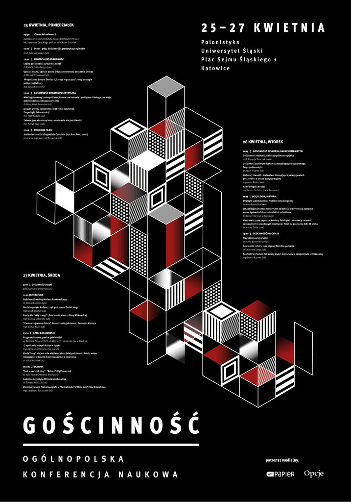 25 KWIETNIA, PONIEDZIAŁEK 09:30 | Otwarcie konferencji 25–27 KWIETNIA Zastępca dyrektora Instytutu Nauk o Literaturze Polskiej im. Ireneusza Opackiego prof. dr hab. Adam Dziadek Polonistyka 10:00 | Drzwi i próg. Gościnność i gramatyka przyimków Uniwersytet Śląski prof. Tadeusz Sławek (uś) 12:00 | FILOZOFIA (W) GOŚCINNOŚCI Logika gościnności: Lyotard i Levinas dr Piotr Schollenberger (uw) Ugościć ducha, ugościć duchy. Oduczanie Derridy, oduczanie Derridą dr Michał Krzykawski (uś) Plac Sejmu Śląskiego 1 Katowice Wrogościnna Europa. Derrida i „kryzys migracyjny” – trzy strategie politycznej lektury mgr Łukasz Moll (uś) 15:00 | GOŚCINNOŚĆ NIEANTROPOCENTRYCZNA Międzygatunkowy kosmopolityzm, kosmiczna komunia : polityczne i teologiczne wizje gościnności nieantropocentrycznej dr Alina Mitek-Dziemba (uś) Jacques Derrida i gościnność wobec nie-ludzkiego. Zoopolityki dekonstrukcji mgr Piotr Sadzik (uw) Zwierzę jako absolutny Inny – otwieranie nie/możliwości mgr Patryk Szaj (uam) 17:00 | PROJEKCJA FILMU Ausländer raus! Schlingensiefs Container (reż. Paul Poet, 2000) prelekcja: mgr Marzena Boniecka (uś) 26 KWIETNIA, WTOREK 10:15 | GOŚCINNOŚĆ DYSKURSU/NAUKI/HUMANISTYKI Gość/inność wolności. Refleksje późnoeuropejskie prof. Patrycja Tomczak (uam) Gościnność archiwum dyskursu antropologiczno-kulturowego. Zarys problematyki dr Adam Pisarek (uś) Wolność, równość i braterstwo. O utopijnych paradygmatach gościnności w sztuce partycypacyjnej mgr Anna Batko (pan) Ramy wrogościnności mgr Dorota Grobelna (ua w Poznaniu) 12:15 | SOCJOLOGIA, HISTORIA Strategie sublokatorskie: Problem metodologiczny dr Anna Zawadzka (pan) Echa (nie)gościnności: Historyczne zbieżności w brytyjskiej postawie wobec żydowskich i muzułmańskich uchodźców dr Daniel Tilles (up w Krakowie) Kiedy mężczyzna zapraszał kobietę. Publicyści i naukowcy na temat edukacyjnych i zawodowych możliwości Polek na przełomie XIX i XX wieku dr Maciej Duda (uam) 15:00 | GOŚCINNOŚĆ DYSCYPLIN Niegościnność dyscyplin dr Marta Baron-Milian (uś) Gościnność różnicy. Luce Irigaray filozofia spotkania dr Katarzyna Szopa (uś) Konflikt i terytorium. Tak zwany kryzys migracyjny w perspektywie schizoanalizy mgr Dawid Kujawa (uś) 27 KWIETNIA, ŚRODA 9:00 | Gościnność krytyki prof. Krzysztof Uniłowski (uś) 11:00 | LITERATURA Gościnność według Mariana Pankowskiego dr Michał Bandura (uw) Derrida spotyka Audena, czyli gościnność Sośnickiego mgr Jakub Skurtys (uw) Poetyckie “akty trwogi”. Gościnność wiersza Ilony Witkowskiej mgr Monika Glosowitz (uś) “Ciemne zagracone dziury”. Przestrzenie gościnności Tadeusza Kantora mgr Michał Kisiel (uś) 13:30 | JĘZYKI GOŚCINNOŚCI Pragmakulturowe granice gościnności dr Karolina Pospiszil (uś), dr Wojciech Hofmański (uk w Pradze) O spotkaniu różnych kultur w języku mgr Agnieszka Romaneczko (umsc) Kiedy “Inny” nie jest mile widziany: obraz (nie) gościnności Polski wobec mniejszości w świetle mowy nienawiści w internecie dr Julita Woźniak (uł) 16:00 | LITERATURA “Jest u nas ktoś obcy”. “Rubież” Olgi Tokarczuk dr hab. Iwona Gralewicz-Wolny (uś) Gościnna Argentyna Witolda Gombrowicza dr Tomasz Kaliściak (uś) Ziemi przypisani. Pismo topografii w “Australczyku” i “Bene nati” Elizy Orzeszkowej mgr Katarzyna Pastuszek (uś) patronat medialny: