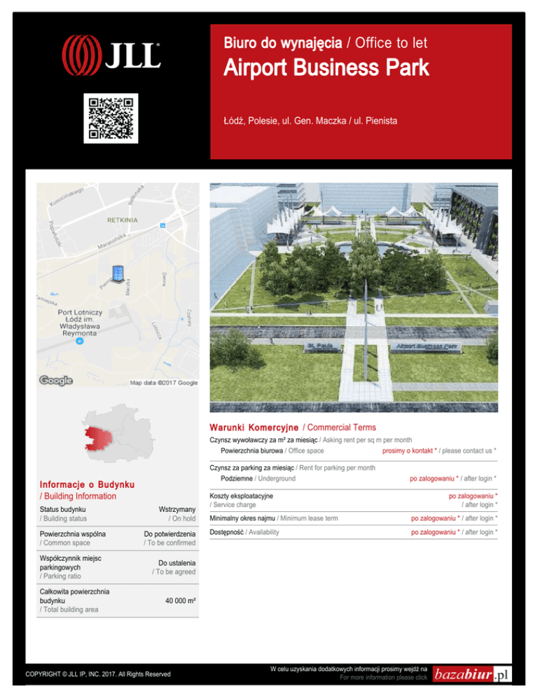 Biuro do wynajęcia / Office to let Airport Business Park Łódź, Polesie, ul. Gen. Maczka / ul. Pienista Warunki Komercyjne / Commercial Terms Czynsz wywoławczy za m² za miesiąc / Asking rent per sq m per month Powierzchnia biurowa / Office space prosimy o kontakt * / please contact us * Czynsz za parking za miesiąc / Rent for parking per month Podziemne / Underground Informacje o Budynku / Building Information Status budynku / Building status Powierzchnia wspólna / Common space Współczynnik miejsc parkingowych / Parking ratio Całkowita powierzchnia budynku / Total building area Wstrzymany / On hold Do potwierdzenia / To be confirmed po zalogowaniu * / after login * Koszty eksploatacyjne / Service charge po zalogowaniu * / after login * Minimalny okres najmu / Minimum lease term po zalogowaniu * / after login * Dostępność / Availability po zalogowaniu * / after login * Do ustalenia / To be agreed 40 000 m² COPYRIGHT © JLL IP, INC. 2017. All Rights Reserved W celu uzyskania dodatkowych informacji prosimy wejdź na For more information please click Standardowe Wykończenie / Standard Fit-Out Typowy Plan Piętra / Typical Floor Plan Klimatyzacja / Air conditioning Podnoszone podłogi / Raised floor Podwieszany sufit / Suspended ceiling Okablowanie telefoniczne / Telephone cabling Okablowanie komputerowe / Computer cabling Okablowanie elektryczne / Power cabling Tryskacze / Sprinklers Czujniki dymu / Smoke detectors Wykładzina / Carpeting Podział powierzchni ściankami / Wall partitioning Recepcja / Reception Ochrona budynku / Security Kable światłowodowe / Fiber optics Uchylne okna / Openable windows W celu uzyskania dodatkowych informacji lub zorganizowania spotkania prosimy o kontakt: / For more information or to arrange a viewing please contact: +48 22 167 00 00 Niniejsze warunki mają charakter wyłącznie informacyjny i nie stanowią części wiążącej oferty lub umowy. / The Property Particulars are for information purposes only and do not form any part of binding offer or contract. COPYRIGHT © JLL IP, INC. 2017. All Rights Reserved W celu uzyskania dodatkowych informacji prosimy wejdź na For more information please click