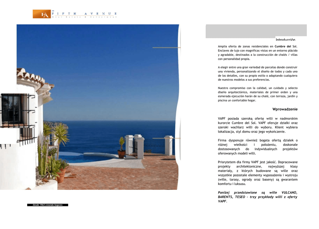 Introducción Amplia oferta de zonas residenciales en Cumbre del Sol. Enclaves de lujo con magníficas vistas en un entorno plácido y agradable, destinados a la construcción de chalés / villas con personalidad propia. A elegir entre una gran variedad de parcelas donde construir una vivienda, personalizando el diseño de todos y cada uno de los detalles, con su propio estilo o adaptando cualquiera de nuestros modelos a sus preferencias. Nuestro compromiso con la calidad, un cuidado y selecto diseño arquitectónico, materiales de primer orden y una esmerada ejecución harán de su chalé, con terraza, jardín y piscina un confortable hogar. Wprowadzenie VAPF posiada szeroką ofertę willi w nadmorskim kurorcie Cumbre del Sol. VAPF oferuje działki oraz szeroki wachlarz willi do wyboru. Klient wybiera lokalizacja, styl domu oraz jego wykończenie. Firma dysponuje również bogata ofertą działek o różnej wielkości i położeniu, doskonale dostosowanych do indywidualnych projektów oferowanych modeli willi. Priorytetem dla firmy VAPF jest jakość. Dopracowane projekty architektoniczne, najwyższej klasy materiały, z których budowane są wille oraz wszystkie pozostałe elementy wyposażenia i wystroju (wille, tarasy, ogrody oraz baseny) są gwarantem komfortu i luksusu. Poniżej przedstawione są wille VULCANO, BARENTS, TESEO – trzy przykłady willi z oferty VAPF. Desde 1963 creando hogares 64^854 VAPF G R U P O Desde 1963 creando h Modelo Personalizado - Peisonolize Destgn Desde 1963 Modelo Personalizado - Personolize Üesign Modelo Personalizodo - Personolize Design