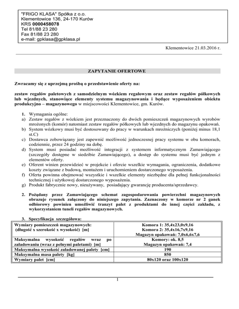 "FRIGO KLASA" Spółka z o.o. Klementowice 136, 24-170 Kurów KRS 0000458078 Tel 81/88 23 280 Fax 81/88 23 280 e-mail: [email protected] Klementowice 21.03.2016 r. ZAPYTANIE OFERTOWE Zwracamy się z uprzejmą prośbą o przedstawienie oferty na: zestaw regałów paletowych z samodzielnym wózkiem regałowym oraz zestaw regałów półkowych lub wjezdnych, stanowiące elementy systemu magazynowania i będące wyposażeniem obiektu produkcyjno – magazynowego w miejscowości Klementowice, gm. Kurów. 1. Wymagania ogólne: a) Zestaw regałów z wózkiem jest przeznaczony do dwóch pomieszczeń magazynowych wyrobów mrożonych (komór) natomiast zestaw regałów półkowych lub wjezdnych do magazynu opakowań. b) System wózkowy musi być dostosowany do pracy w warunkach mroźniczych (poniżej minus 18,1 st.C) c) Dostawca zobowiązany jest zapewnić możliwość jednoczesnej pracy systemu w obu komorach, codziennie, przez 24 godziny na dobę. d) System musi posiadać możliwość integracji z systemem informatycznym Zamawiającego (szczegóły dostępne w siedzibie Zamawiającego), a dostęp do systemu musi być jednym z elementów oferty. e) Oferent winien przewidzieć w projekcie i ofercie wszelkie wymagania, ograniczenia, dodatkowe koszty związane z budową, montażem i uruchomieniem dostarczonego wyposażenia. f) Oferta powinna obejmować wszystkie i wszelkie elementy niezbędne dla pełnej funkcjonalności technicznej i użytkowej dostarczonego wyposażenia. g) Produkt fabrycznie nowy, nieużywany, posiadający gwarancję producenta/sprzedawcy. 2. Pożądany przez Zamawiającego schemat zagospodarowania powierzchni magazynowych obrazuje rysunek załączony do niniejszego zapytania. Zaznaczony w komorze nr 2 ganek odbiorowy powinien umożliwić tranzyt palet z produktami do innej części zakładu, z wykorzystaniem tuneli regałów magazynowych. 3. Specyfikacja szczegółowa: Wymiary pomieszczeń magazynowych: (długość x szerokość x wysokość) [m] Komora 1: 35,4x23,0x9,16 Komora 2: 35,4x16,7x9,16 Magazyn opakowań: 7,0x6,6x7,6 Komory: ok. 8,5 Magazyn opakowań: 7,4 190 850 80x120 oraz 100x120 Maksymalna wysokość regałów wraz po załadowaniu (wraz z pełnymi paletami) [m] Maksymalna wysokość załadowanej palety [cm] Maksymalna masa palety [kg] Wymiary palet [cm] 1 4. Miejsce dostawy: FRIGO KLASA Sp. z o.o., Klementowice 136, 24-170 Kurów 5. Złożona oferta powinna zawierać co najmniej: nazwę i adres oferenta, opis nawiązujący do wyspecyfikowanych parametrów i wymagań wyszczególnionych w zapytaniu ofertowym, wartość oferty (netto oraz brutto), termin ważności oferty warunki gwarancji termin dostawy. Wskazane jest, by oferta zawierała również inne, dodatkowe informacje, istotne dla jej atrakcyjności i opłacalności oraz związane ze specyfiką oferowanego sprzętu. 6. Oferta powinna być sporządzona na papierze firmowym oferenta lub opatrzona pieczątką firmową, posiadać datę sporządzenia, oraz powinna być podpisana przez osobę uprawnioną do reprezentowania oferenta. 7. Oferta powinna być przesłana za pośrednictwem poczty, kuriera bądź też dostarczona osobiście do siedziby Kupującego. 8. Osoba do kontaktów / sprawy techniczne: Andrzej Kurant: Tel: +48 604 193 360, Email: [email protected] 9. Oferty należy składać w terminie do dnia 08.04.2016 r. 10. Wybór najkorzystniejszej oferty nastąpi w oparciu o następujące kryteria: 1. Cena najniższa 100 % Ranking ofert zostanie ustalony od oferty z najniższą ceną (otrzyma 100 pkt), do oferty z cena najwyższą. Liczba punktów kolejnych ofert zostanie ustalona wg wzoru: 100-[(cena danej oferty-cena oferty najtańszej)x100/cena oferty najtańszej] 11. Wykluczone z postępowania zostaną oferty nie zawierające odniesień do wszystkich wymagań i specyfikacji zapytania oraz takie, w których przedmiot oferty nie odpowiada tym wymaganiom. Prezes Zarządu Rafał Podstawka 2 Frigo Klasa Sp. z o.o. Schemat zagospodarowania powierzchni magazynowych Załącznik do zapytania ofertowego z dnia 21.03.2016 na dostawę regałów paletowych KOMORA NR 1 KOMORA NR 2 ganek odbiorowy o wymiarach ok. 4x4m Ganek odbiorowy winien umożliwiać swobodną pracę wózka widłowego odbierającego i podającego palety z produktam 3