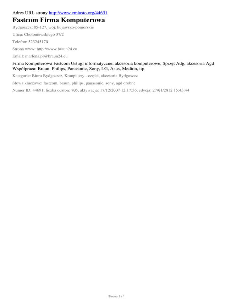 Adres URL strony http://www.emiasto.org/44691 Fastcom Firma Komputerowa Bydgoszcz, 85-127, woj. kujawsko-pomorskie Ulica: Chołoniewskiego 37/2 Telefon: 523245170 Strona www: http://www.braun24.eu Email: [email protected] Firma Komputerowa Fastcom Usługi informatyczne, akcesoria komputerowe, Sprzęt Adg, akcesoria Agd Współpraca: Braun, Philips, Panasonic, Sony, LG, Asus, Medion, itp. Kategorie: Biuro Bydgoszcz, Komputery - części, akcesoria Bydgoszcz Słowa kluczowe: fastcom, braun, philips, panasonic, sony, agd drobne Numer ID: 44691, liczba odsłon: 705, aktywacja: 17/12/2007 12:17:36, edycja: 27/01/2012 15:45:44 Strona 1 / 1
