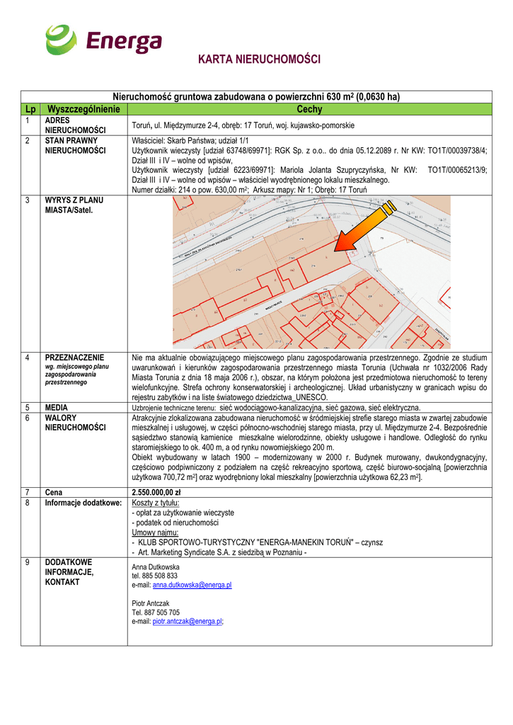 KARTA NIERUCHOMOŚCI Lp 1 2 Nieruchomość gruntowa zabudowana o powierzchni 630 m2 (0,0630 ha) Wyszczególnienie Cechy ADRES NIERUCHOMOŚCI STAN PRAWNY NIERUCHOMOŚCI 3 WYRYS Z PLANU MIASTA/Satel. 4 PRZEZNACZENIE 5 6 MEDIA WALORY NIERUCHOMOŚCI 7 8 Cena Informacje dodatkowe: 9 DODATKOWE INFORMACJE, KONTAKT wg. miejscowego planu zagospodarowania przestrzennego Toruń, ul. Międzymurze 2-4, obręb: 17 Toruń, woj. kujawsko-pomorskie Właściciel: Skarb Państwa; udział 1/1 Użytkownik wieczysty [udział 63748/69971]: RGK Sp. z o.o.. do dnia 05.12.2089 r. Nr KW: TO1T/00039738/4; Dział III i IV – wolne od wpisów, Użytkownik wieczysty [udział 6223/69971]: Mariola Jolanta Szupryczyńska, Nr KW: TO1T/00065213/9; Dział III i IV – wolne od wpisów – właściciel wyodrębnionego lokalu mieszkalnego. Numer działki: 214 o pow. 630,00 m2; Arkusz mapy: Nr 1; Obręb: 17 Toruń Nie ma aktualnie obowiązującego miejscowego planu zagospodarowania przestrzennego. Zgodnie ze studium uwarunkowań i kierunków zagospodarowania przestrzennego miasta Torunia (Uchwała nr 1032/2006 Rady Miasta Torunia z dnia 18 maja 2006 r.), obszar, na którym położona jest przedmiotowa nieruchomość to tereny wielofunkcyjne. Strefa ochrony konserwatorskiej i archeologicznej. Układ urbanistyczny w granicach wpisu do rejestru zabytków i na liste światowego dziedzictwa_UNESCO. Uzbrojenie techniczne terenu: sieć wodociągowo-kanalizacyjna, sieć gazowa, sieć elektryczna. Atrakcyjnie zlokalizowana zabudowana nieruchomość w śródmiejskiej strefie starego miasta w zwartej zabudowie mieszkalnej i usługowej, w części północno-wschodniej starego miasta, przy ul. Międzymurze 2-4. Bezpośrednie sąsiedztwo stanowią kamienice mieszkalne wielorodzinne, obiekty usługowe i handlowe. Odległość do rynku staromiejskiego to ok. 400 m, a od rynku nowomiejskiego 200 m. Obiekt wybudowany w latach 1900 – modernizowany w 2000 r. Budynek murowany, dwukondygnacyjny, częściowo podpiwniczony z podziałem na część rekreacyjno sportową, część biurowo-socjalną [powierzchnia użytkowa 700,72 m2] oraz wyodrębniony lokal mieszkalny [powierzchnia użytkowa 62,23 m2]. 2.550.000,00 zł Koszty z tytułu: - opłat za użytkowanie wieczyste - podatek od nieruchomości Umowy najmu: - KLUB SPORTOWO-TURYSTYCZNY "ENERGA-MANEKIN TORUŃ" – czynsz - Art. Marketing Syndicate S.A. z siedzibą w Poznaniu Anna Dutkowska tel. 885 508 833 e-mail: [email protected] Piotr Antczak Tel. 887 505 705 e-mail: [email protected];