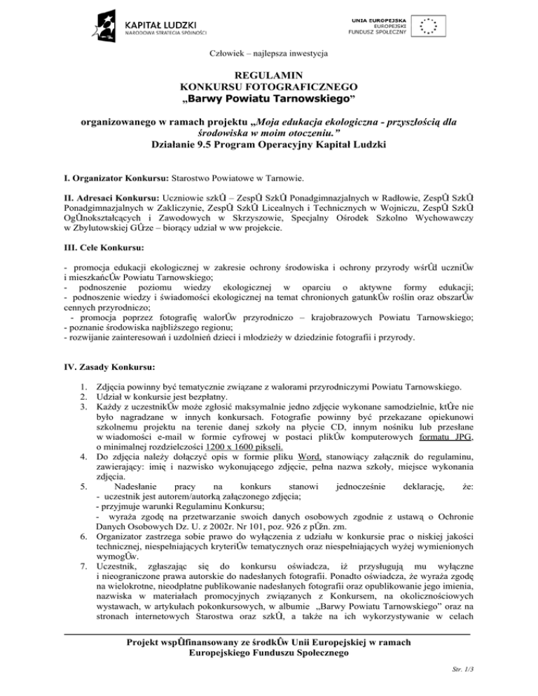 Człowiek – najlepsza inwestycja REGULAMIN KONKURSU FOTOGRAFICZNEGO „Barwy Powiatu Tarnowskiego” organizowanego w ramach projektu „Moja edukacja ekologiczna - przyszłością dla środowiska w moim otoczeniu.” Działanie 9.5 Program Operacyjny Kapitał Ludzki I. Organizator Konkursu: Starostwo Powiatowe w Tarnowie. II. Adresaci Konkursu: Uczniowie szkół – Zespół Szkół Ponadgimnazjalnych w Radłowie, Zespół Szkół Ponadgimnazjalnych w Zakliczynie, Zespół Szkół Licealnych i Technicznych w Wojniczu, Zespół Szkół Ogólnokształcących i Zawodowych w Skrzyszowie, Specjalny Ośrodek Szkolno Wychowawczy w Zbylutowskiej Górze – biorący udział w ww projekcie. III. Cele Konkursu: - promocja edukacji ekologicznej w zakresie ochrony środowiska i ochrony przyrody wśród uczniów i mieszkańców Powiatu Tarnowskiego; - podnoszenie poziomu wiedzy ekologicznej w oparciu o aktywne formy edukacji; - podnoszenie wiedzy i świadomości ekologicznej na temat chronionych gatunków roślin oraz obszarów cennych przyrodniczo; - promocja poprzez fotografię walorów przyrodniczo – krajobrazowych Powiatu Tarnowskiego; - poznanie środowiska najbliższego regionu; - rozwijanie zainteresowań i uzdolnień dzieci i młodzieży w dziedzinie fotografii i przyrody. IV. Zasady Konkursu: 1. Zdjęcia powinny być tematycznie związane z walorami przyrodniczymi Powiatu Tarnowskiego. 2. Udział w konkursie jest bezpłatny. 3. Każdy z uczestników może zgłosić maksymalnie jedno zdjęcie wykonane samodzielnie, które nie było nagradzane w innych konkursach. Fotografie powinny być przekazane opiekunowi szkolnemu projektu na terenie danej szkoły na płycie CD, innym nośniku lub przesłane w wiadomości e-mail w formie cyfrowej w postaci plików komputerowych formatu JPG, o minimalnej rozdzielczości 1200 x 1600 pikseli. 4. Do zdjęcia należy dołączyć opis w formie pliku Word, stanowiący załącznik do regulaminu, zawierający: imię i nazwisko wykonującego zdjęcie, pełna nazwa szkoły, miejsce wykonania zdjęcia. 5. Nadesłanie pracy na konkurs stanowi jednocześnie deklarację, że: - uczestnik jest autorem/autorką załączonego zdjęcia; - przyjmuje warunki Regulaminu Konkursu; - wyraża zgodę na przetwarzanie swoich danych osobowych zgodnie z ustawą o Ochronie Danych Osobowych Dz. U. z 2002r. Nr 101, poz. 926 z późn. zm. 6. Organizator zastrzega sobie prawo do wyłączenia z udziału w konkursie prac o niskiej jakości technicznej, niespełniających kryteriów tematycznych oraz niespełniających wyżej wymienionych wymogów. 7. Uczestnik, zgłaszając się do konkursu oświadcza, iż przysługują mu wyłączne i nieograniczone prawa autorskie do nadesłanych fotografii. Ponadto oświadcza, że wyraża zgodę na wielokrotne, nieodpłatne publikowanie nadesłanych fotografii oraz opublikowanie jego imienia, nazwiska w materiałach promocyjnych związanych z Konkursem, na okolicznościowych wystawach, w artykułach pokonkursowych, w albumie „Barwy Powiatu Tarnowskiego” oraz na stronach internetowych Starostwa oraz szkół, a także na ich wykorzystywanie w celach Projekt współfinansowany ze środków Unii Europejskiej w ramach Europejskiego Funduszu Społecznego Str. 1/3 Człowiek – najlepsza inwestycja promocyjnych projektu, w szczególności na utrwalanie, modyfikowanie i zwielokrotnianie fotografii każdą techniką, w tym m. in. drukarską, reprograficzną, zapisu magnetycznego, cyfrową, audiowizualną, na jakichkolwiek nośnikach, bez ograniczeń co do ilości i wielkości nakładu, oraz rozpowszechnianie fotografii poprzez publiczne udostępnianie w taki sposób, aby każdy mógł mieć do nich dostęp w miejscu i w czasie przez siebie wybranym, w szczególności w sieciach komputerowych i Internecie. V. Terminarz: 1. Termin zgłaszania zdjęć do opiekunów upływa 11 maja 2012r. Fotografie nadesłane po terminie nie będą brane pod uwagę. Opiekunowie szkolni zobowiązani są, po skompletowaniu całości prac, do przekazania ich na płycie CD do biura projektu w terminie do 15 maja 2012r. 2. Organizator zastrzega sobie prawo zmiany terminów określonych w niniejszym regulaminie. VI. Zasady oceny i wyboru zwycięzców: 1. Ocena zdjęć będzie przebiegać dwuetapowo: Pierwszy etap stanowi wyłonienie do dnia 18 maja 2012r przez jury (opiekunowie szkolni projektu i koordynator) obradujące w biurze projektu w Starostwie. Każdy z opiekunów wybierze po 10 fotografii ze swojej szkoły, natomiast koordynator po 10 zdjęć z każdej szkoły, przyznając wybranym pracom punkty zgodnie ze skalą od 1pkt do 10pkt. Na ocenę końcową fotografii składać się będzie suma punktów otrzymanych od jurorów. Jury oceniać będzie: oryginalność prac, technikę wykonania prac, zgodność z regulaminem Konkursu. Wszystkie prace biorące udział w konkursie, oceniane będą według tych samych kryteriów. Decyzje Jury są ostateczne. Najciekawsze fotografie zostaną zebrane i wystawione na wystawie w każdej ze szkół po 10 fotografii o największej liczbie punktów. Drugi etap stanowi wyłonienie przez rodziców na zebraniach szkolnych spośród wybranych przez ww jury fotografii po trzy zdjęcia w każdej szkole. O zwycięstwie zdecyduje liczba głosów oddanych przez rodziców. Trzy zdjęcia w każdej ze szkół, które otrzymają największą liczbę głosów zostaną nagrodzone. Informacja o zwycięzcach Konkursu zostanie umieszczona na tablicy ogłoszeń w szkole oraz na stronach internetowych. W czerwcu 2012 nastąpi uroczyste podsumowanie Konkursu, ogłoszenie wyników, rozdanie nagród, prezentacja prac nagrodzonych i otwarcie wystawy pokonkursowej w Starostwie. Najciekawsze fotografie zostaną zebrane i wydane w albumie „Barwy powiatu Tarnowskiego” prezentującym walory przyrodnicze regionu tarnowskiego. VII. Postanowienia końcowe: 1. Konkurs jest finansowany ze środków Unii Europejskiej w ramach Europejskiego Funduszu Społecznego. 2. Regula