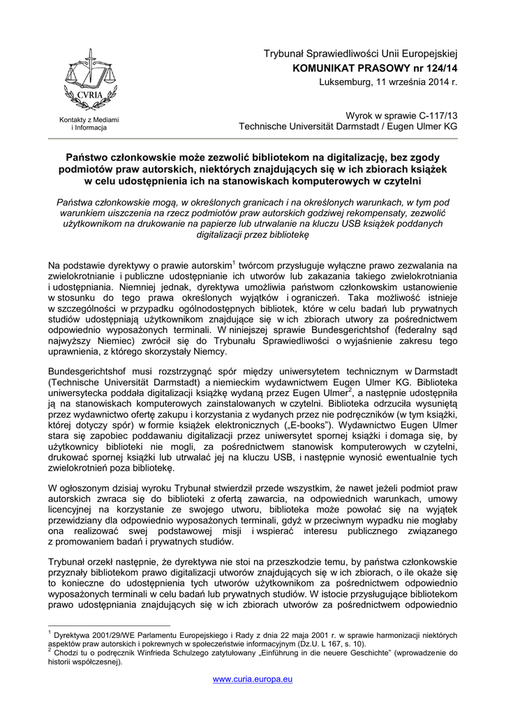 Trybunał Sprawiedliwości Unii Europejskiej KOMUNIKAT PRASOWY nr 124/14 Luksemburg, 11 września 2014 r. Kontakty z Mediami i Informacja Wyrok w sprawie C-117/13 Technische Universität Darmstadt / Eugen Ulmer KG Państwo członkowskie może zezwolić bibliotekom na digitalizację, bez zgody podmiotów praw autorskich, niektórych znajdujących się w ich zbiorach książek w celu udostępnienia ich na stanowiskach komputerowych w czytelni Państwa członkowskie mogą, w określonych granicach i na określonych warunkach, w tym pod warunkiem uiszczenia na rzecz podmiotów praw autorskich godziwej rekompensaty, zezwolić użytkownikom na drukowanie na papierze lub utrwalanie na kluczu USB książek poddanych digitalizacji przez bibliotekę Na podstawie dyrektywy o prawie autorskim1 twórcom przysługuje wyłączne prawo zezwalania na zwielokrotnianie i publiczne udostępnianie ich utworów lub zakazania takiego zwielokrotniania i udostępniania. Niemniej jednak, dyrektywa umożliwia państwom członkowskim ustanowienie w stosunku do tego prawa określonych wyjątków i ograniczeń. Taka możliwość istnieje w szczególności w przypadku ogólnodostępnych bibliotek, które w celu badań lub prywatnych studiów udostępniają użytkownikom znajdujące się w ich zbiorach utwory za pośrednictwem odpowiednio wyposażonych terminali. W niniejszej sprawie Bundesgerichtshof (federalny sąd najwyższy Niemiec) zwrócił się do Trybunału Sprawiedliwości o wyjaśnienie zakresu tego uprawnienia, z którego skorzystały Niemcy. Bundesgerichtshof musi rozstrzygnąć spór między uniwersytetem technicznym w Darmstadt (Technische Universität Darmstadt) a niemieckim wydawnictwem Eugen Ulmer KG. Biblioteka uniwersytecka poddała digitalizacji książkę wydaną przez Eugen Ulmer2, a następnie udostępniła ją na stanowiskach komputerowych zainstalowanych w czytelni. Biblioteka odrzuciła wysuniętą przez wydawnictwo ofertę zakupu i korzystania z wydanych przez nie podręczników (w tym książki, której dotyczy spór) w formie książek elektronicznych („E-books”). Wydawnictwo Eugen Ulmer stara się zapobiec poddawaniu digitalizacji przez uniwersytet spornej książki i domaga się, by użytkownicy biblioteki nie mogli, za pośrednictwem stanowisk komputerowych w czytelni, drukować spornej książki lub utrwalać jej na kluczu USB, i następnie wynosić ewentualnie tych zwielokrotnień poza bibliotekę. W ogłoszonym dzisiaj wyroku Trybunał stwierdził przede wszystkim, że nawet jeżeli podmiot praw autorskich zwraca się do biblioteki z ofertą zawarcia, na odpowiednich warunkach, umowy licencyjnej na korzystanie ze swojego utworu, biblioteka może powołać się na wyjątek przewidziany dla odpowiednio wyposażonych terminali, gdyż w przeciwnym wypadku nie mogłaby ona realizować swej podstawowej misji i wspierać interesu publicznego związanego z promowaniem badań i prywatnych studiów. Trybunał orzekł następnie, że dyrektywa nie stoi na przeszkodzie temu, by państwa członkowskie przyznały bibliotekom prawo digitalizacji utworów znajdujących się w ich zbiorach, o ile okaże się to konieczne do udostępnienia tych utworów użytkownikom za pośrednictwem odpowiednio wyposażonych terminali w celu badań lub prywatnych studiów. W istocie przysługujące bibliotekom prawo udostępniania znajdujących się w ich zbiorach utworów za pośrednictwem odpowiednio 1 Dyrektywa 2001/29/WE Parlamentu Europejskiego i Rady z dnia 22 maja 2001 r. w sprawie harmonizacji niektórych aspektów praw autorskich i pokrewnych w społeczeństwie informacyjnym (Dz.U. L 167, s. 10). 2 Chodzi tu o podręcznik Winfrieda Schulzego zatytułowany „Einführung in die neuere Geschichte” (wprowadzenie do historii współczesnej). www.curia.europa.eu wyposażonych terminali mogłoby zostać pozbawione znacznej części swej istoty lub skuteczności, gdyby owe biblioteki nie dysponowały mającym uzupełniający charakter prawem digitalizacji odnośnych utworów3. Trybunał stwierdził natomiast, że owo prawo udostępniania, które może przysługiwać ogólnodostępnym bibliotekom, nie może pozwalać na drukowanie utworów na papierze ani na utrwalanie ich na kluczu USB za pośrednictwem odpowiednio wyposażonych terminali przez osoby prywatne. Drukowanie utworu na papierze lub utrwalanie go na kluczu USB stanowią bowiem czynności zwielokrotnienia, ponieważ mają na celu stworzenie nowej kopii tej udostępnionej osobom prywatnym kopii cyfrowej. Tego rodzaju czynności zwielokrotnienia nie są konieczne z punktu widzenia udostępnienia utworu użytkownikom za pośrednictwem odpowiednio wyposażonych terminali i nie są w związku z tym objęte prawem do udostępniania utworów za pośrednictwem odpowiednio wyposażonych terminali, tym bardziej że czynności te są dokonywane przez osoby prywatne, a nie przez samą bibliotekę. Trybunał dodał jednak, że państwa członkowskie mogą, w granicach wyznaczonych przez dyrektywę i na określonych w niej warunkach, ustanowić wyjątek lub ograniczenie w stosunku do przysługującego podmiotom praw autorskich wyłącznego prawa do zwielokrotniania i zezwolić w ten sposób użytkownikom biblioteki na drukowanie utworów na papierze lub utrwalanie ich na kluczu USB za pośrednictwem odpowiednio wyposażonych terminali. W tym celu konieczna jest jednak zapłata godziwej rekompensaty na rzecz podmiotów praw autorskich. UWAGA: Odesłanie prejudycjalne pozwala sądom państw członkowskich, w ramach rozpatrywanego przez nie sporu, zwrócić się do Trybunału z pytaniem o wykładnię prawa Unii lub o ocenę ważności aktu Unii. Trybunał nie rozpoznaje sporu krajowego. Do sądu krajowego należy rozstrzygnięcie sprawy zgodnie z orzeczeniem Trybunału. Orzeczenie to wiąże w ten sam sposób inne sądy krajowe, które spotkają się z podobnym problemem. Dokument nieoficjalny, sporządzony na użytek mediów, który nie wiąże Trybunału Sprawiedl