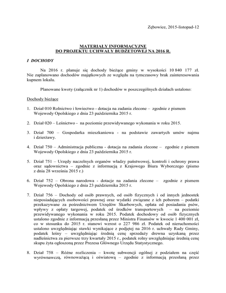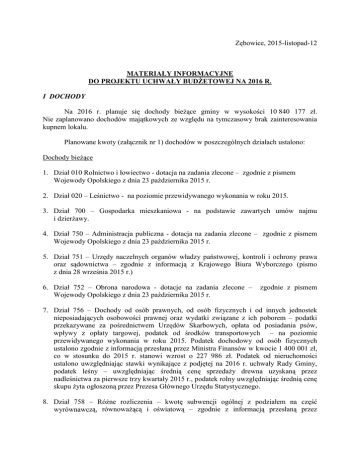 Zębowice, 2015-listopad-12 MATERIAŁY INFORMACYJNE DO PROJEKTU UCHWAŁY BUDŻETOWEJ NA 2016 R. I DOCHODY Na 2016 r. planuje się dochody bieżące gminy w wysokości 10 840 177 zł. Nie zaplanowano dochodów majątkowych ze względu na tymczasowy brak zainteresowania kupnem lokalu. Planowane kwoty (załącznik nr 1) dochodów w poszczególnych działach ustalono: Dochody bieżące 1. Dział 010 Rolnictwo i łowiectwo - dotacja na zadania zlecone – zgodnie z pismem Wojewody Opolskiego z dnia 23 października 2015 r. 2. Dział 020 – Leśnictwo - na poziomie przewidywanego wykonania w roku 2015. 3. Dział 700 – Gospodarka mieszkaniowa - na podstawie zawartych umów najmu i dzierżawy. 4. Dział 750 – Administracja publiczna - dotacja na zadania zlecone – zgodnie z pismem Wojewody Opolskiego z dnia 23 października 2015 r. 5. Dział 751 – Urzędy naczelnych organów władzy państwowej, kontroli i ochrony prawa oraz sądownictwa – zgodnie z informacją z Krajowego Biura Wyborczego (pismo z dnia 28 września 2015 r.) 6. Dział 752 – Obrona narodowa - dotacje na zadania zlecone – Wojewody Opolskiego z dnia 23 października 2015 r. zgodnie z pismem 7. Dział 756 – Dochody od osób prawnych, od osób fizycznych i od innych jednostek nieposiadających osobowości prawnej oraz wydatki związane z ich poborem – podatki przekazywane za pośrednictwem Urzędów Skarbowych, opłata od posiadania psów, wpływy z opłaty targowej, podatek od środków transportowych – na poziomie przewidywanego wykonania w roku 2015. Podatek dochodowy od osób fizycznych ustalono zgodnie z informacją przesłaną przez Ministra Finansów w kwocie 1 400 001 zł, co w stosunku do 2015 r. stanowi wzrost o 227 986 zł. Podatek od nieruchomości ustalono uwzględniając stawki wynikające z podjętej na 2016 r. uchwały Rady Gminy, podatek leśny – uwzględniając średnią cenę sprzedaży drewna uzyskaną przez nadleśnictwa za pierwsze trzy kwartały 2015 r., podatek rolny uwzględniając średnią cenę skupu żyta ogłoszoną przez Prezesa Głównego Urzędu Statystycznego. 8. Dział 758 – Różne rozliczenia – kwotę subwencji ogólnej z podziałem na część wyrównawczą, równoważącą i oświatową – zgodnie z informacją przesłaną przez 2 Ministra Finansów z dnia 12 października 2015 r. W porównaniu do 2015 r. wysokość poszczególnych rodzajów subwencji przedstawia się następująco: Subwencja część oświatowa część ogólna część równoważąca 2015 r. 2 873 687 2 948 915 153 356 2016 r. 2 948 897 3 014 900 127 772 Różnica + 75 210 + 65 985 - 25 584 W rozdziale 75814 – Różne rozliczenia finansowe, zaplanowano zwrot podatku VAT - odliczanie podatku od wydatków ogólnych związanych z funkcjonowaniem budynku Urzędu Gminy przy zastosowaniu współczynnika VAT oraz odliczając podatek od wydatków bieżących, ponoszonych na Ośrodek Zdrowia. 9. Dział 801 – Oświata i wychowanie – zgodnie ze złożonymi przez jednostki oświatowe projektami planu dochodów, a w przypadku dotacji na realizację zadań własnych w zakresie wychowania przedszkolnego szacunkowo na podstawie liczby dzieci. 10. Dział 851 – Ochrona zdrowia – na poziomie przewidywanego wykonania w roku 2015. 11. Dział 852 – Pomoc społeczna – dotacje na zadania zlecone i własne – zgodnie z pismem Wojewody Opolskiego z dnia 23 października 2015 r. 12. Dział 900 – Gospodarka komunalna i ochrona środowiska – na poziomie przewidywanego wykonania w roku 2014 zgodnie ze złożonymi deklaracjami o wysokości za gospodarowanie odpadami komunalnymi przez właścicieli nieruchomości zlokalizowanych na terenie gminy. II WYDATKI Na 2016 r. planuje się wydatki gminy w wysokości 9 950 177 zł, w tym – wydatki bieżące w kwocie 8 708 177 zł i wydatki majątkowe w kwocie 1 242 000 zł. Planowane kwoty wydatków (załącznik nr 2) w poszczególnych działach ustalono następująco: 1. Dział 010 – Rolnictwo i łowiectwo Z tytułu obligatoryjnej składki na rzecz Izby Rolniczej w Opolu zaplanowano kwotę 6 000 zł. Ujęto również środki na zadania zlecone w wysokości zgodnej z otrzymaną informacją z Wydziału Finansów i Budżetu Opolskiego Urzędu Wojewódzkiego. 2. Dział 600 – Transport i łączność Zaplanowano wydatki bieżące na poziomie szacunkowego wykonania za 2015 r. z uwzględnieniem wydatków sołectw. 3. Dział 700 – Gospodarka gruntami i nieruchomościami Na utrzymanie mieszkań i lokali komunalnych zaplanowano wydatki bieżące na poziomie szacunkowego wykonania za 2015 r. uwzględniając również wydatki sołectw. 3 4. Dział 710 – Plany zagospodarowania przestrzennego Zabezpieczono środki na sporządzenie zmiany studium uwarunkowań i kierunków zagospodarowania przestrzennego Gminy Zębowice. 5. Dział 750 – Administracja publiczna W dziale tym zabezpieczono środki na bieżące utrzymanie administracji oraz środki na diety dla sołtysów. Ujęto również środki na zadania zlecone w wysokości zgodnej z otrzymaną informacją z Wydziału Finansów i Budżetu Opolskiego Urzędu Wojewódzkiego. 6. Dział 751 – Urzędy naczelnych organów władzy państwowej, kontroli i ochrony prawa Ujęto środki na zadania zlecone w wysokości zgodnej z otrzymaną informacją z Krajowego Biura Wyborczego Delegatury w Opolu. 7. Dział 752 – Obrona narodowa Ujęto środki na zadania zlecone w wysokości zgodnej z otrzymaną informacją z Wydziału Finansów i Budżetu Opolskiego Urzędu Wojewódzkiego. 8. Dział 754 – Bezpieczeństwo publiczne i ochrona przeciwpożarowa Zaplanowano wydatki bieżące na poziomie szacunkowego wykonania za 2015 r. nie uwzględniając żadnych dodatkowych zakupów wyposażenia. Kwotę 11 117,27 zł przeznacza się na wydatki sołectw. Ujęto również środki na zadania zlecone w wysokości zgodnej z otrzymaną informacją z Wydziału Finansów i Budżetu Opolskiego Urzędu Wojewódzkiego. 9. Dział 757 – Obsługa długu publ
