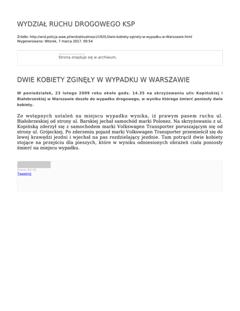 WYDZIAŁ RUCHU DROGOWEGO KSP Źródło: http://wrd.policja.waw.pl/wrd/aktualnosci/1920,Dwie-kobiety-zginely-w-wypadku-w-Warszawie.html Wygenerowano: Wtorek, 7 marca 2017, 00:54 Strona znajduje się w archiwum. DWIE KOBIETY ZGINĘŁY W WYPADKU W WARSZAWIE W poniedziałek, 23 lutego 2009 roku około godz. 14.35 na skrzyżowaniu ulic Kopińskiej i Białobrzeskiej w Warszawie doszło do wypadku drogowego, w wyniku którego śmierć poniosły dwie kobiety. Ze wstępnych ustaleń na miejscu wypadku wynika, iż prawym pasem ruchu ul. Białobrzeskiej od strony ul. Barskiej jechał samochód marki Polonez. Na skrzyżowaniu z ul. Kopińską zderzył się z samochodem marki Volkswagen Transporter poruszającym się od strony ul. Grójeckiej. Po zderzeniu pojazd marki Volkswagen Transporter przemieścił się do lewej krawędzi jezdni i wjechał na pas rozdzielający jezdnie. Tam potrącił dwie kobiety stojące na przejściu dla pieszych, które w wyniku odniesionych obrażeń ciała poniosły śmierć na miejscu wypadku. Ocena: 0/5 (0) Tweetnij