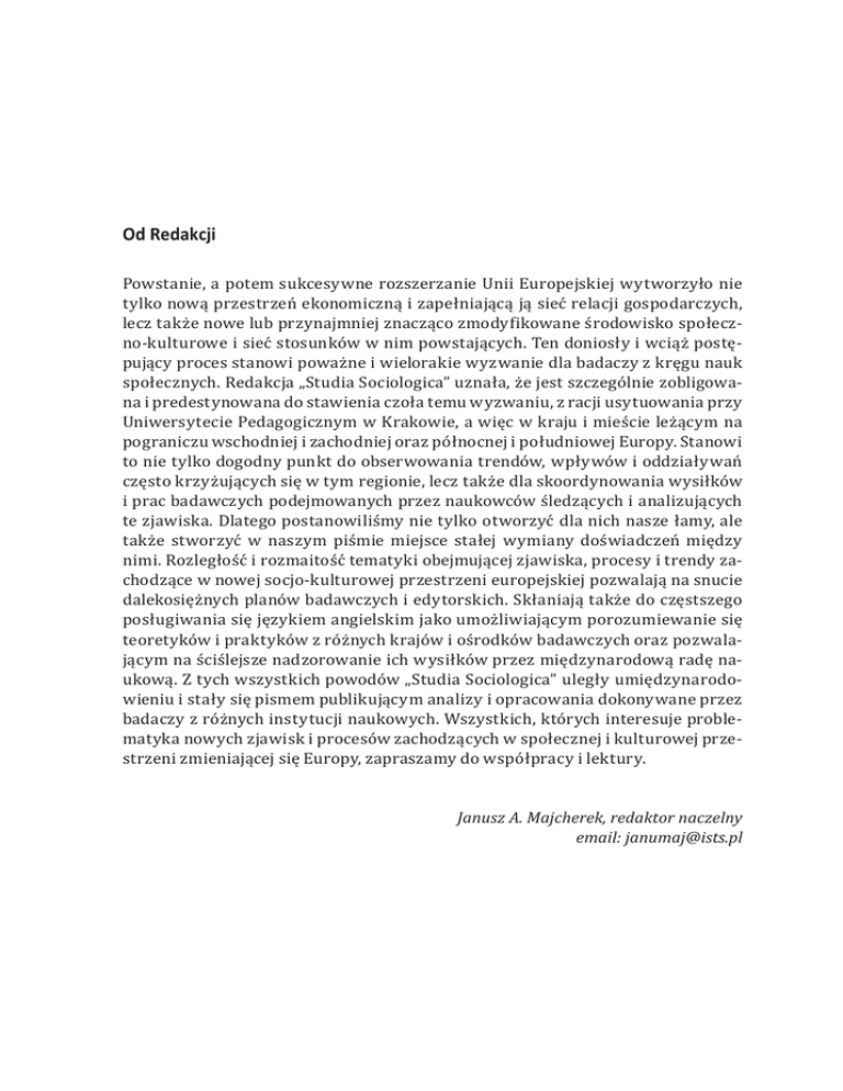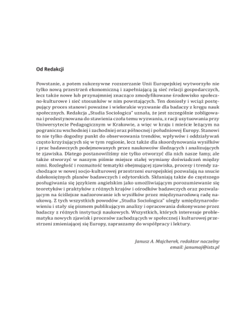 Od Redakcji Powstanie, a potem sukcesywne rozszerzanie Unii Europejskiej wytworzyło nie tylko nową przestrzeń ekonomiczną i zapełniającą ją sieć relacji gospodarczych, lecz także nowe lub przynajmniej znacząco zmodyfikowane środowisko społeczno-kulturowe i sieć stosunków w nim powstających. Ten doniosły i wciąż postępujący proces stanowi poważne i wielorakie wyzwanie dla badaczy z kręgu nauk społecznych. Redakcja „Studia Sociologica” uznała, że jest szczególnie zobligowana i predestynowana do stawienia czoła temu wyzwaniu, z racji usytuowania przy Uniwersytecie Pedagogicznym w Krakowie, a więc w kraju i mieście leżącym na pograniczu wschodniej i zachodniej oraz północnej i południowej Europy. Stanowi to nie tylko dogodny punkt do obserwowania trendów, wpływów i oddziaływań często krzyżujących się w tym regionie, lecz także dla skoordynowania wysiłków i prac badawczych podejmowanych przez naukowców śledzących i analizujących te zjawiska. Dlatego postanowiliśmy nie tylko otworzyć dla nich nasze łamy, ale także stworzyć w naszym piśmie miejsce stałej wymiany doświadczeń między nimi. Rozległość i rozmaitość tematyki obejmującej zjawiska, procesy i trendy zachodzące w nowej socjo-kulturowej przestrzeni europejskiej pozwalają na snucie dalekosiężnych planów badawczych i edytorskich. Skłaniają także do częstszego posługiwania się językiem angielskim jako umożliwiającym porozumiewanie się teoretyków i praktyków z różnych krajów i ośrodków badawczych oraz pozwalającym na ściślejsze nadzorowanie ich wysiłków przez międzynarodową radę naukową. Z tych wszystkich powodów „Studia Sociologica” uległy umiędzynarodowieniu i stały się pismem publikującym analizy i opracowania dokonywane przez badaczy z różnych instytucji naukowych. Wszystkich, których interesuje problematyka nowych zjawisk i procesów zachodzących w społecznej i kulturowej przestrzeni zmieniającej się Europy, zapraszamy do współpracy i lektury. Janusz A. Majcherek, redaktor naczelny email: [email protected]